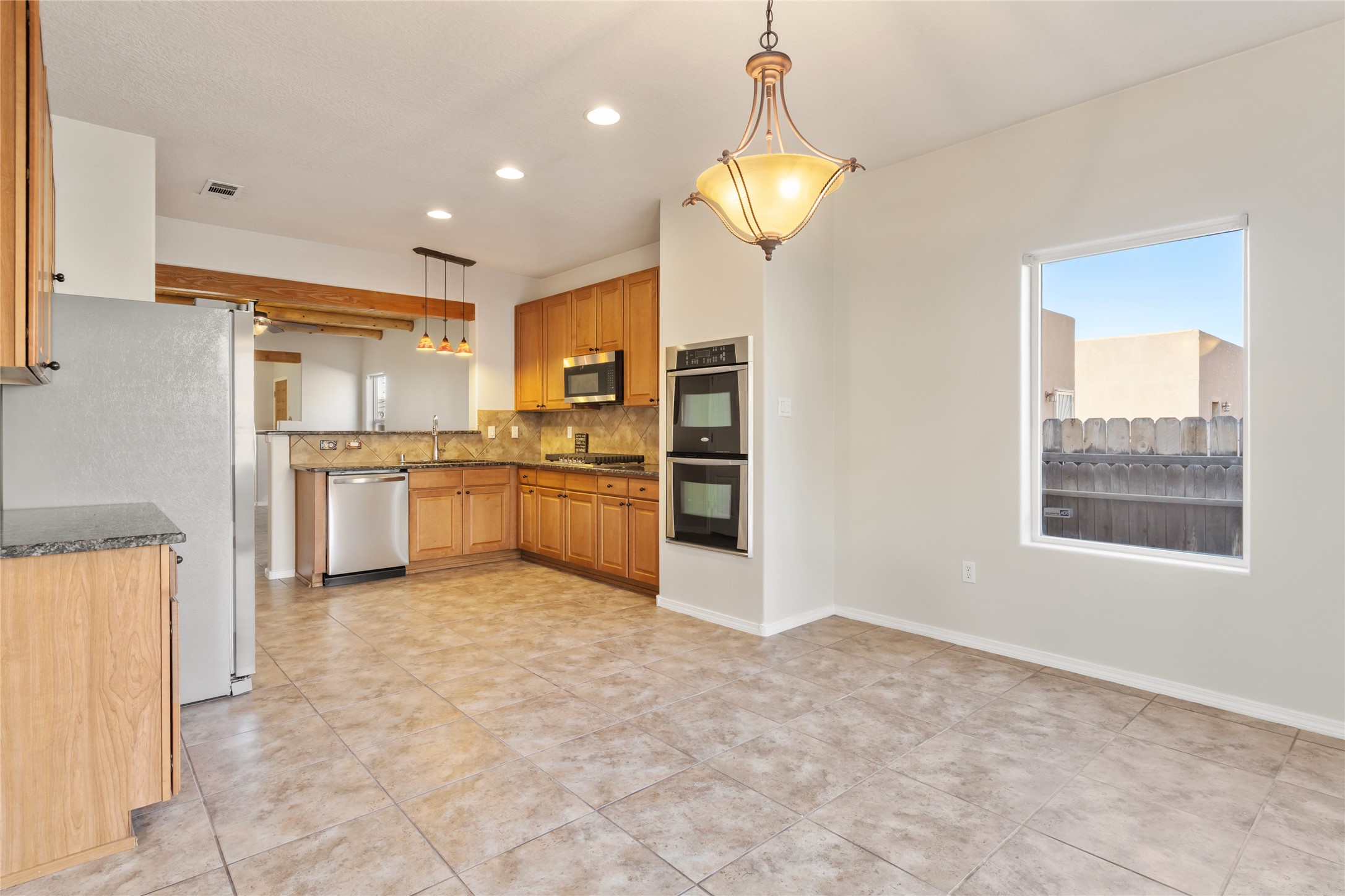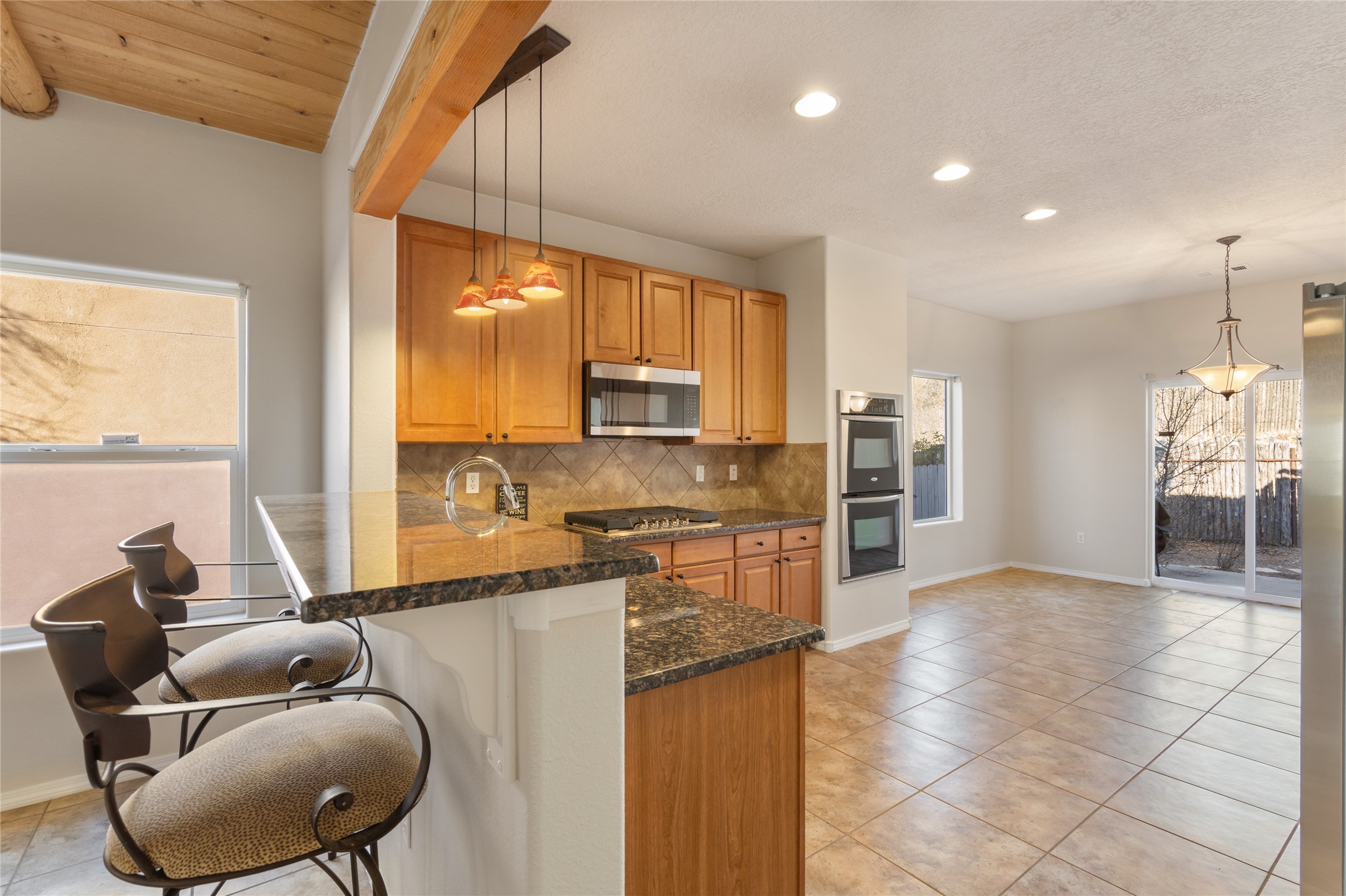 Welcome home to the desirable Villa Sonata neighborhood, where comfort and convenience come together just minutes from Santa Fe's Historic Plaza.Step inside to lofty ceilings that provide the Santa Fe charm with vigas and wood beams, and a warm gas fireplace anchoring the living room, creating an inviting space ideal for both everyday living and entertaining. The open-concept floor plan seamlessly connects the living, dining, and kitchen areas, providing a bright and flexible layout that is perfect for hosting friends and family.This spacious 2-bedroom, 2-bath residence also includes a versatile flex space that can serve as a home gym, media room, office, or potential third bedroom. The kitchen is equipped with new stainless steel appliances, including a gas range, built-in microwave, dishwasher, refrigerator, and double built-in ovens.Additional features include central air conditioning, tile flooring throughout the main living areas, brand-new carpet in the bedrooms, and a new Samsung washer and dryer.The primary suite offers a generous walk-in closet, soaking tub, and step-in shower. Outdoors, enjoy a private back patio and enclosed backyard--ideal for pets, gardening, or relaxing in Santa Fe's beautiful climate.A two-car garage and a new TPO roof with a warranty provide peace of mind and long-term value.Located just moments from coffee shops, Trader Joe's, Whole Foods, acclaimed restaurants, and all the culture and charm of downtown Santa Fe, this home delivers the perfect balance of lifestyle and location.
