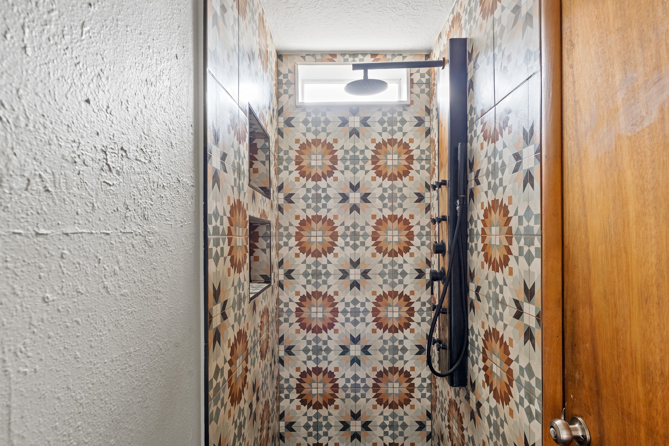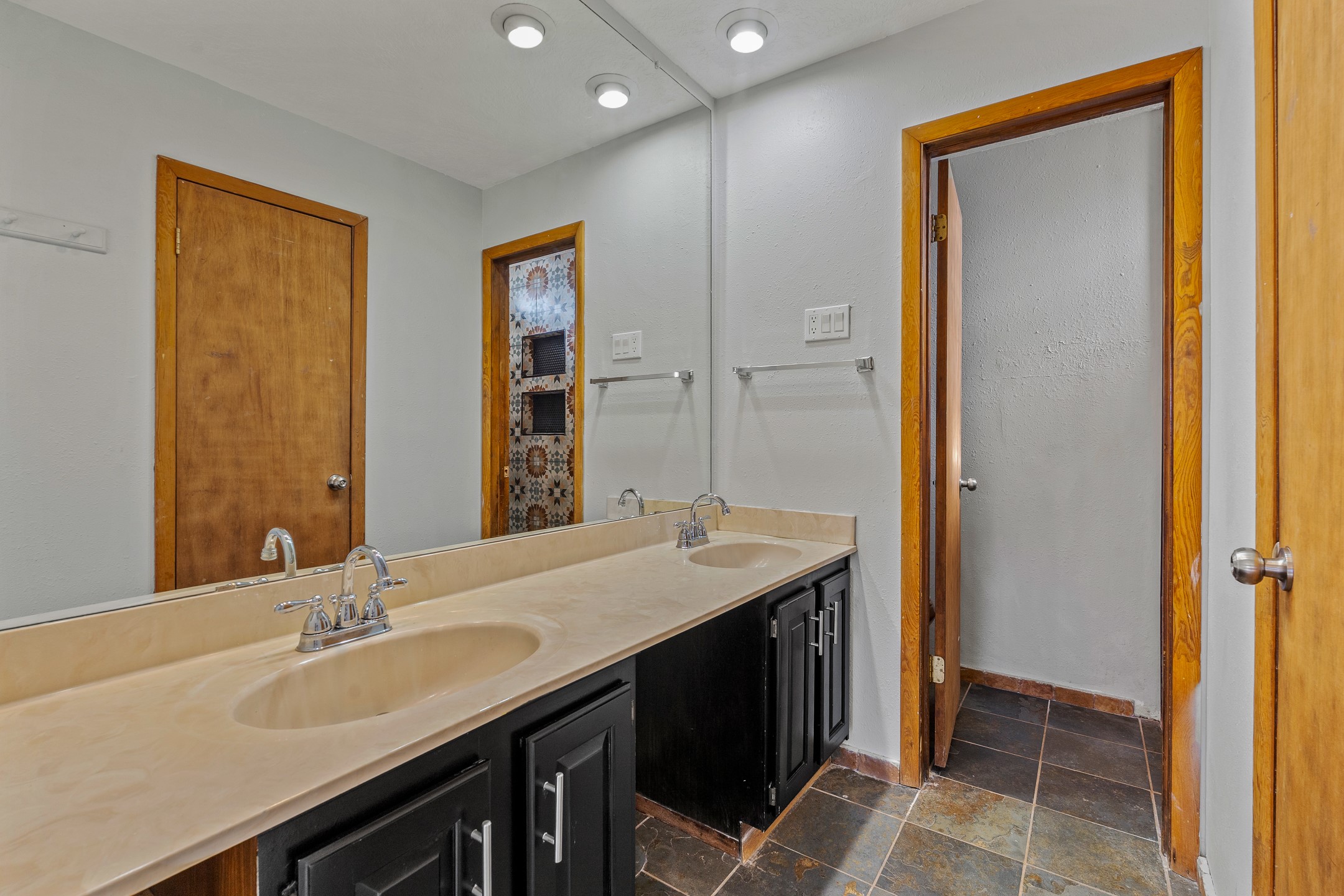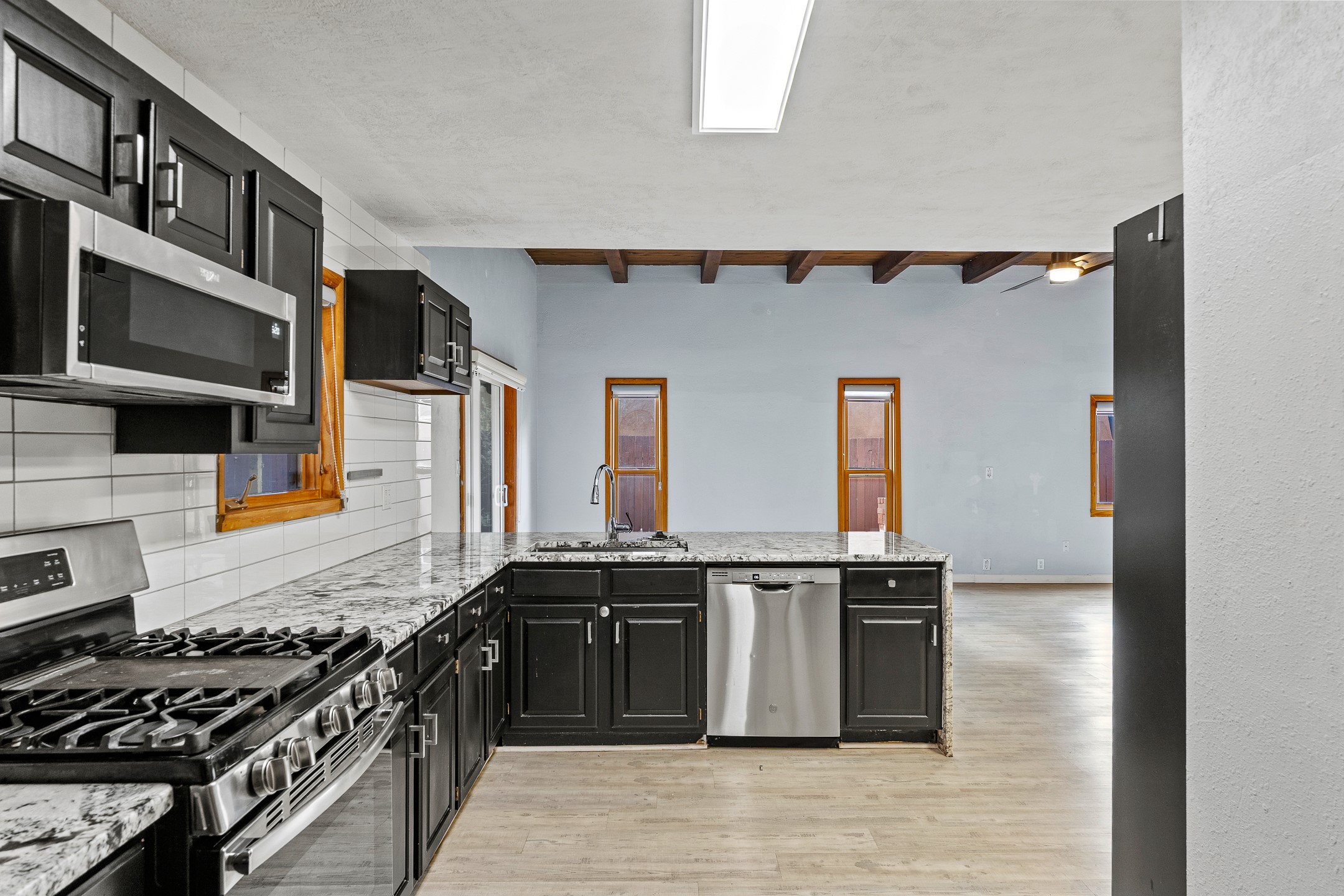 Ideally located just across from the Genoveva Chavez Center, this beautifully updated single-level home offers unbeatableconvenience with quick access to downtown Santa Fe and easy access to shopping, schools, including zoning in Pion Elementary school and everything the city has to offer. Boasting 1,794 sq ft, this thoughtfully designed 3-bedroom, 2-bath home features a modern open-concept layout perfect for comfortable living and effortless entertaining. The updated kitchen is a true showstopper, showcasing elegant waterfall granite countertops, a coordinating backsplash, and ample space for both counter seating and a dining table. The spacious living room is the heart of the home, offering soaring ceilings adorned with rich wood beams and tongue-and-groove detail, a cozy wood-burning fireplace, and a seamless flow. A sliding glass door opens to your private backyard retreat--perfect for indoor-outdoor living. Step outside to discover an enclosed, landscaped yard with mature gardens, a large covered portal ideal for year-round enjoyment, and exquisite hand-carved stonework throughout both the front and back yards. Additional highlights include a versatile mudroom/storage space/office or studio with direct outdoor access. This Santa Fe treasure blends timeless charm with modern updates in a location that truly can't be beat. Comeexperience it for yourself!