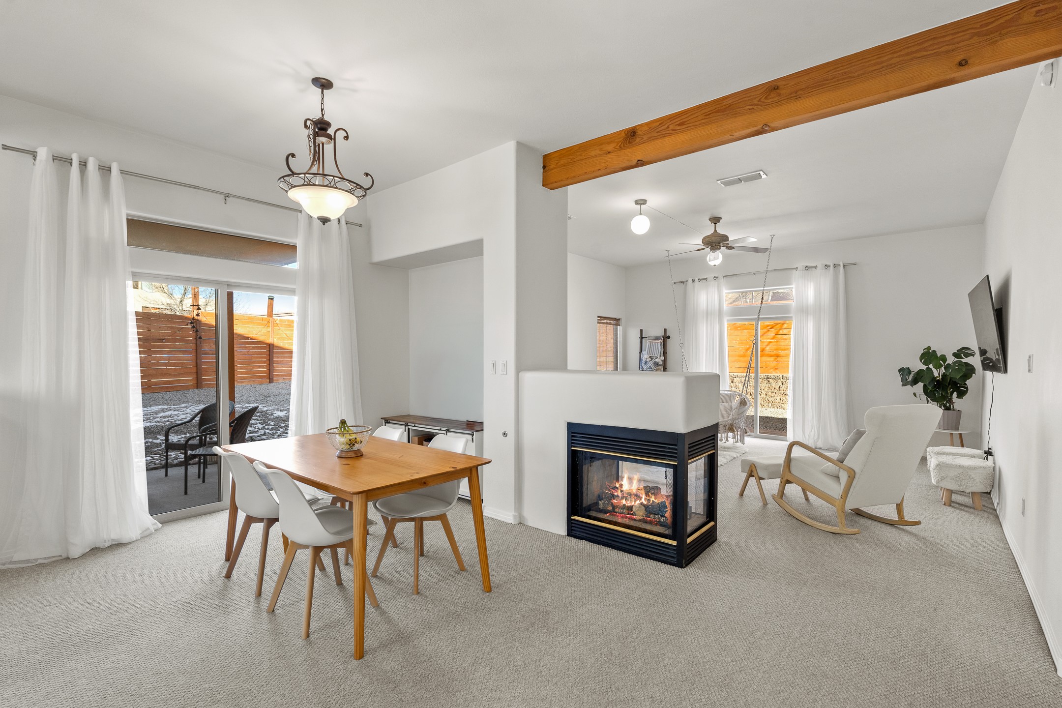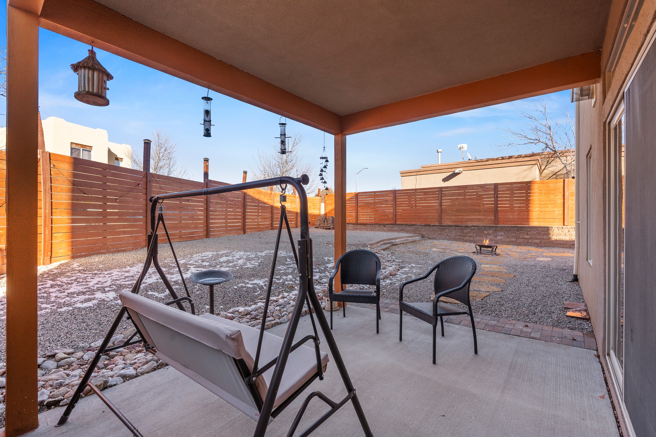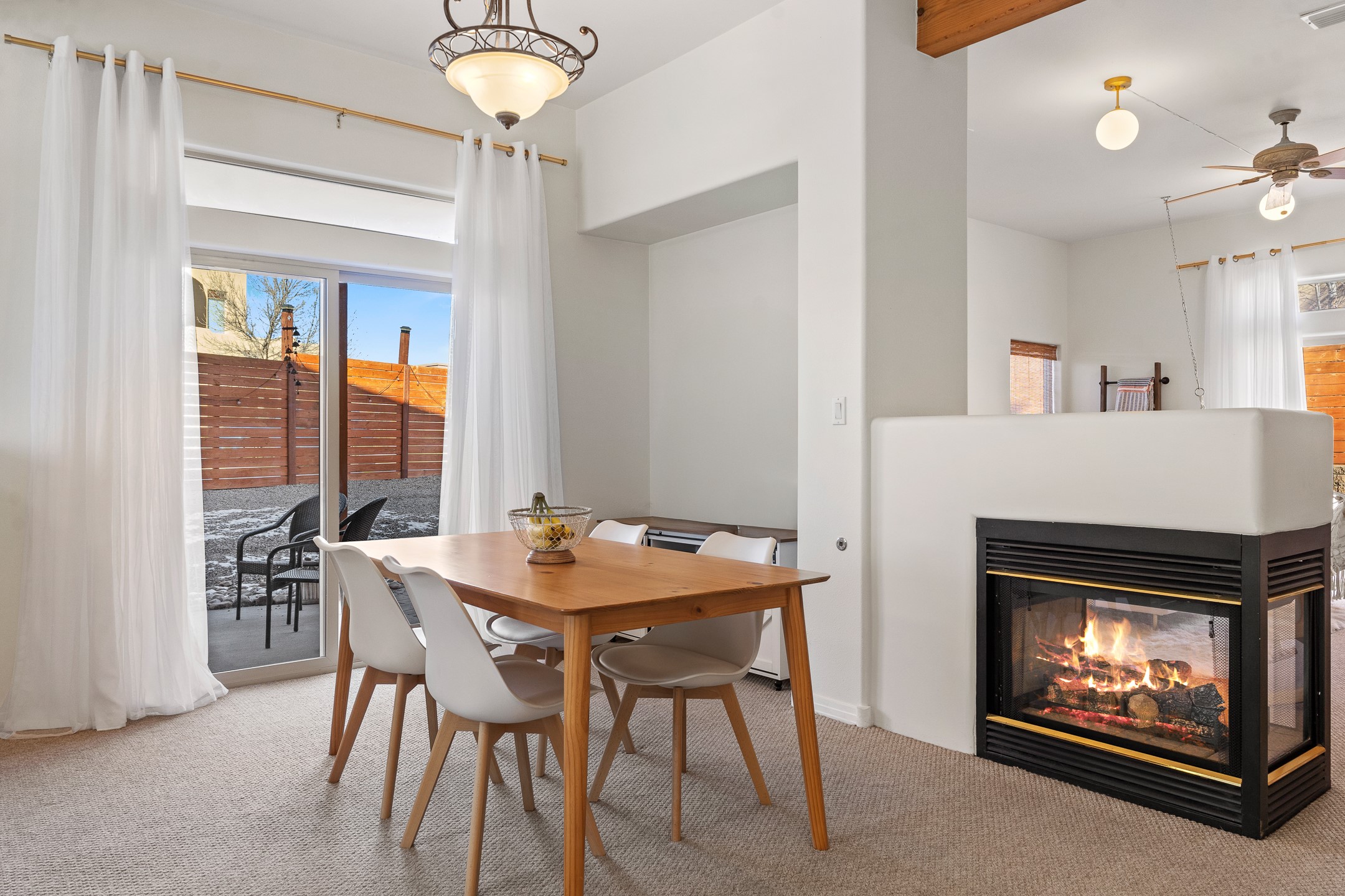 Set on a prime corner lot in one of the area's most desirable neighborhoods, this beautifully maintained home offers an exceptional blend of space, comfort, and Santa Fe living--with no HOA dues. Conveniently located near schools, parks, and community amenities, it's ideal for both growing households and those seeking an established, welcoming setting. The 1,856-square-foot two-story residence features 3 bedrooms, 2.5 baths, and a 2-car garage. Inside, soaring ceilings and abundant natural light create an immediate sense of openness. The spacious kitchen is well designed for daily living and entertaining, with generous counter space, a gas range, and easy flow to the dining area. Sliding doors lead to a large, fenced large backyard--perfect for outdoor dining, gardening, play, or relaxed gatherings. The inviting living room is anchored by a striking two-sided gas fireplace and enhanced by soft window treatments that add warmth and elegance. The main level also includes a convenient powder room, a generous laundry room with direct backyard access, and ample storage. The attached two-car garage offers space for vehicles, gear, and storage. Upstairs, three light-filled bedrooms provide comfort and privacy. The primary suite enjoys views of the Sangre de Cristo Mountains and features an en-suite bath with dual vanities, soaking tub, and walk-in shower. Two additional bedrooms share a well-appointed hall bath, ideal for guests, family, or a home office. An expansive upper-level deck is a true highlight--perfect for morning coffee, sunset skies, and Santa Fe's star-filled nights. Move-in ready and thoughtfully designed, 4615 Sunset Ridge offers generous indoor-outdoor living in a sought-after location. 4615 Sunset Ridge belongs on your must-see list.
