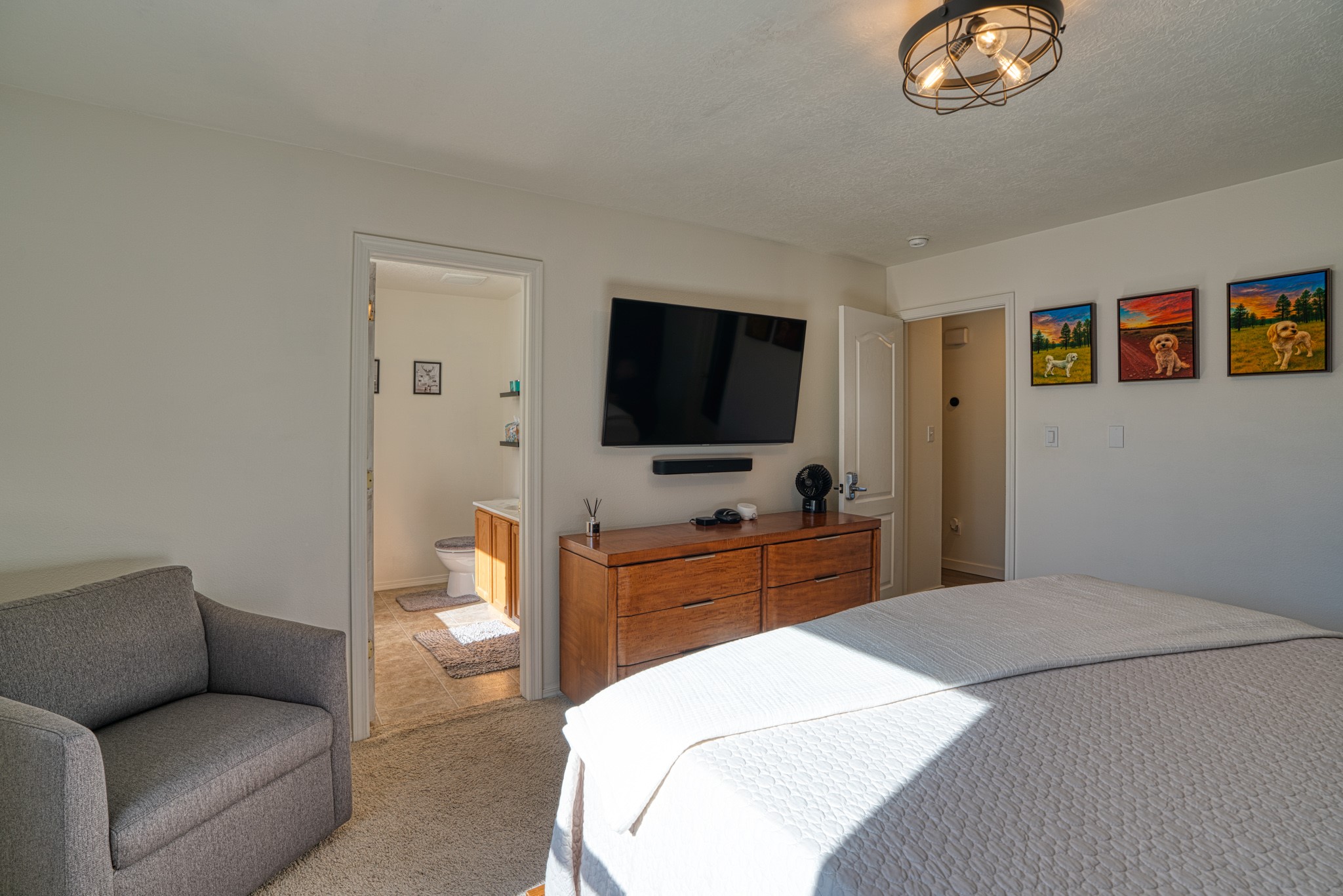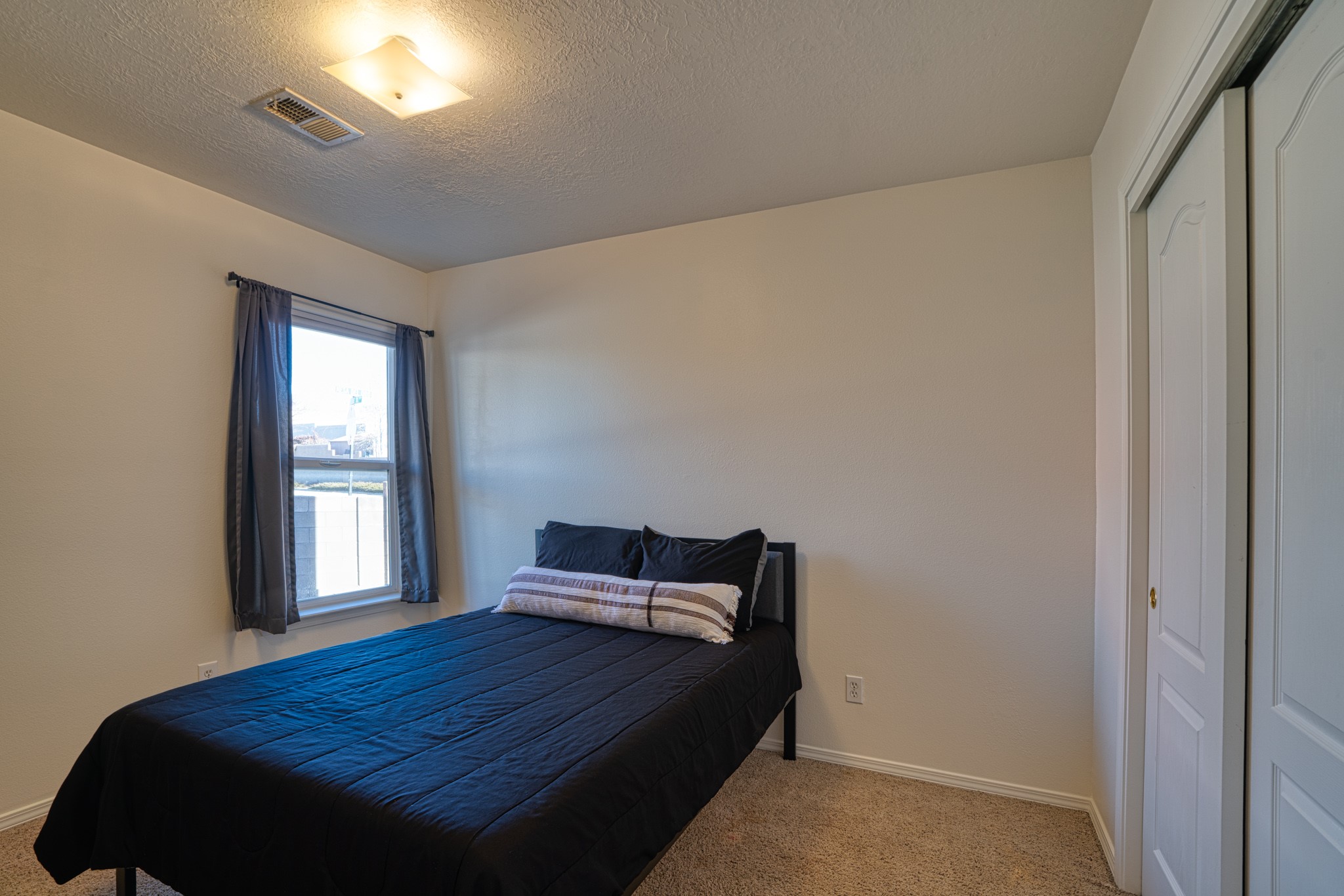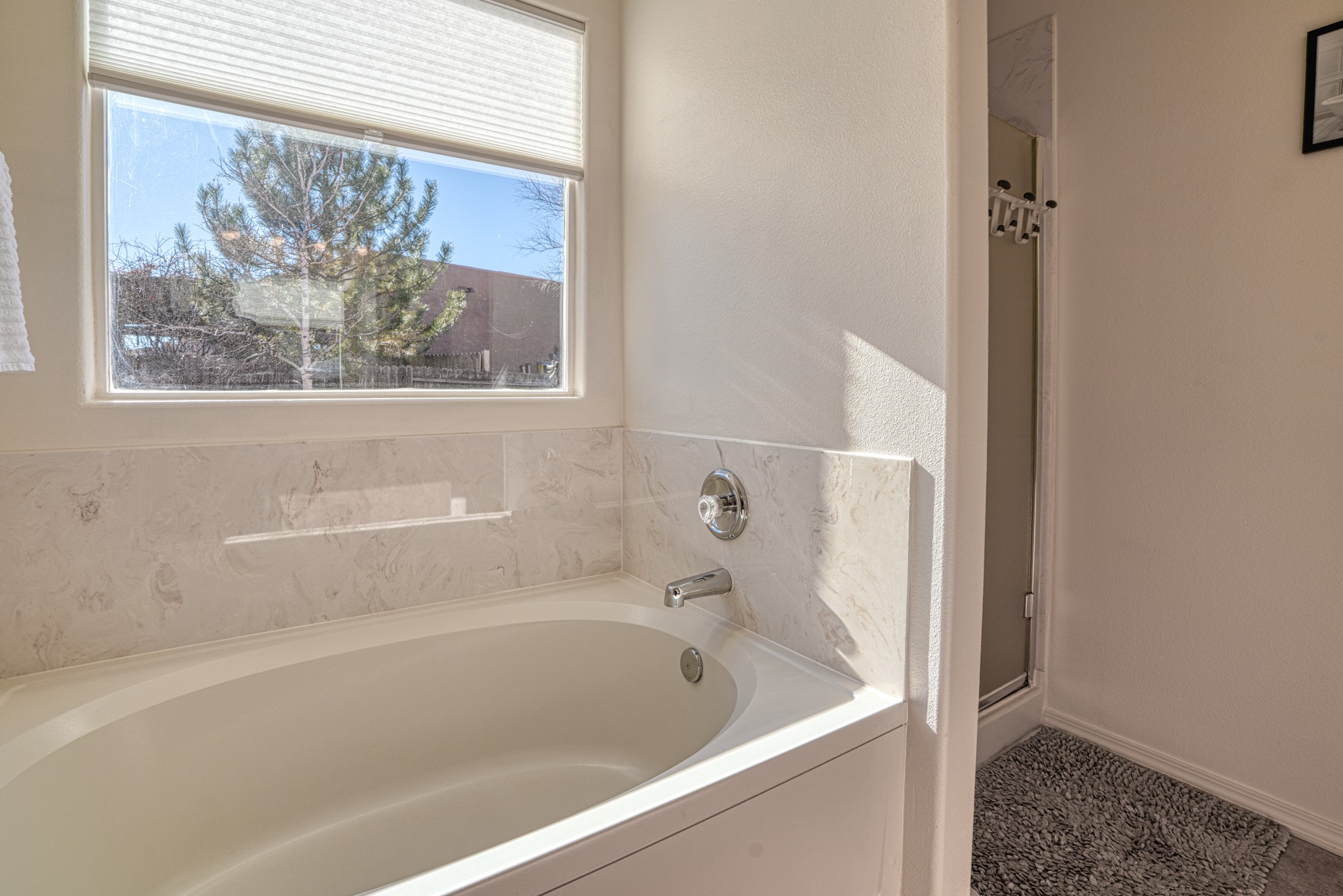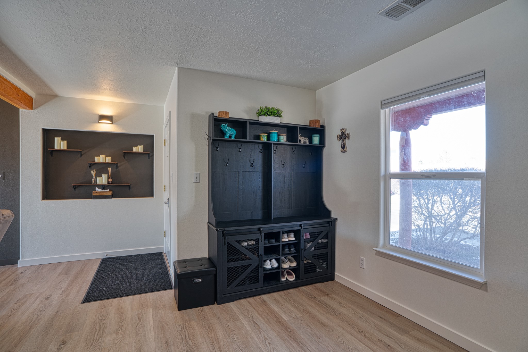Discover this beautifully updated single-level home situated on a spacious corner lot, featuring 3 bedrooms, 2 bathrooms, a 2-car garage & 1,601 sqft of comfortable living space. This move-in-ready property showcases modern upgrades and timeless charm throughout. Recent improvements include a new TPO roof (OCTOBER 2024) and new stucco (2025), complemented by upgraded flooring, baseboards, recessed lighting, stylish ceiling fans, and freshly painted cabinetry. The living area offers tongue-and-groove ceiling with exposed vigas and beams, creating warmth and architectural character. The primary suite features a custom closet system with built-in drawers and shelving, an elegant accent wall, double vanity, garden tub, and standalone shower. Step outside and enjoy the covered/open flagstone patio space, a fully fenced yard, and a 10'x8' storage shed for added convenience. The oversized lot offers extra parking for convenience!