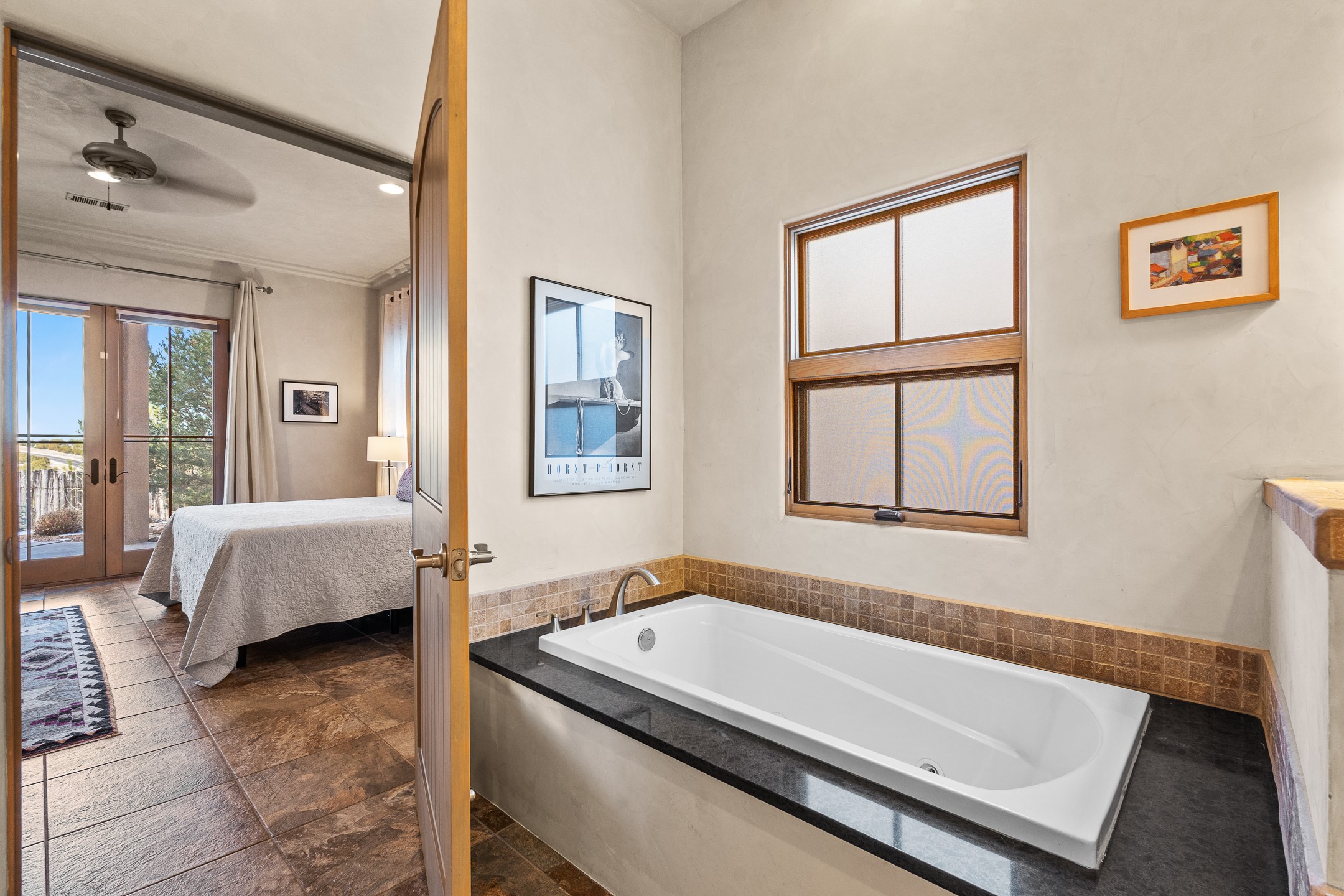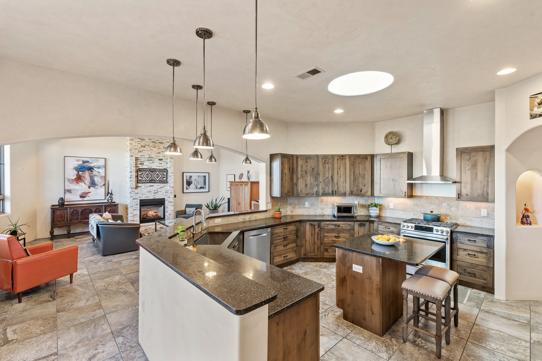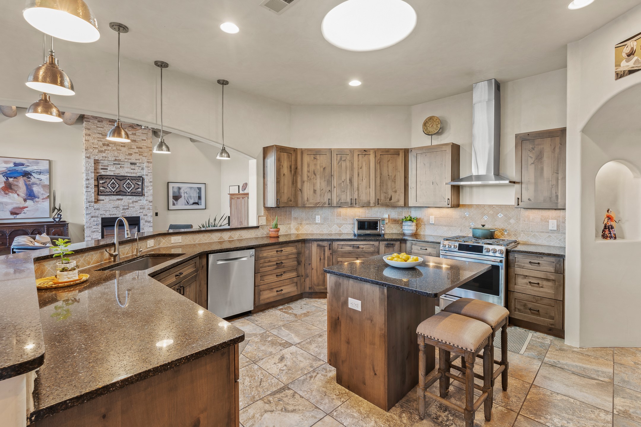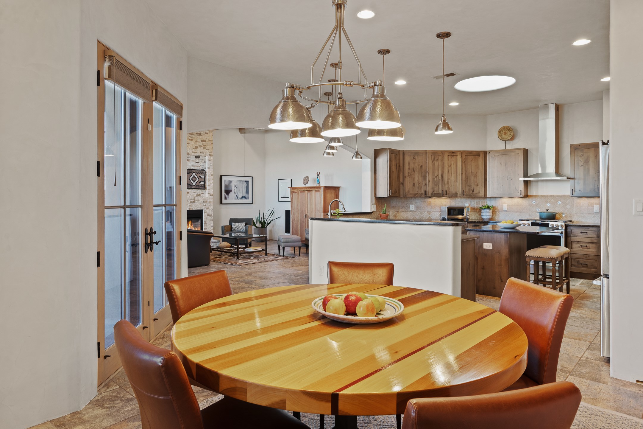 Sophisticated soft-contemporary living awaits in this beautifully designed single-level home, ideally situated on a desirable corner lot in the vibrant community of Aldea de Santa Fe. Built in 2014, this thoughtfully planned residence offers approximately 2,743 square feet of elegant living space, including three bedrooms, three baths, and a two-car garage.The well-designed floor plan provides excellent separation of spaces. A generous guest bedroom features an en-suite bath, while a versatile office or third bedroom includes a private exterior entrance--perfect for guests, creative pursuits, or a home office. Stone flooring throughout creates a clean, modern aesthetic, complemented by forced air heating and air conditioning for year-round comfort.The open-concept living, dining, and kitchen areas offer a seamless yet well-defined flow. The living room is highlighted by exposed beams, a gas fireplace, and tall windows that flood the space with natural light. The spacious kitchen is appointed with knotty alder cabinetry, extensive solid-surface countertops for food preparation, a stainless-steel range with exterior venting, a center island, and a built-in desk area--ideal for everyday living and entertaining.The primary suite serves as a serene retreat, featuring two spacious walk-in closets and a spa-inspired bath. Light-filled living and dining areas open effortlessly to the rear patio, where mature landscaping, and a charming peek-a-boo view of the Jemez Mountains create a tranquil outdoor setting for relaxation or gatherings.Aldea de Santa Fe is known for its village-style charm and active lifestyle, offering residents miles of walking trails, expansive shared open space, a community center, and tennis, basketball, and bocce courts. Annual art tours, community garage sales, and a variety of social clubs foster a welcoming and connected neighborhood atmosphere.This home presents a rare opportunity to enjoy refined comfort, thoughtful design, and a true sense of community--Santa Fe living at its best.