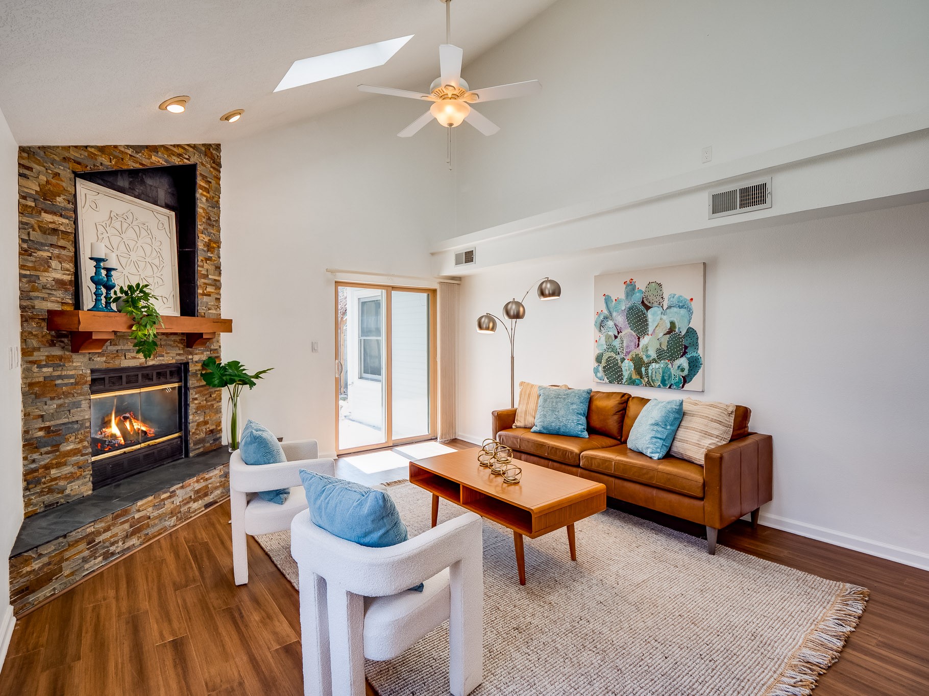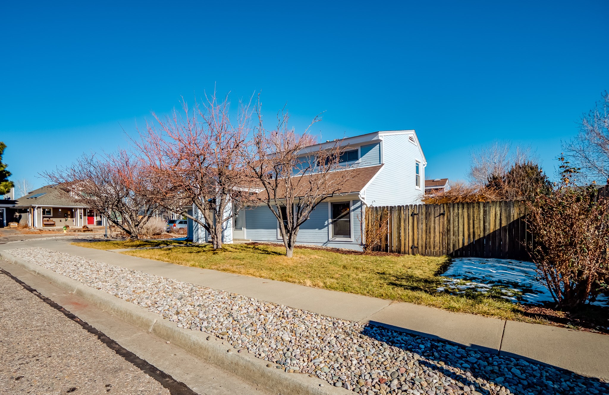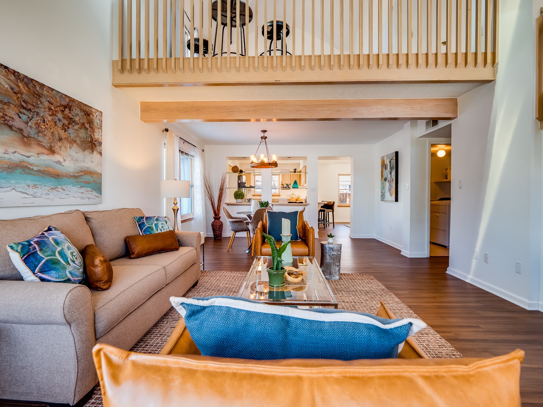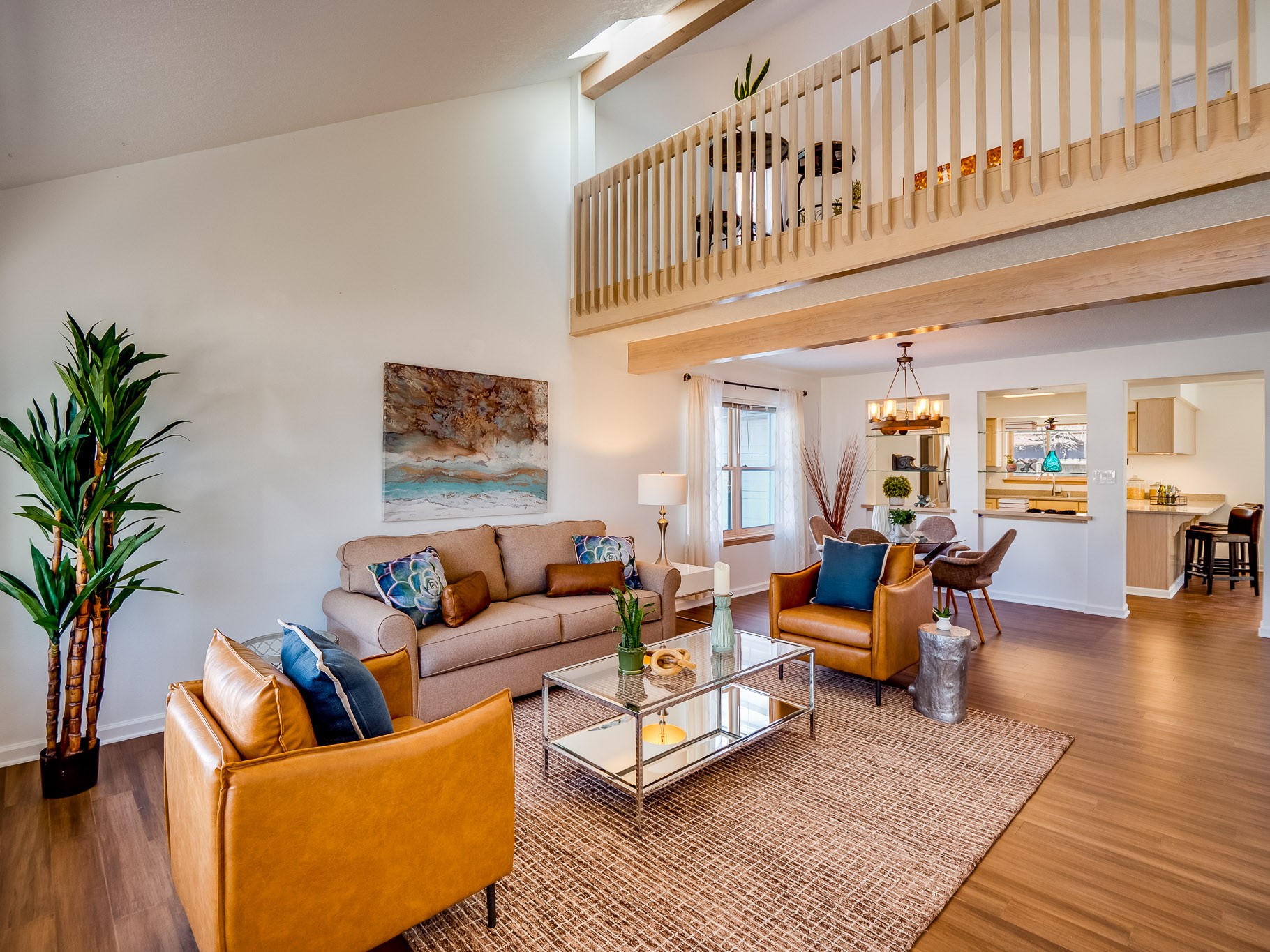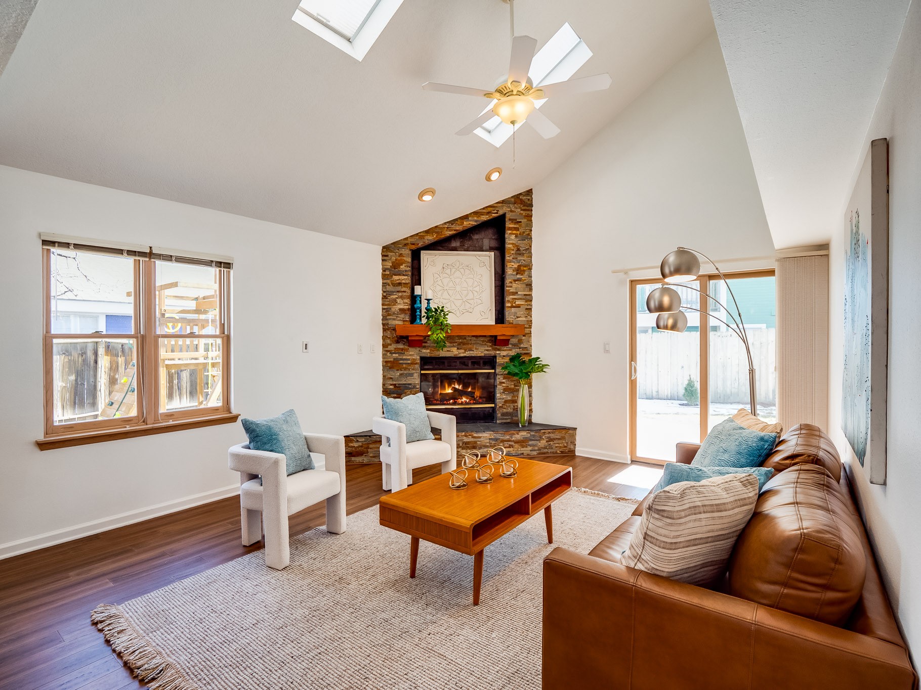 Situated on a desirable corner lot in North Mesa, this beautiful two-story home offers exceptional curb appeal with a large grassy front yard and mature trees lining the welcoming front entrance, providing shade as well as privacy. Step inside the foyer and descend a few steps into the bright, open living room, where rich engineered wood floors extend throughout the main living spaces. Vaulted ceilings enhance the sense of space and light, creating an inviting atmosphere ideal for both everyday living and entertaining. The living room flows seamlessly into the dining area, thoughtfully divided from the kitchen by open glass shelving that adds architectural interest while maintaining an open-concept feel. The kitchen has light colored cabinetry and abundant quartz counter space, including a peninsula island with bar seating. Stainless steel refrigerator and a gas oven/range, and there is convenient access to the oversized two-car garage. Adjacent to the kitchen, the family room features vaulted ceilings and a dramatic floor to ceiling stone wood burning fireplace, serving as a warm and striking focal point. From here, step outside to the covered deck overlooking the fully fenced backyard with mature trees, and ample space for gardening and outdoor dining. The main level also includes three nicely sized carpeted guest bedrooms, a guest bathroom with a walk-in tiled shower featuring a luxurious shower panel and single-sink vanity, along with a dedicated laundry room and additional storage closet. Upstairs, the home is fully carpeted and features a cozy loft perfect for relaxing or reading, as well as a versatile bonus room that could serve as a hobby space, office, or additional bedroom. Spacious primary en-suite bedroom with a large walk-in closet and a spa-like bathroom complete with a double-sink vanity, tile flooring, and a deep soaking tub. Located near parks, horse stables and trails, book your tour of this move-in ready home and experience what it has to offer!