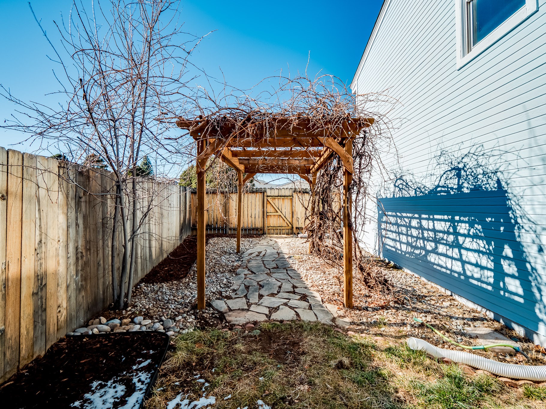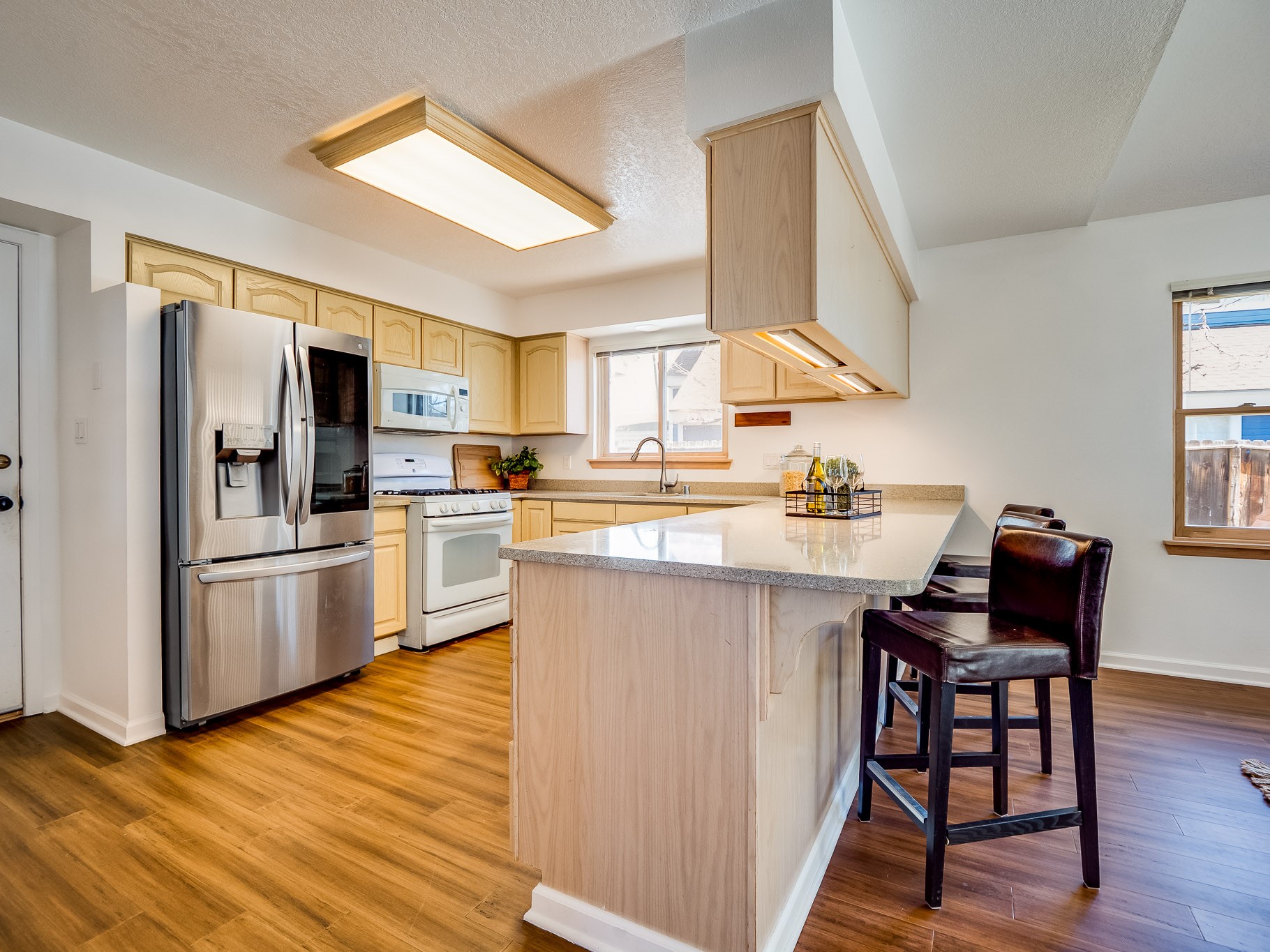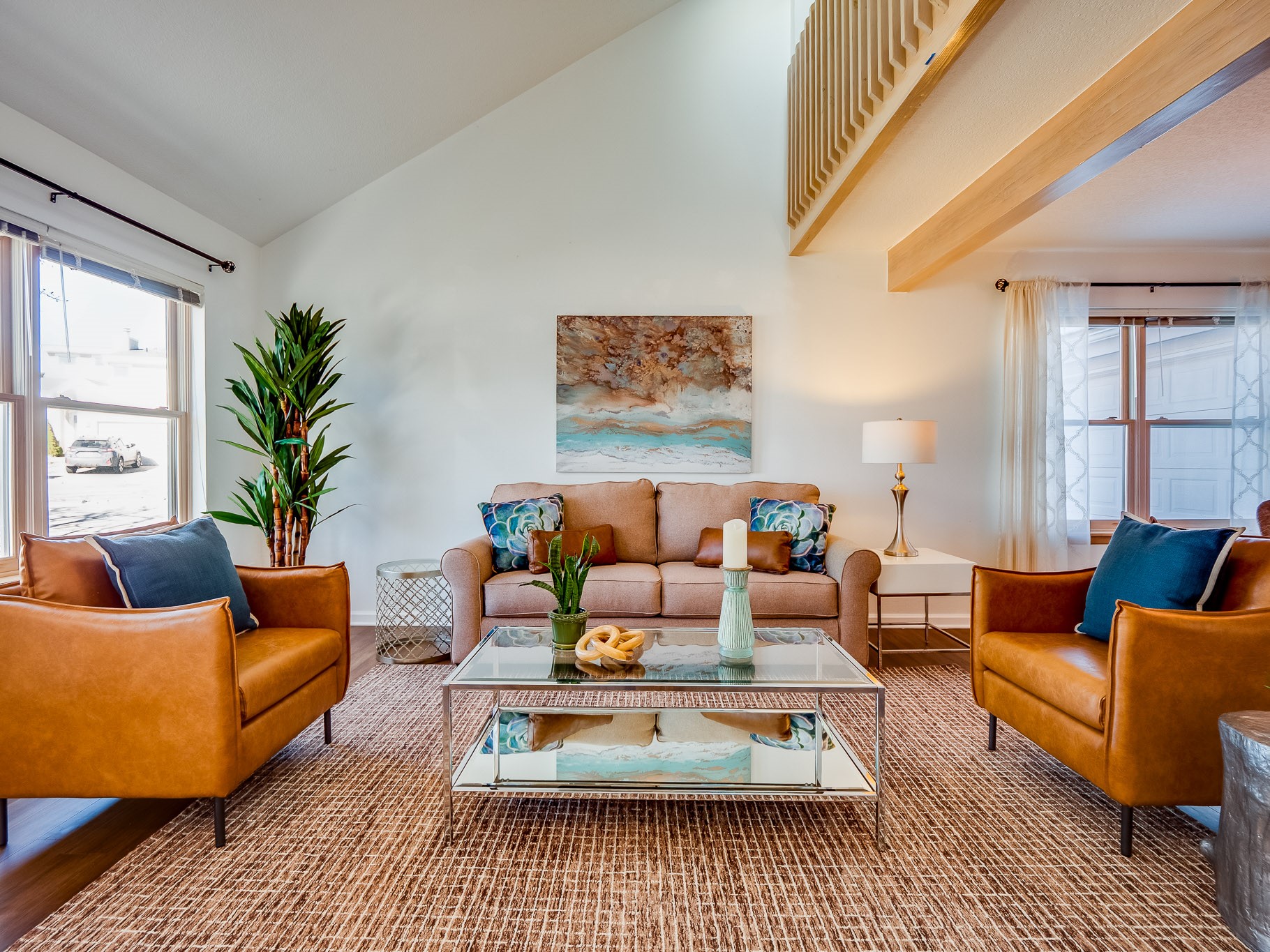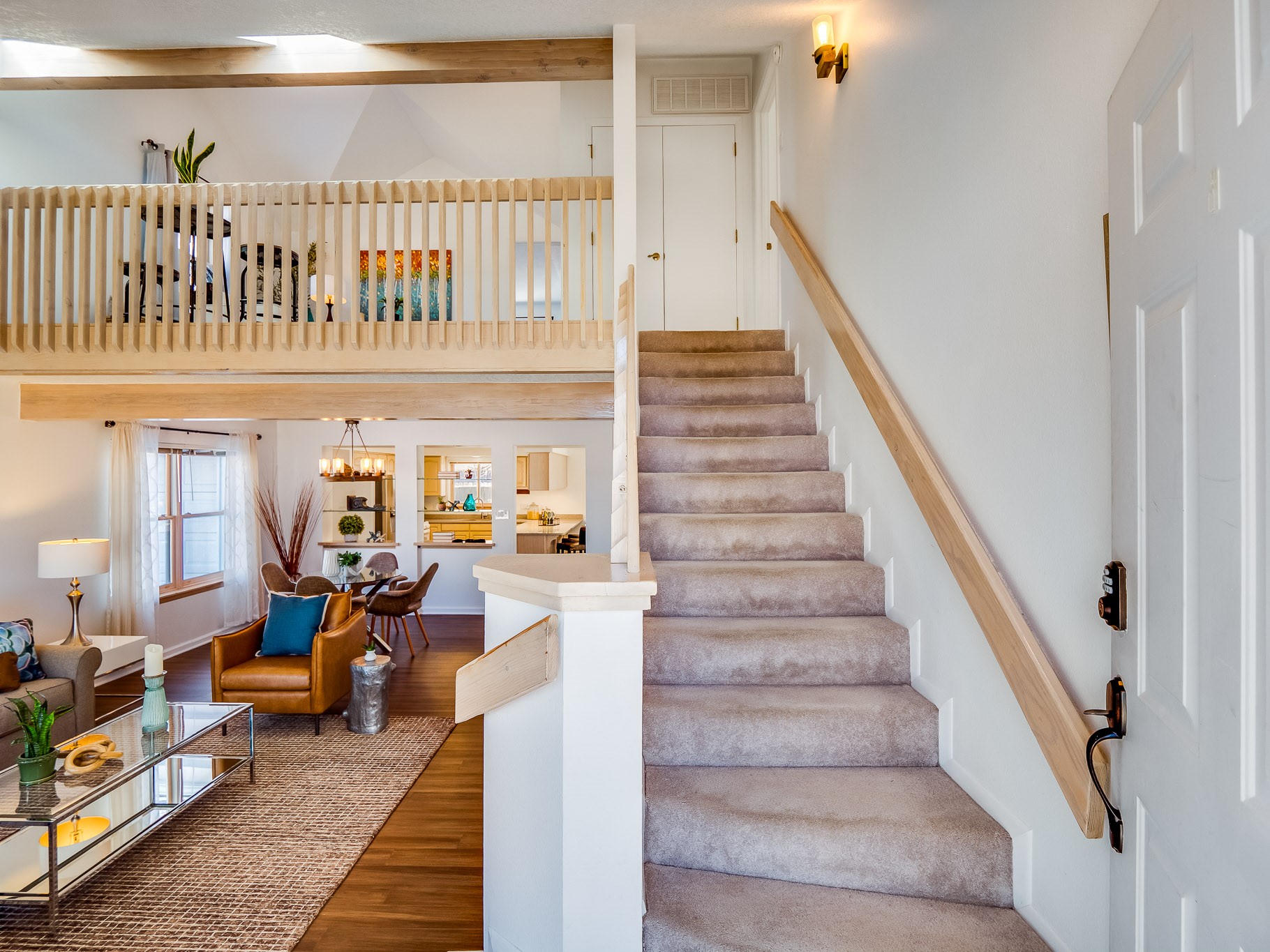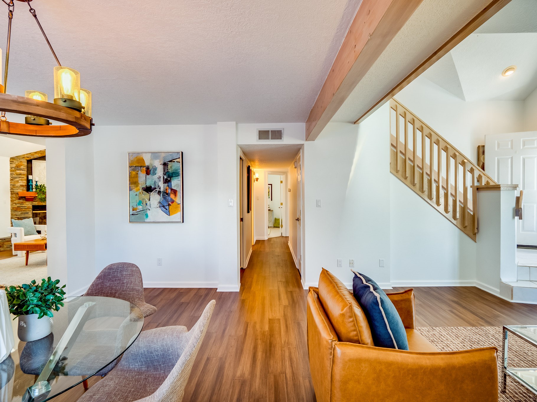 Situated on a desirable corner lot in North Mesa, this beautiful two-story home offers exceptional curb appeal with a large grassy front yard and mature trees lining the welcoming front entrance, providing shade as well as privacy. Step inside the foyer and descend a few steps into the bright, open living room, where rich engineered wood floors extend throughout the main living spaces. Vaulted ceilings enhance the sense of space and light, creating an inviting atmosphere ideal for both everyday living and entertaining. The living room flows seamlessly into the dining area, thoughtfully divided from the kitchen by open glass shelving that adds architectural interest while maintaining an open-concept feel. The kitchen has light colored cabinetry and abundant quartz counter space, including a peninsula island with bar seating. Stainless steel refrigerator and a gas oven/range, and there is convenient access to the oversized two-car garage. Adjacent to the kitchen, the family room features vaulted ceilings and a dramatic floor to ceiling stone wood burning fireplace, serving as a warm and striking focal point. From here, step outside to the covered deck overlooking the fully fenced backyard with mature trees, and ample space for gardening and outdoor dining. The main level also includes three nicely sized carpeted guest bedrooms, a guest bathroom with a walk-in tiled shower featuring a luxurious shower panel and single-sink vanity, along with a dedicated laundry room and additional storage closet. Upstairs, the home is fully carpeted and features a cozy loft perfect for relaxing or reading, as well as a versatile bonus room that could serve as a hobby space, office, or additional bedroom. Spacious primary en-suite bedroom with a large walk-in closet and a spa-like bathroom complete with a double-sink vanity, tile flooring, and a deep soaking tub. Located near parks, horse stables and trails, book your tour of this move-in ready home and experience what it has to offer!