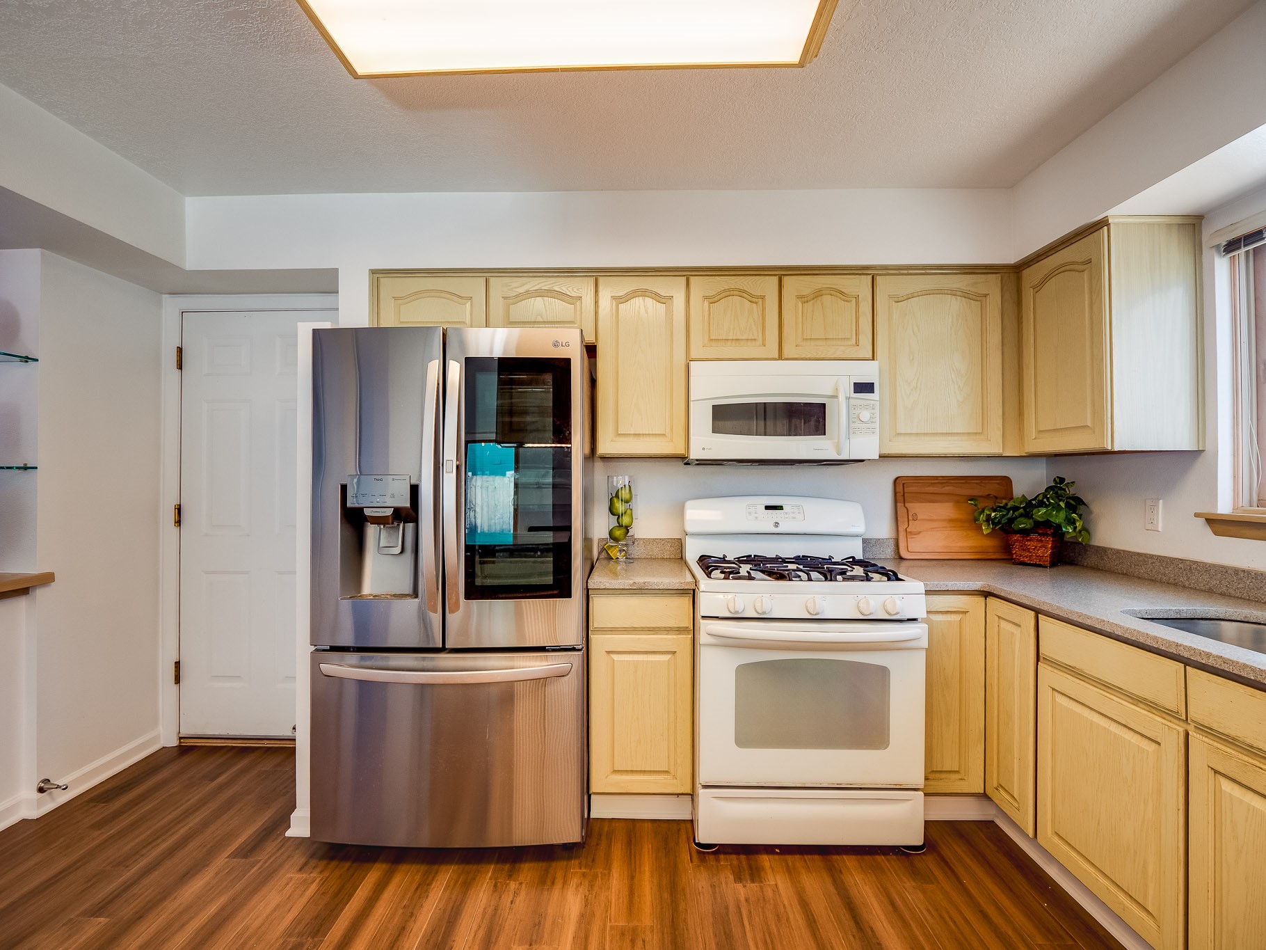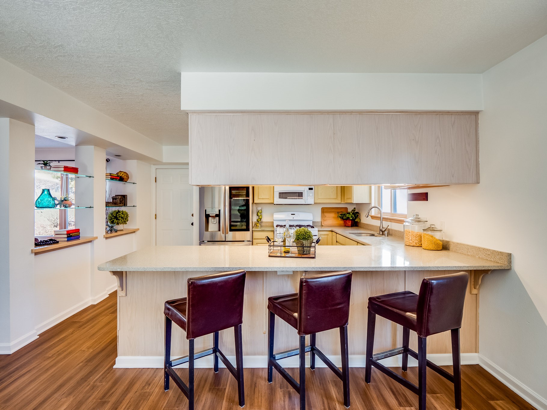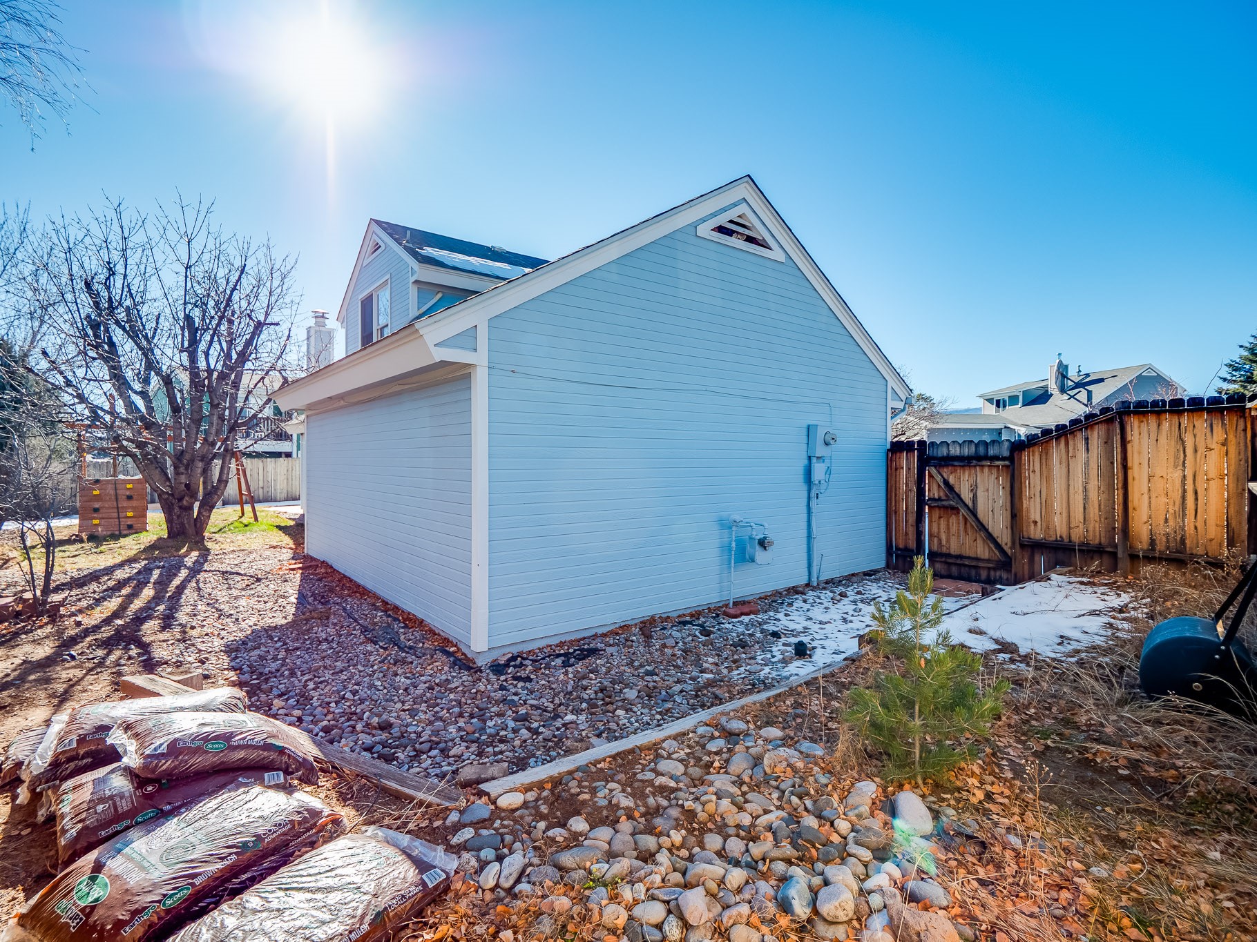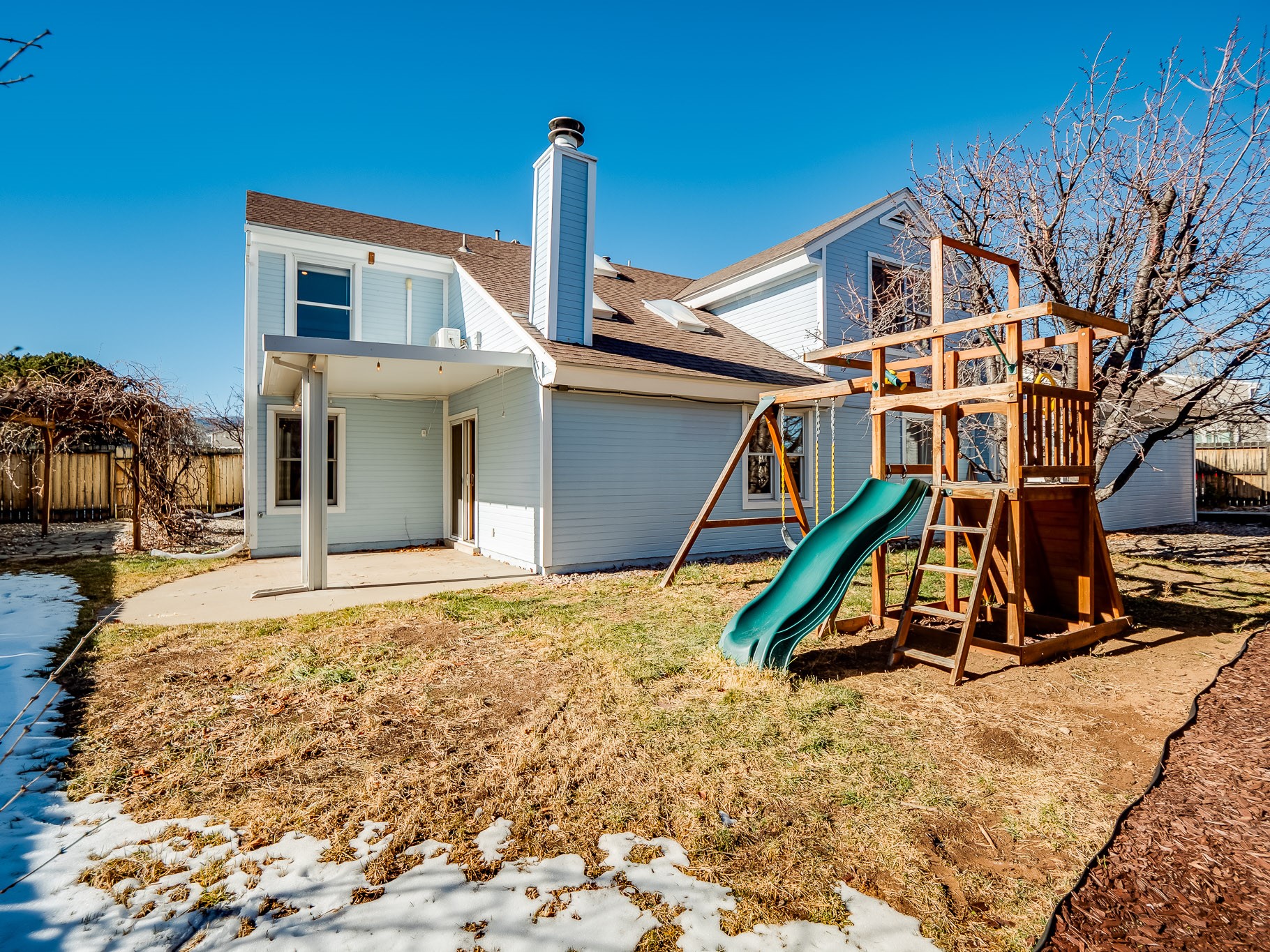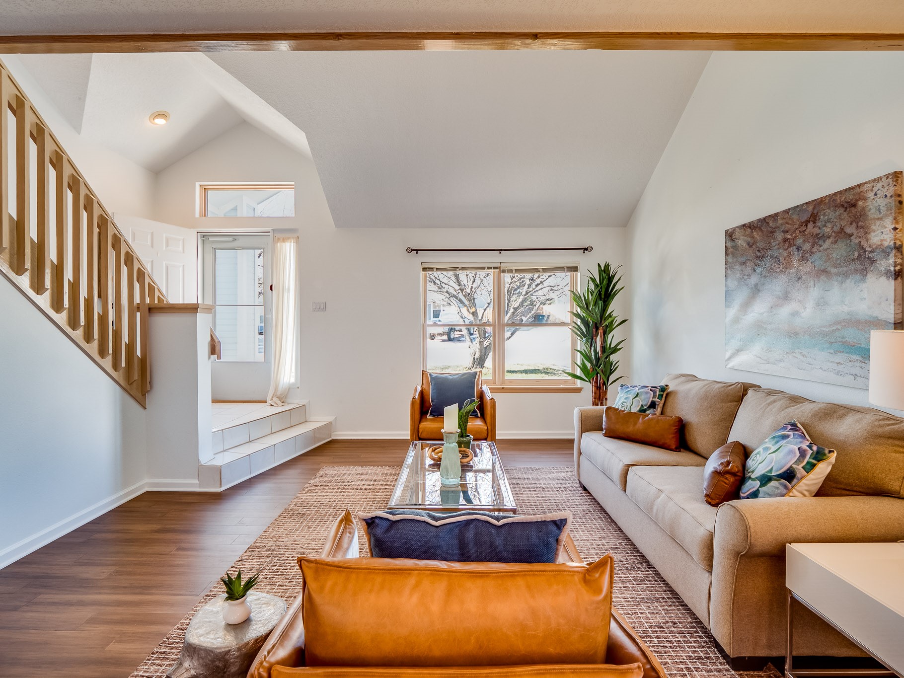 Situated on a desirable corner lot in North Mesa, this beautiful two-story home offers exceptional curb appeal with a large grassy front yard and mature trees lining the welcoming front entrance, providing shade as well as privacy. Step inside the foyer and descend a few steps into the bright, open living room, where rich engineered wood floors extend throughout the main living spaces. Vaulted ceilings enhance the sense of space and light, creating an inviting atmosphere ideal for both everyday living and entertaining. The living room flows seamlessly into the dining area, thoughtfully divided from the kitchen by open glass shelving that adds architectural interest while maintaining an open-concept feel. The kitchen has light colored cabinetry and abundant quartz counter space, including a peninsula island with bar seating. Stainless steel refrigerator and a gas oven/range, and there is convenient access to the oversized two-car garage. Adjacent to the kitchen, the family room features vaulted ceilings and a dramatic floor to ceiling stone wood burning fireplace, serving as a warm and striking focal point. From here, step outside to the covered deck overlooking the fully fenced backyard with mature trees, and ample space for gardening and outdoor dining. The main level also includes three nicely sized carpeted guest bedrooms, a guest bathroom with a walk-in tiled shower featuring a luxurious shower panel and single-sink vanity, along with a dedicated laundry room and additional storage closet. Upstairs, the home is fully carpeted and features a cozy loft perfect for relaxing or reading, as well as a versatile bonus room that could serve as a hobby space, office, or additional bedroom. Spacious primary en-suite bedroom with a large walk-in closet and a spa-like bathroom complete with a double-sink vanity, tile flooring, and a deep soaking tub. Located near parks, horse stables and trails, book your tour of this move-in ready home and experience what it has to offer!
