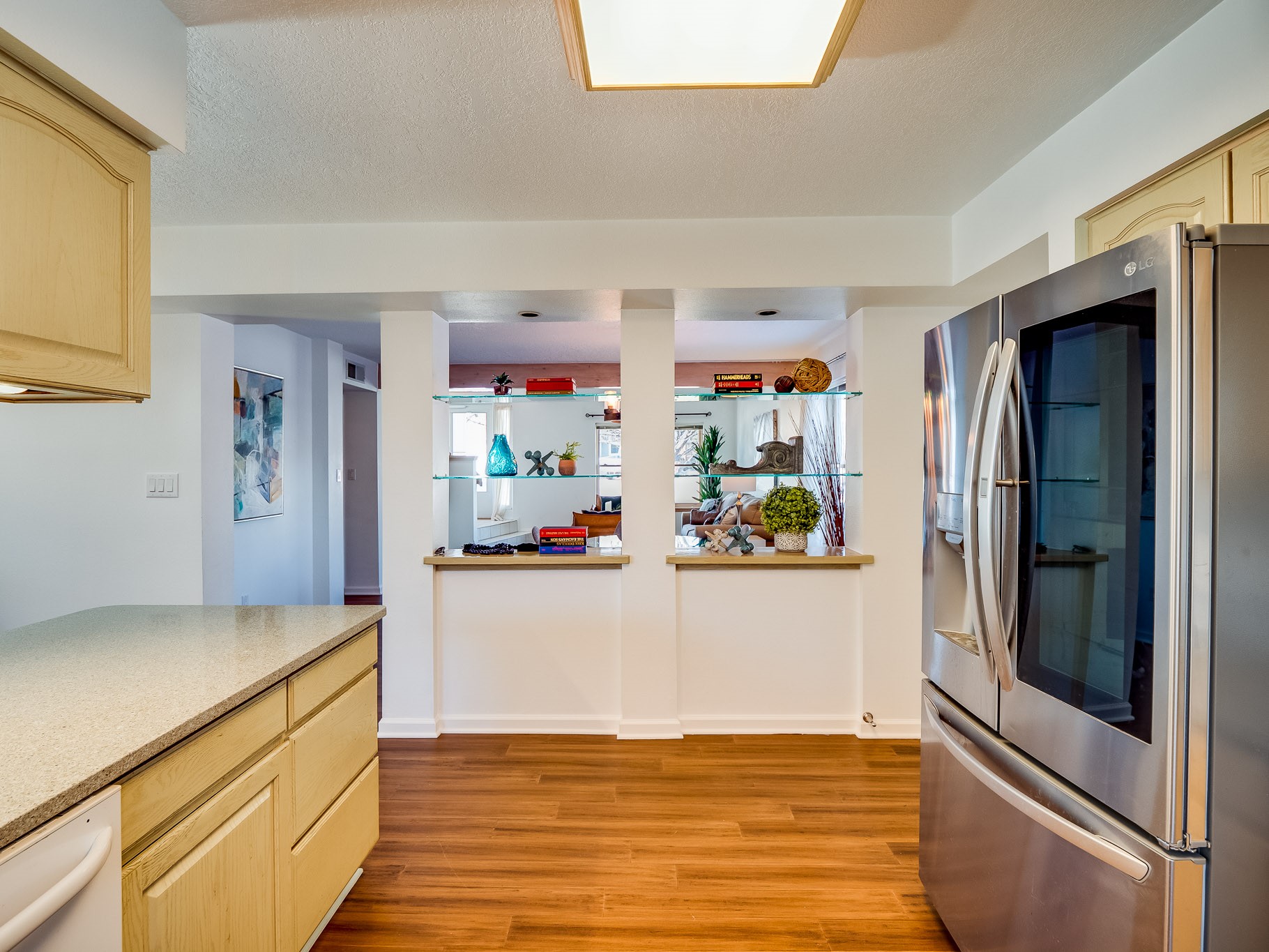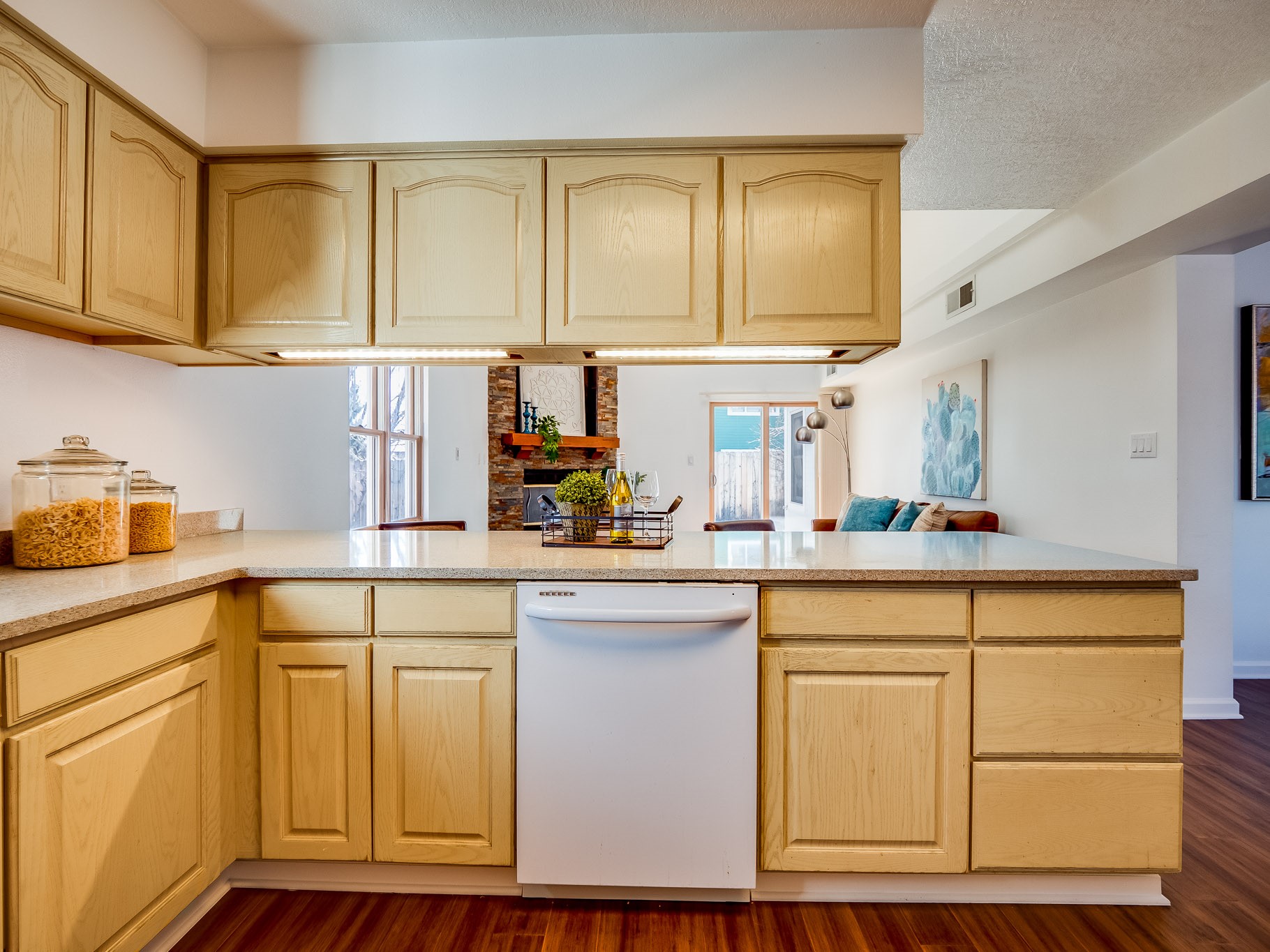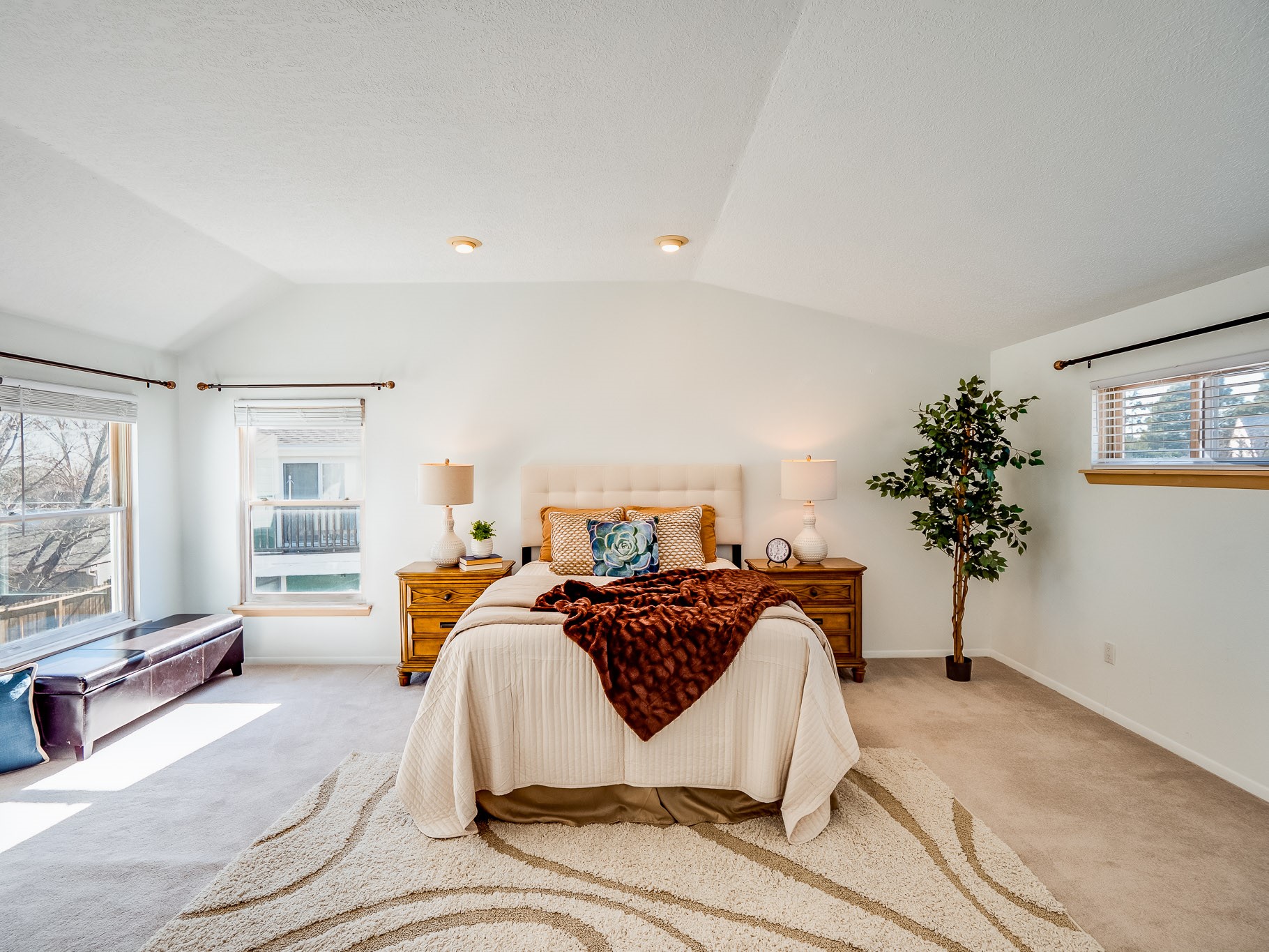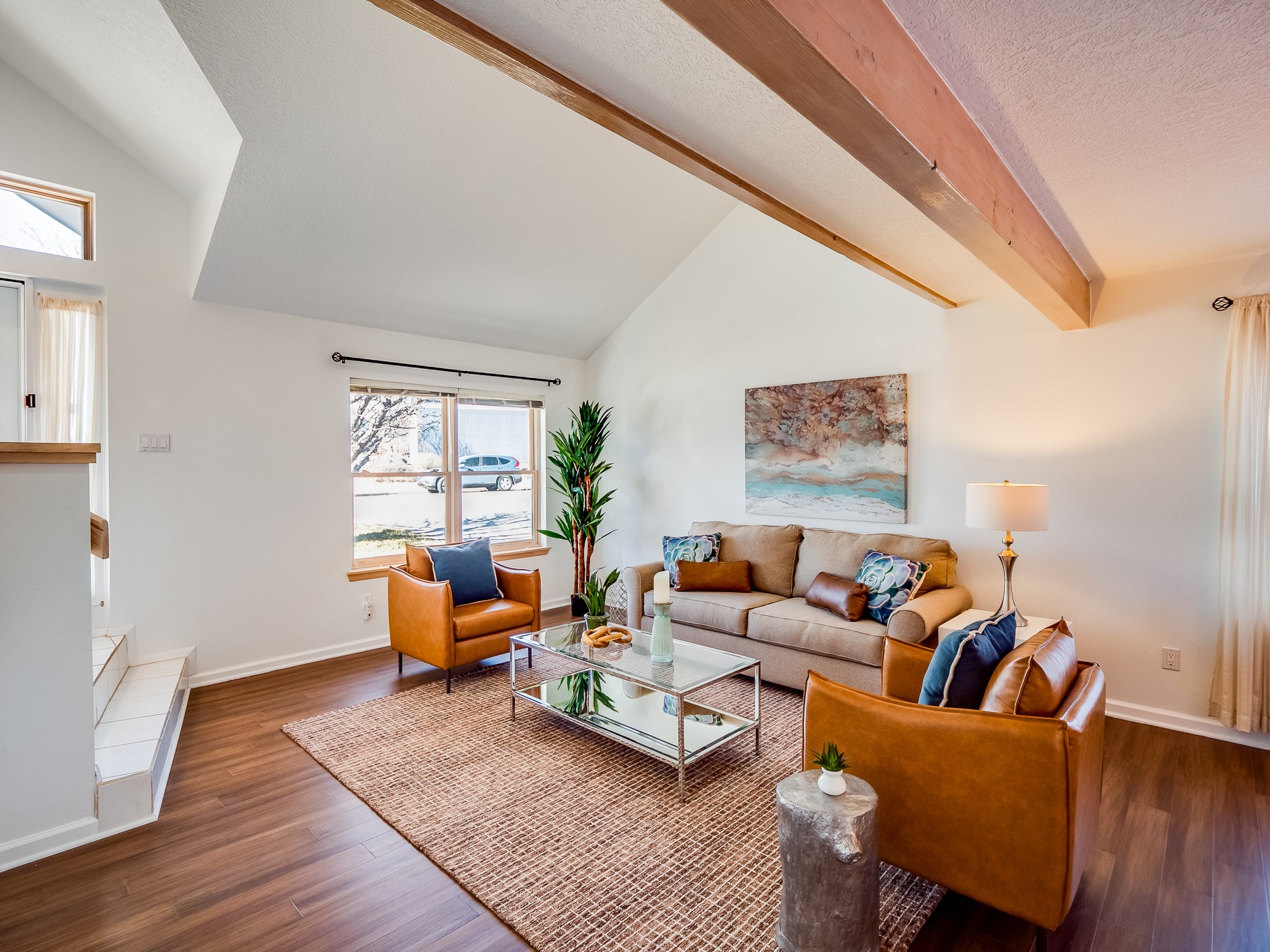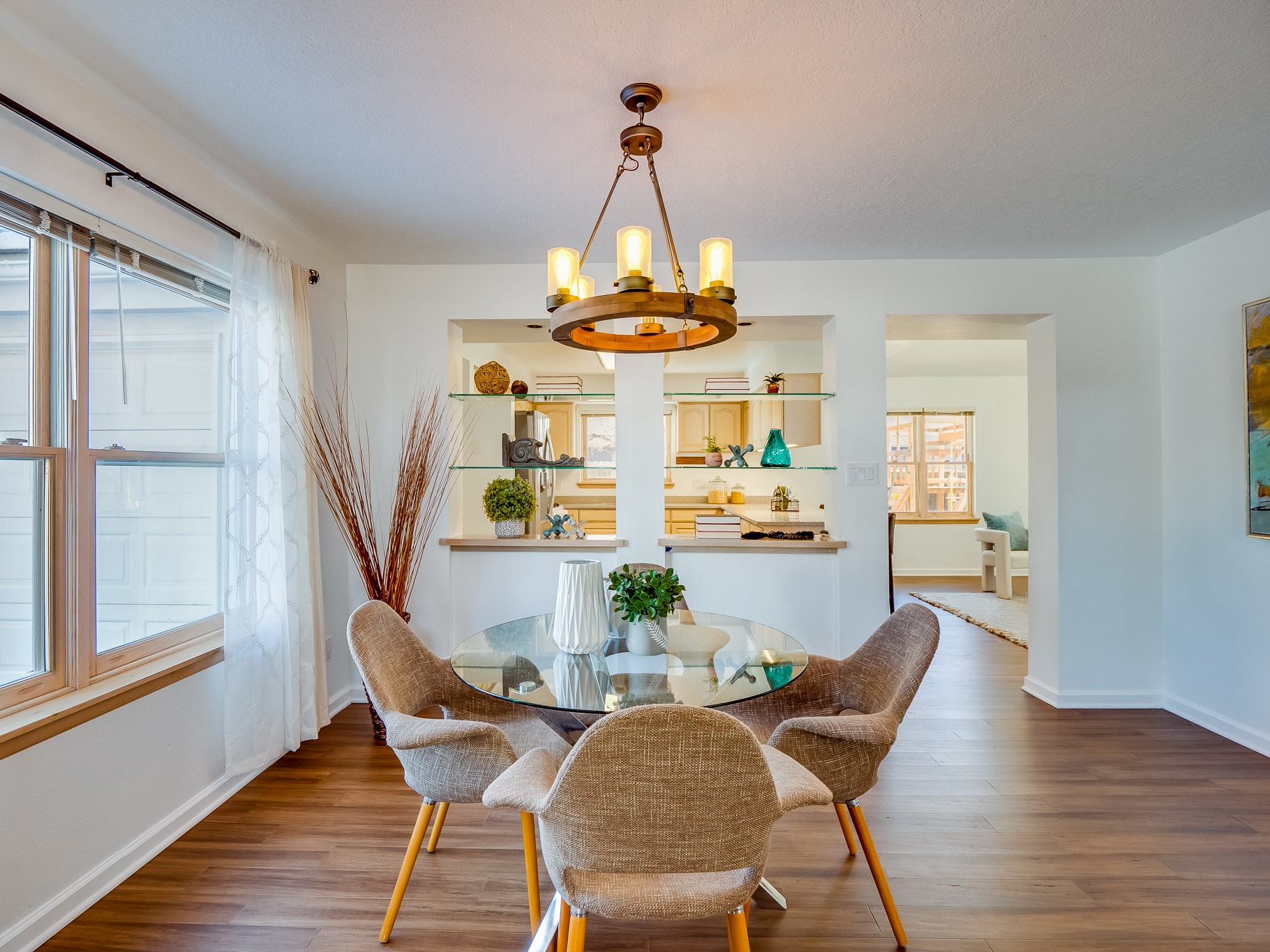 Situated on a desirable corner lot in North Mesa, this beautiful two-story home offers exceptional curb appeal with a large grassy front yard and mature trees lining the welcoming front entrance, providing shade as well as privacy. Step inside the foyer and descend a few steps into the bright, open living room, where rich engineered wood floors extend throughout the main living spaces. Vaulted ceilings enhance the sense of space and light, creating an inviting atmosphere ideal for both everyday living and entertaining. The living room flows seamlessly into the dining area, thoughtfully divided from the kitchen by open glass shelving that adds architectural interest while maintaining an open-concept feel. The kitchen has light colored cabinetry and abundant quartz counter space, including a peninsula island with bar seating. Stainless steel refrigerator and a gas oven/range, and there is convenient access to the oversized two-car garage. Adjacent to the kitchen, the family room features vaulted ceilings and a dramatic floor to ceiling stone wood burning fireplace, serving as a warm and striking focal point. From here, step outside to the covered deck overlooking the fully fenced backyard with mature trees, and ample space for gardening and outdoor dining. The main level also includes three nicely sized carpeted guest bedrooms, a guest bathroom with a walk-in tiled shower featuring a luxurious shower panel and single-sink vanity, along with a dedicated laundry room and additional storage closet. Upstairs, the home is fully carpeted and features a cozy loft perfect for relaxing or reading, as well as a versatile bonus room that could serve as a hobby space, office, or additional bedroom. Spacious primary en-suite bedroom with a large walk-in closet and a spa-like bathroom complete with a double-sink vanity, tile flooring, and a deep soaking tub. Located near parks, horse stables and trails, book your tour of this move-in ready home and experience what it has to offer!
