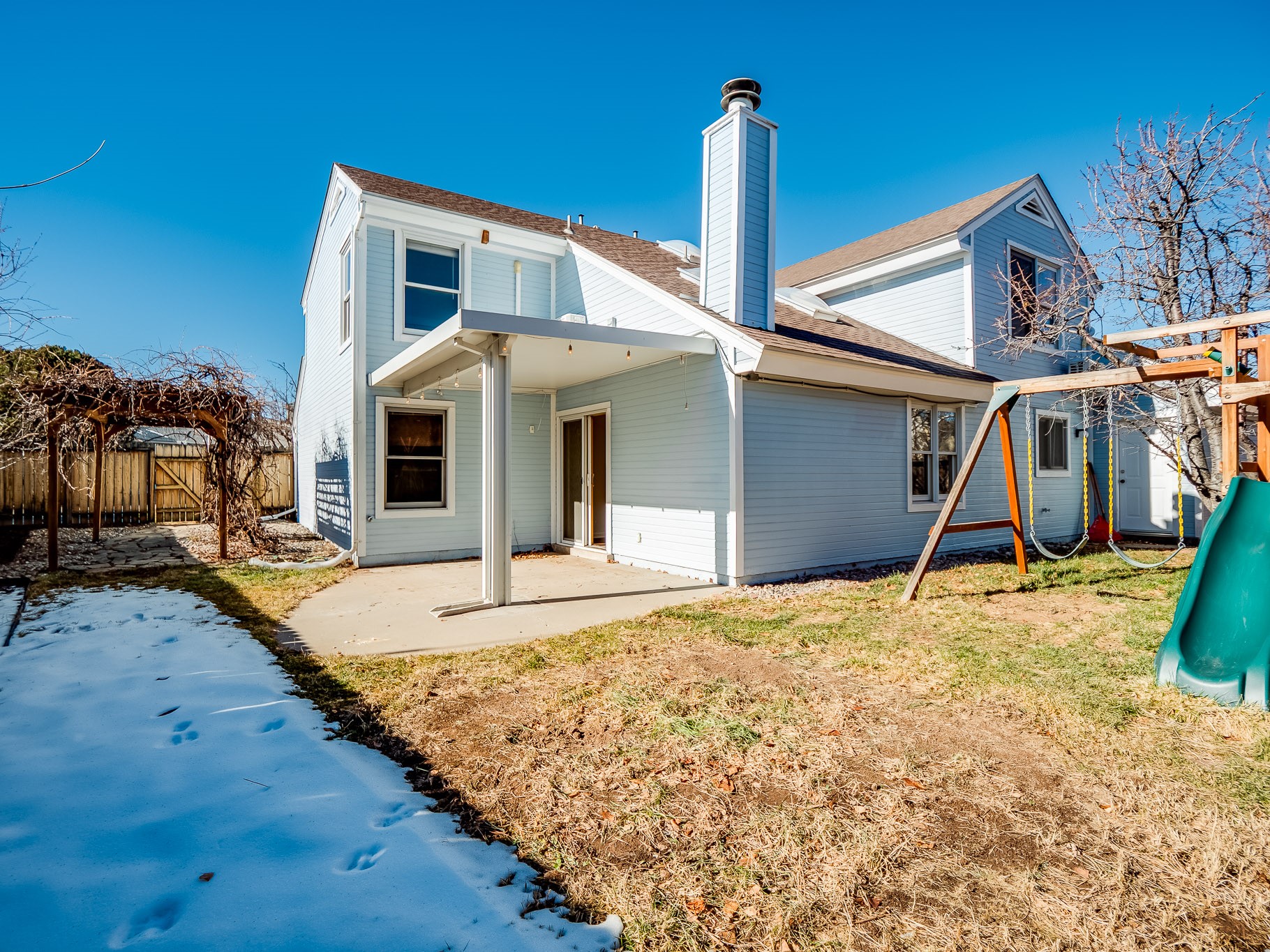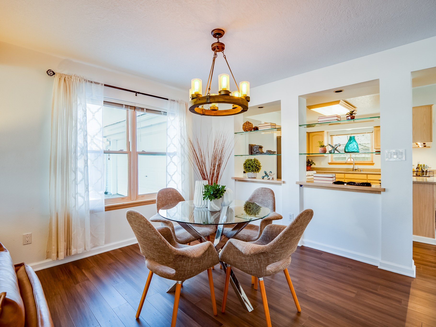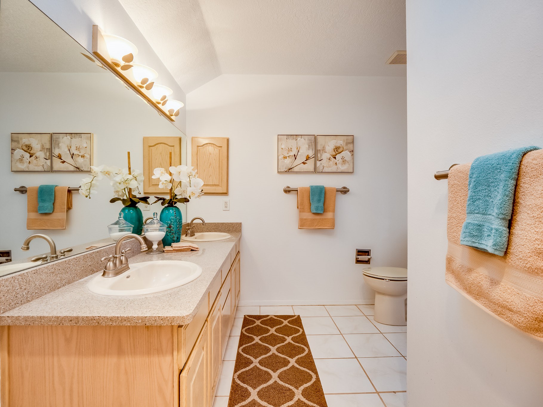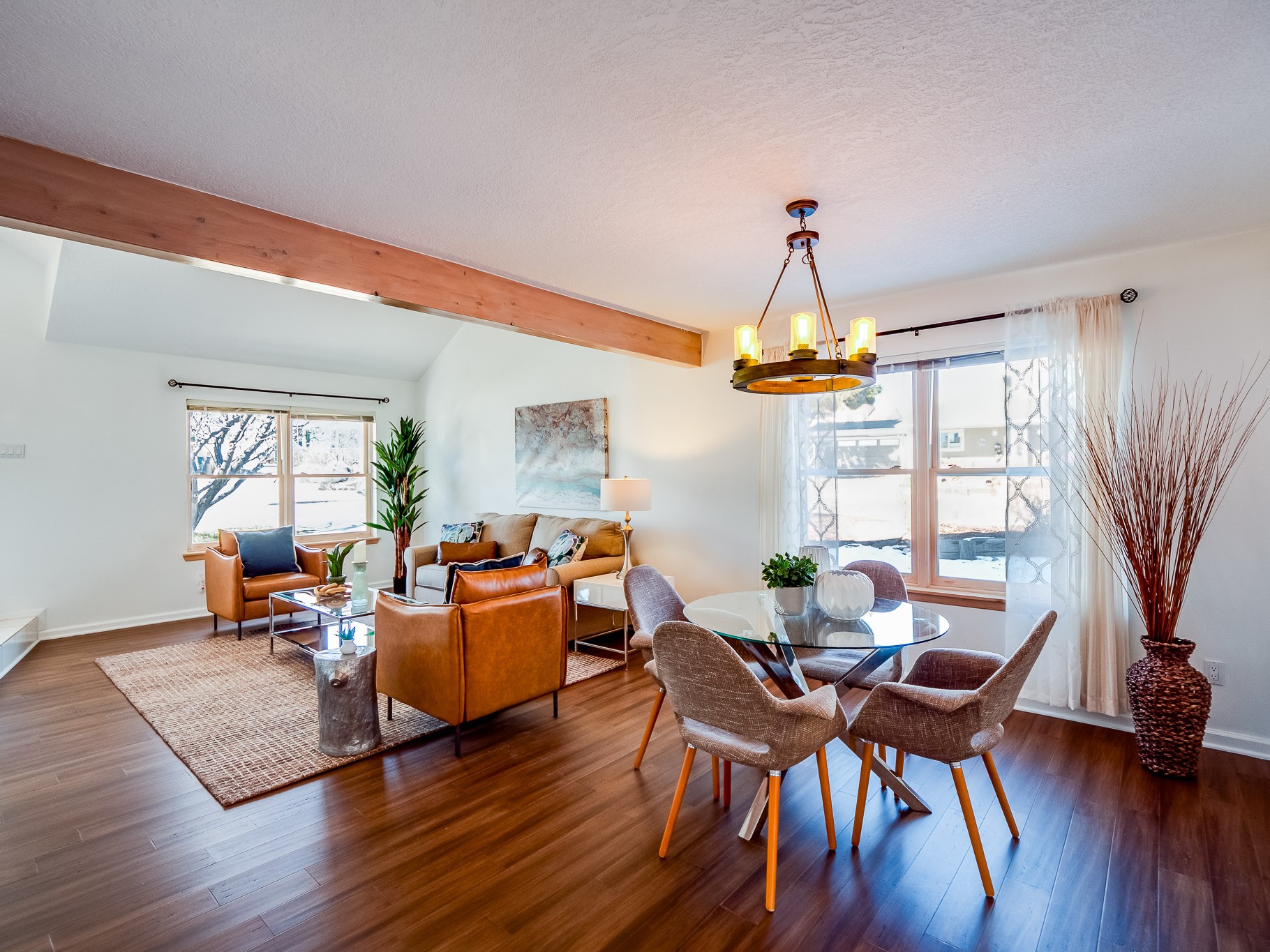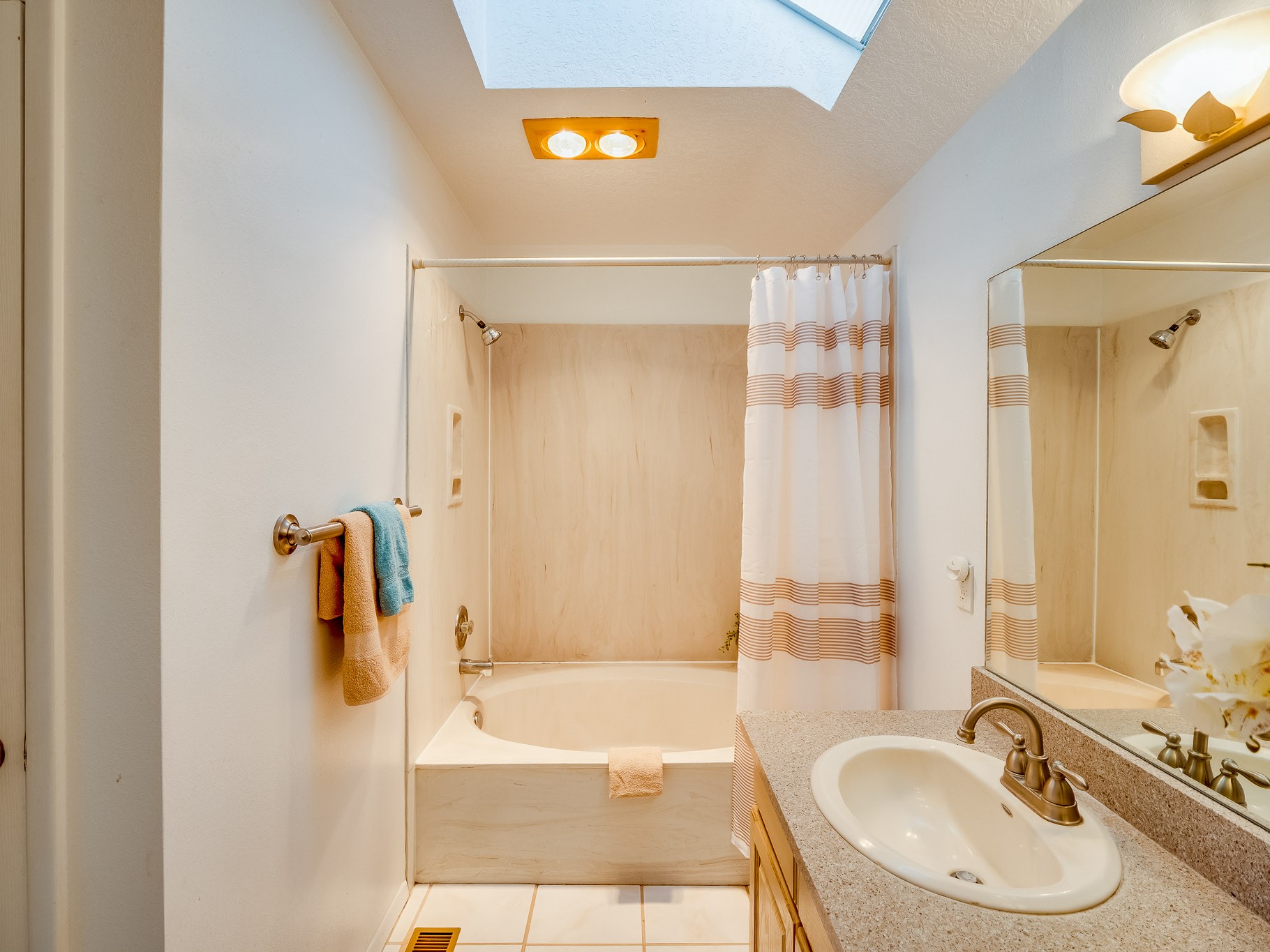 Situated on a desirable corner lot in North Mesa, this beautiful two-story home offers exceptional curb appeal with a large grassy front yard and mature trees lining the welcoming front entrance, providing shade as well as privacy. Step inside the foyer and descend a few steps into the bright, open living room, where rich engineered wood floors extend throughout the main living spaces. Vaulted ceilings enhance the sense of space and light, creating an inviting atmosphere ideal for both everyday living and entertaining. The living room flows seamlessly into the dining area, thoughtfully divided from the kitchen by open glass shelving that adds architectural interest while maintaining an open-concept feel. The kitchen has light colored cabinetry and abundant quartz counter space, including a peninsula island with bar seating. Stainless steel refrigerator and a gas oven/range, and there is convenient access to the oversized two-car garage. Adjacent to the kitchen, the family room features vaulted ceilings and a dramatic floor to ceiling stone wood burning fireplace, serving as a warm and striking focal point. From here, step outside to the covered deck overlooking the fully fenced backyard with mature trees, and ample space for gardening and outdoor dining. The main level also includes three nicely sized carpeted guest bedrooms, a guest bathroom with a walk-in tiled shower featuring a luxurious shower panel and single-sink vanity, along with a dedicated laundry room and additional storage closet. Upstairs, the home is fully carpeted and features a cozy loft perfect for relaxing or reading, as well as a versatile bonus room that could serve as a hobby space, office, or additional bedroom. Spacious primary en-suite bedroom with a large walk-in closet and a spa-like bathroom complete with a double-sink vanity, tile flooring, and a deep soaking tub. Located near parks, horse stables and trails, book your tour of this move-in ready home and experience what it has to offer!