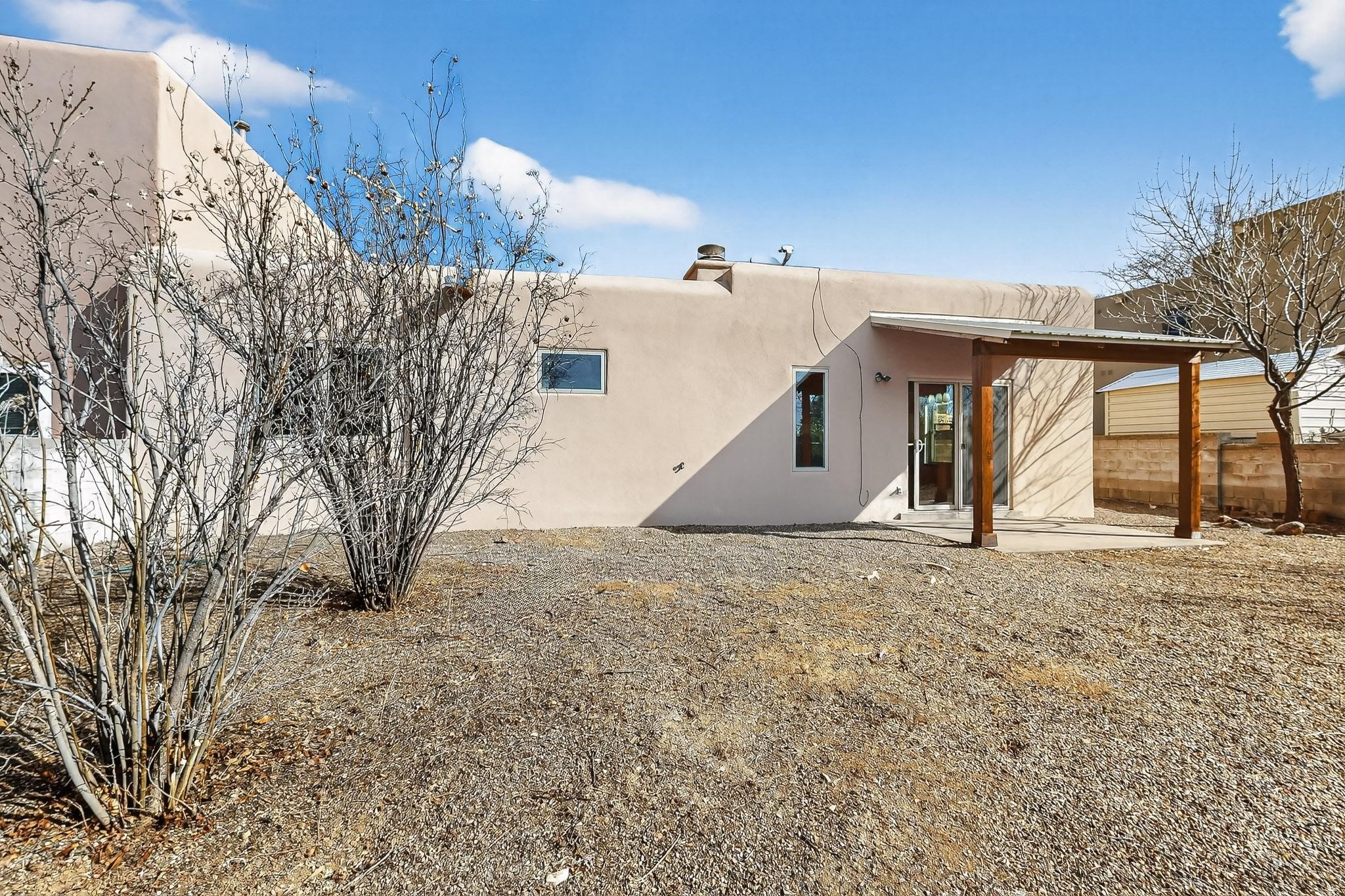Charming, updated, freshly painted and super cute single level home offers 1325 +/- sqft, 3-bedroom, 2-bath, 1-car finished garage of comfortable living. The third bedroom would make a convenient and light office. Perfectly situated on a wonderful lot backing to open space/arroyo, this property offers a spacious feel. Inside, the entryway leads to the inviting living room featuring wood beams, wood built-in bookshelves, dining area, a wood-burning fireplace, and sliding glass doors -- adding warmth, light and character. The kitchen boasts abundant cabinets, generous counter space, a pantry, gas range, stainless-steel dishwasher, and breakfast bar--ideal for casual dining or entertaining. The primary suite offers two closets and a remodeled ensuite bath with a stunning, tiled walk-in shower. Step outside to enjoy the easy-care, walled backyard with a covered portal, perfect for relaxing. Additional highlights include: New stucco on most exterior walls-Ample storage closets throughout-Large capacity washer/dryer-Forced air heat-Ceiling fans-NEWER windows-NEWER pendant and can lighting light fixtures-Dimmer switches-NEWER tile and Bamboo wood floors, and NEW laminate flooring in 2 bedrooms (No carpet)-Top/down bottom-up Hunter Douglas blinds-and so much more. Located in the La Villa Serena subdivision, approximately 10-minute drive to the Santa Fe Plaza, a few minute walk to Ragle Park, the Arroyo Chamiso and Rail Trails. This move-in-ready home close to schools, restaurants, shopping and hospitals blends warmth, character, and modern updates--a perfect combination of comfort and style.