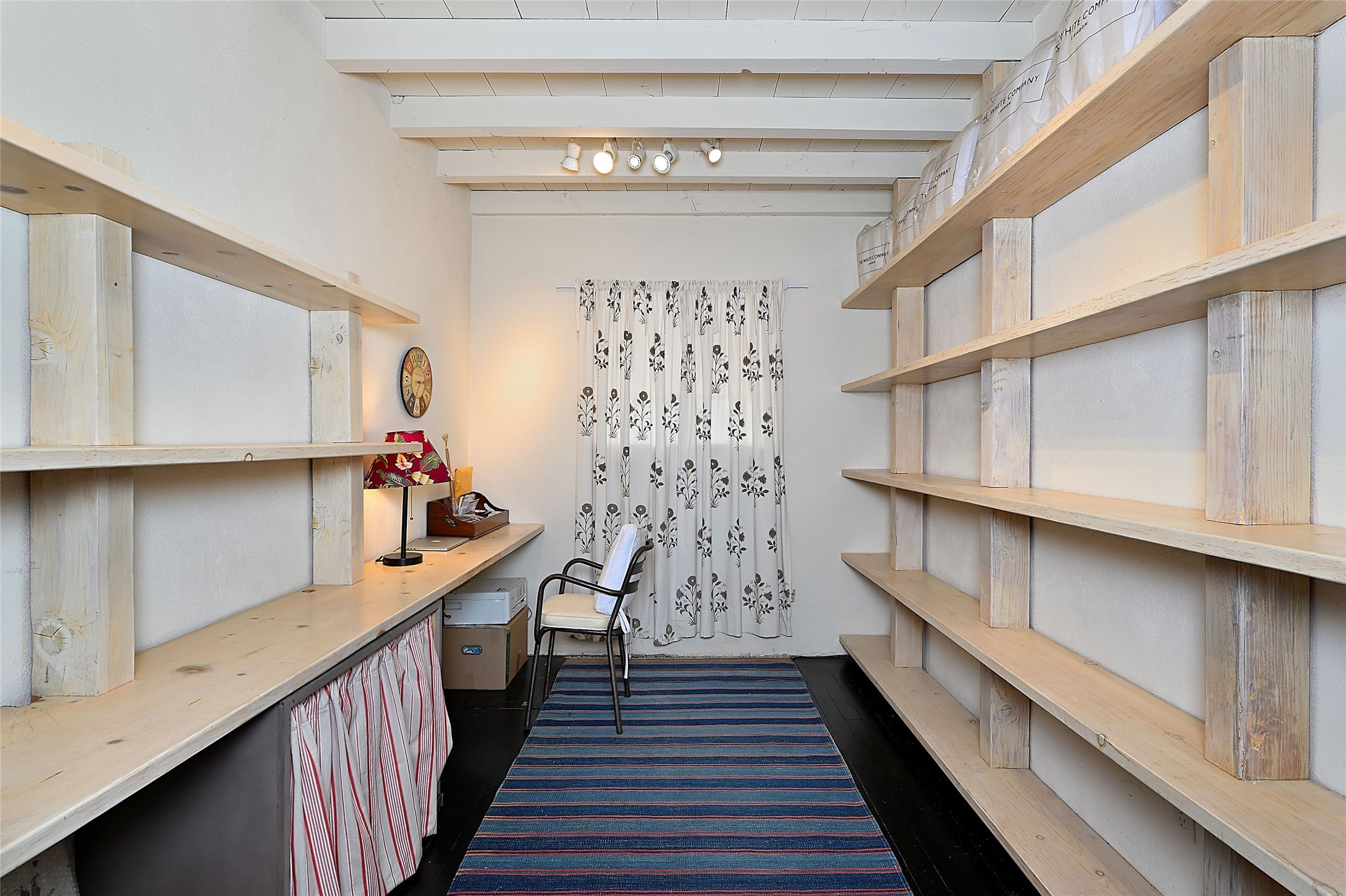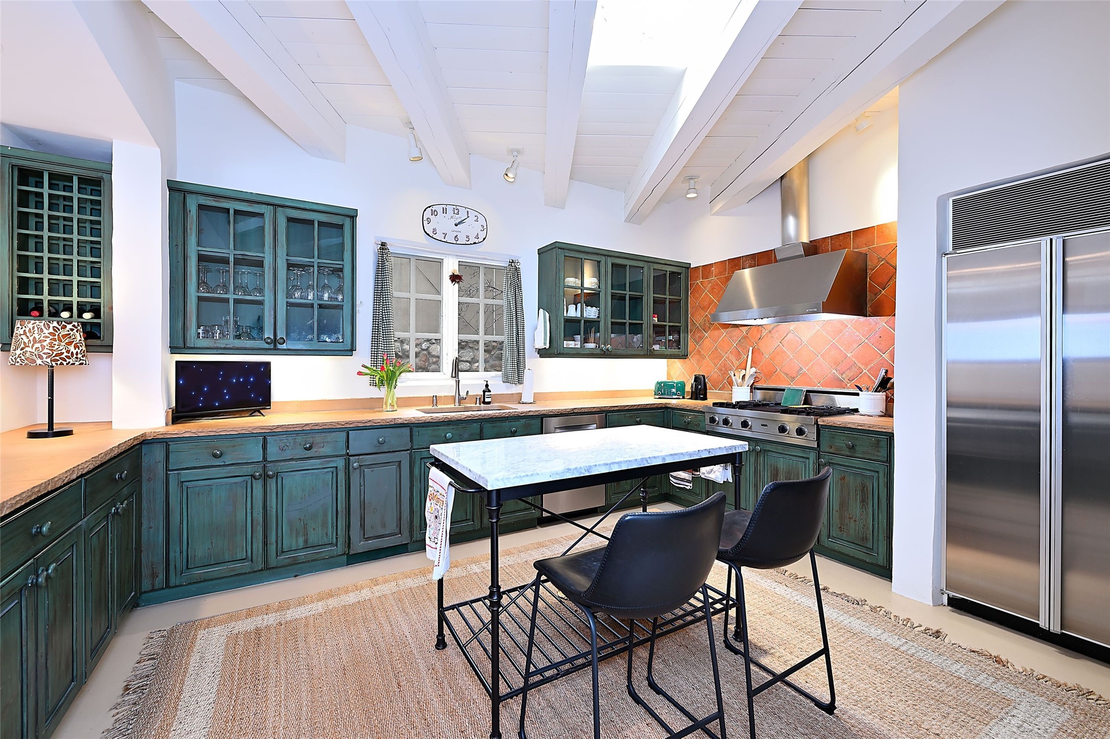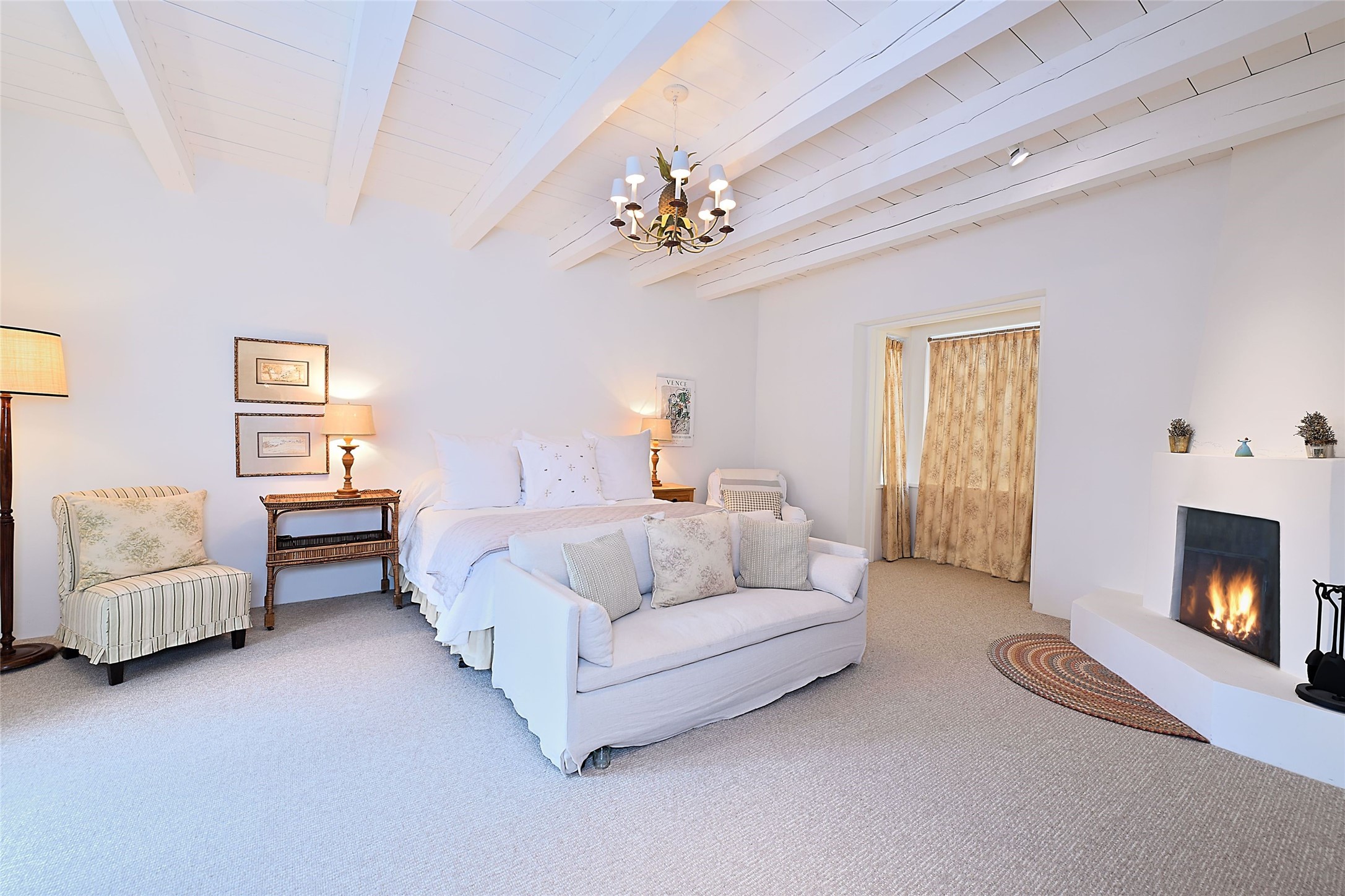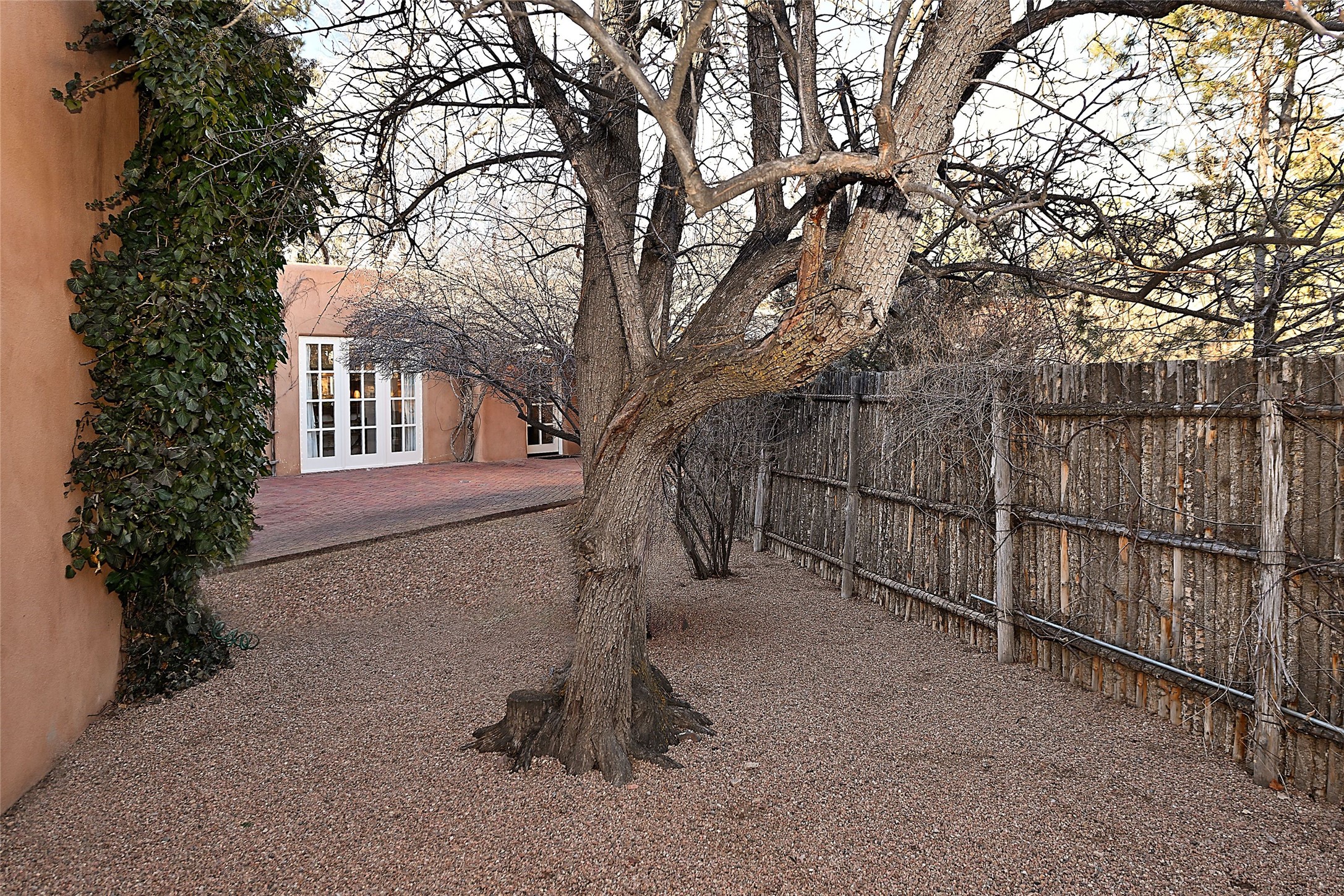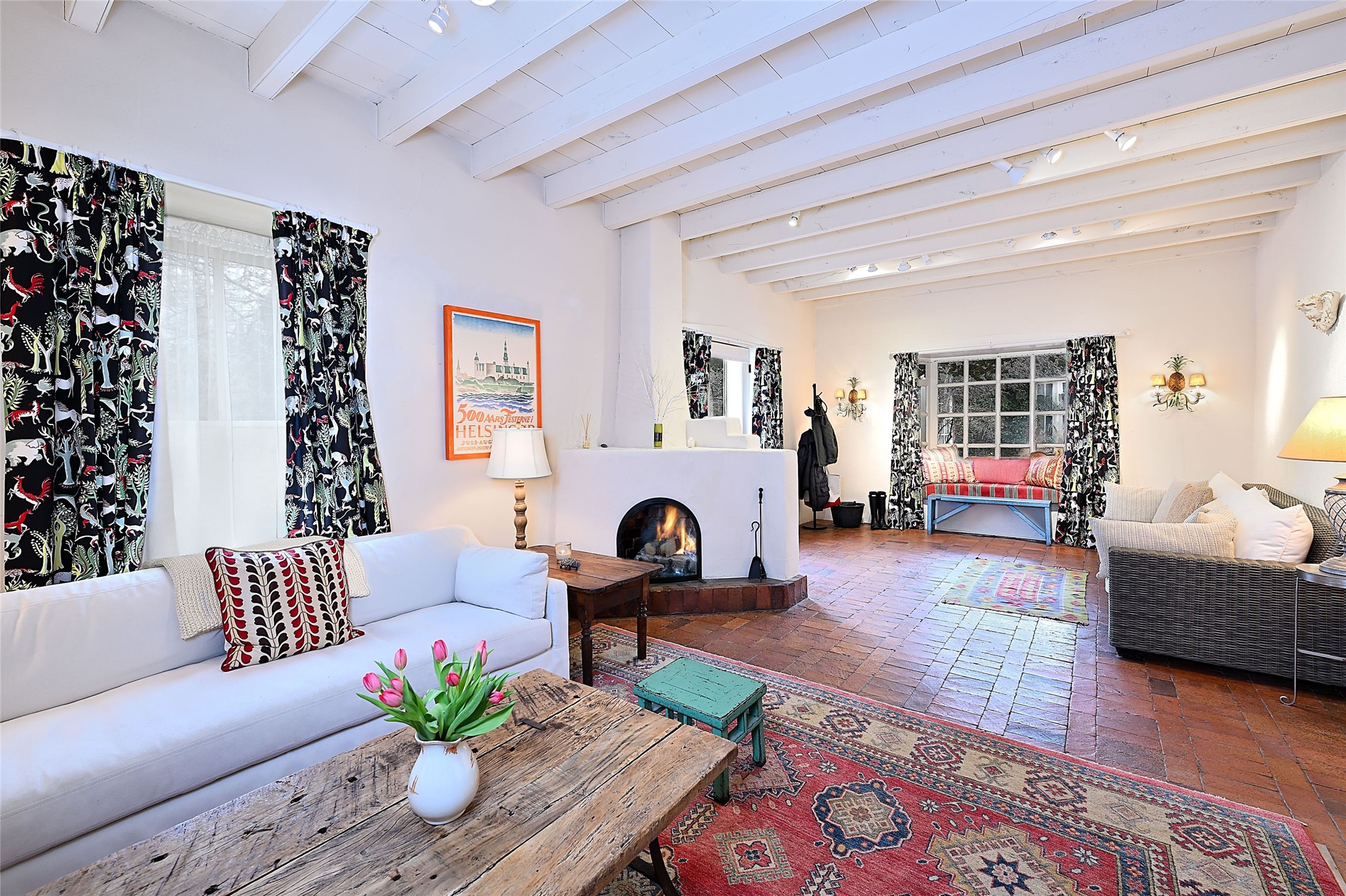 Tucked away on a quiet lane just off historic Canyon Road, this exceptional compound offers Santa Fe living at its best.This house was originally built in 1947 by artist Agnes Simms and thoughtfully expanded in 1997 by noted collector Omer Claiborne. The spacious main house welcomes you with a graceful, light filled living room featuring 12-foot beamed ceilings, multiple French doors, concrete floors, a fireplace, and extensive wall space ideal for displaying artwork. The beautifully designed kitchen opens seamlessly to an impressive dining room and includes a large walk-in pantry. There are four well separated bedrooms and five baths, and the home provides exceptional privacy and comfort.A serene east-facing courtyard extends the living space outdoors, creating a perfect setting for relaxing and dining. Mature plantings - including wisteria, lilacs, pear, plum and crabapple trees enhance the sense of tranquility.The charming guesthouse is accessed through its own courtyard and offers a cozy retreat complete with kiva fireplace, kitchenette, and bath.Located moments from Canyon Road's renowned galleries and restaurants and within walking distance of the historic Plaza.This rare property represents the best of Santa Fe living.
