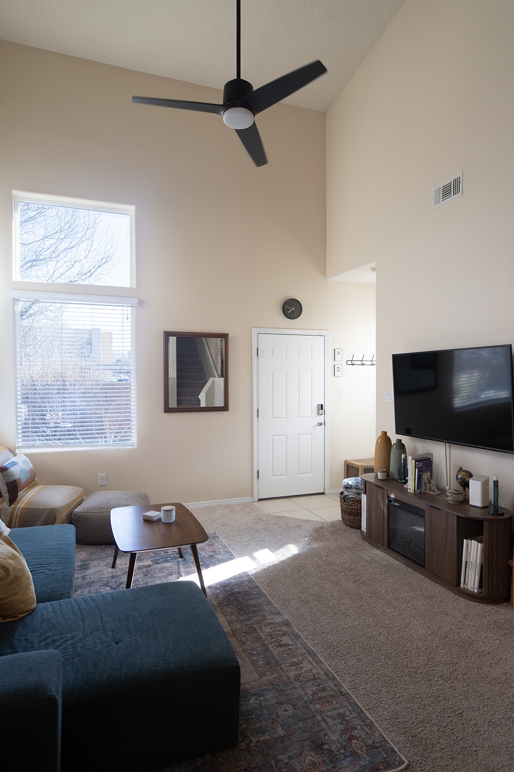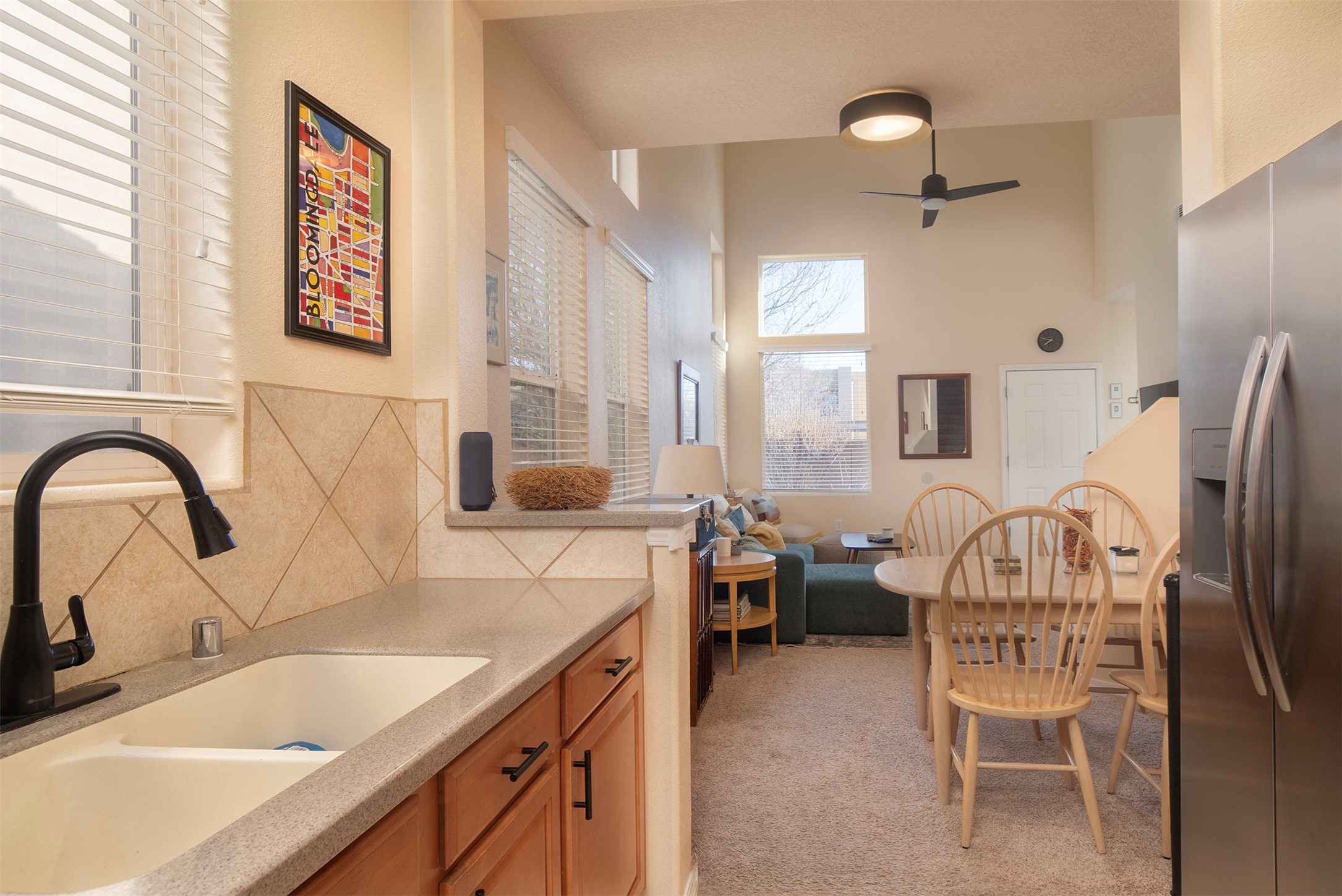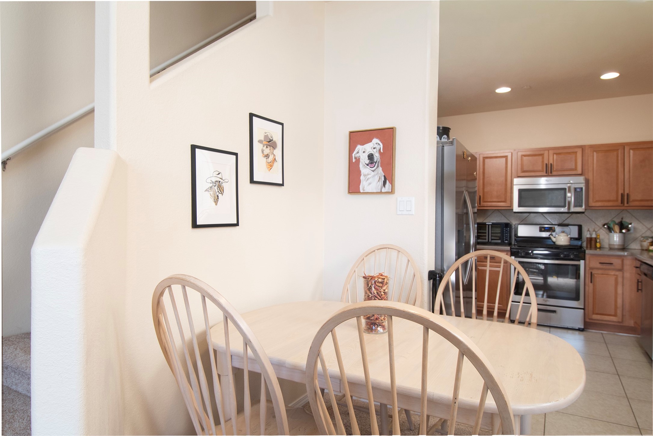 RANCHOS SANTOS MEDITERRANEAN MODERN. Modern Living in Ranchos Santos Condos of Santa Fe. This Spanish Mediterranean style 2 Bed, 2 Bath, 2 Car garage condo has a convenient and beautiful lifestyle with nearby conveniences to grocery stores, restaurants, and shopping centers. This move-in ready two floor plan features with 18' ceilings in the Living Room that give an elevated and airy feel to the whole space. Great kitchen with modern appliances, wood cabinetry, matte black hardware, solid countertops. Open floor-plan with a first floor Bedroom Suite with private, enclosed patio, en-suite bath with separate shower, soaking tub and walk-in-closet. Upstairs is a second bedroom, full bath, laundry room and a fantastic open loft. The large loft space is ideal for home office, flex and remote workers space, - ideal for office, yoga workout area, or second living area. The garage offers great space for storage. Features include refrigerated air conditioning, 2 car direct entry garage, solid surface kitchen countertops, upgraded cabinets, Dish Washer, and Range, microwave, tile flooring, ceiling fan. Built in 2009 by Centex Homes.