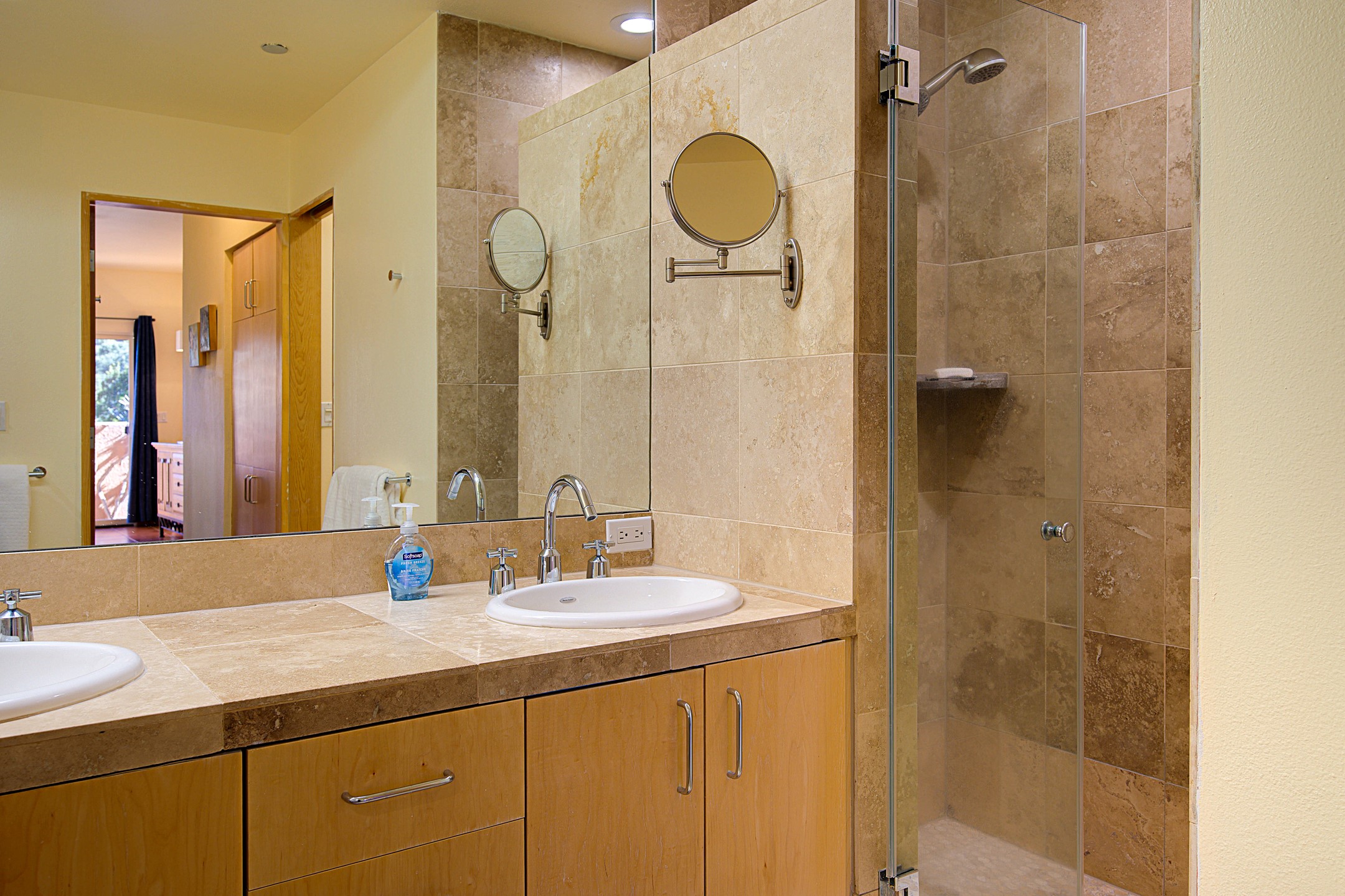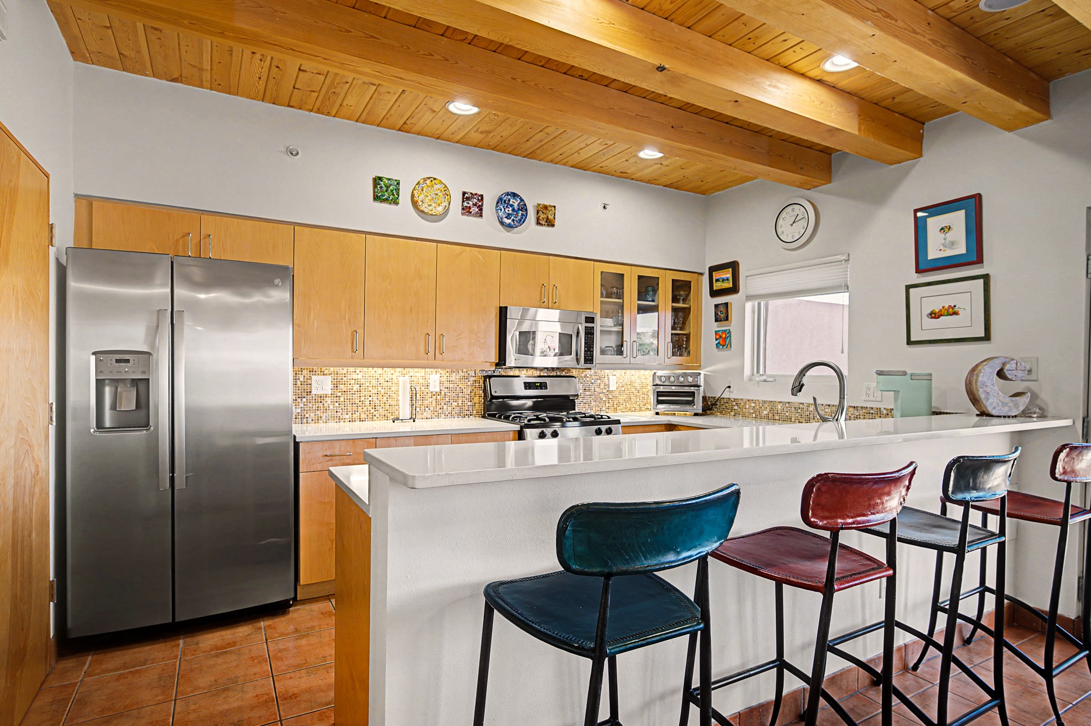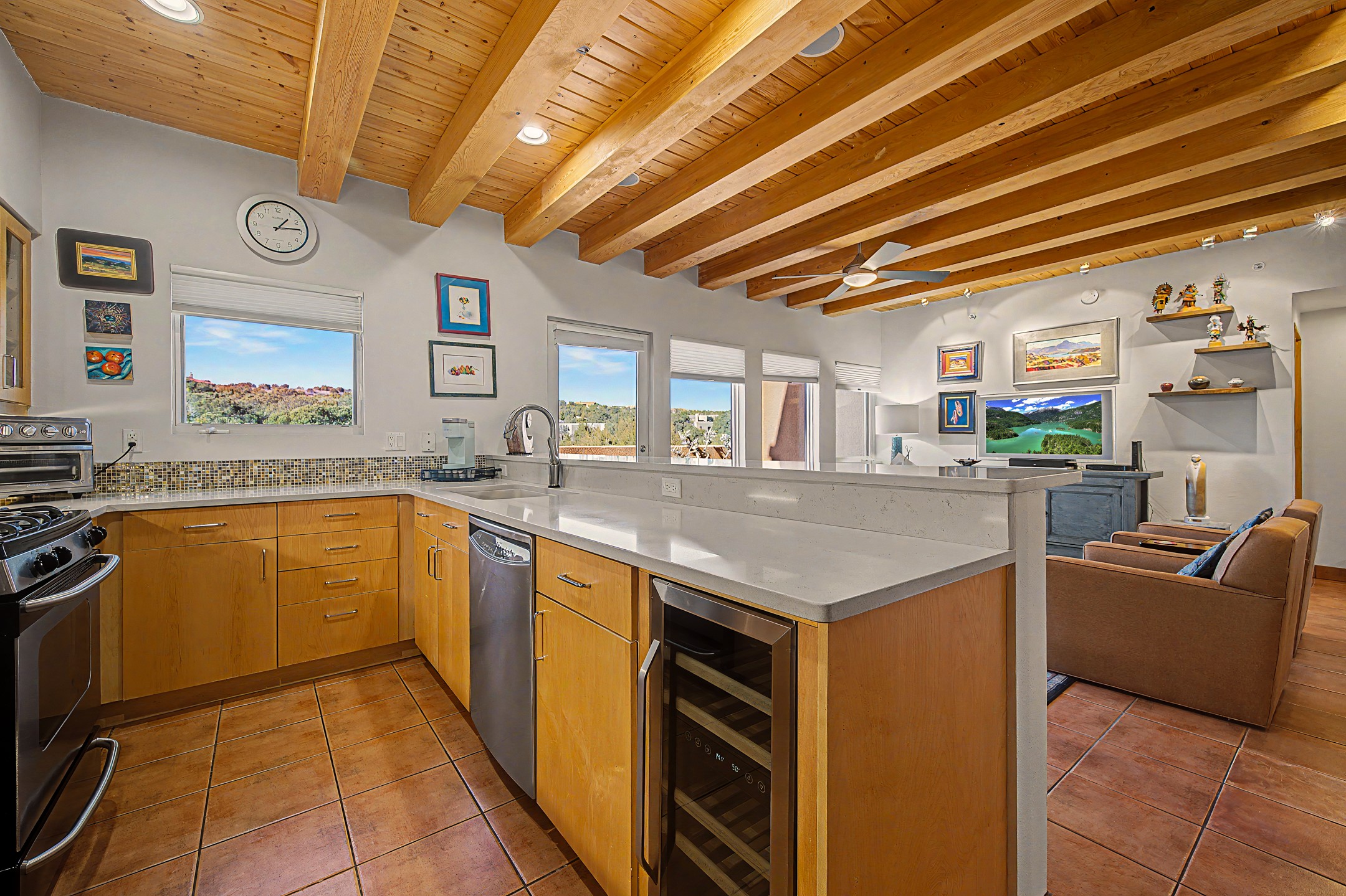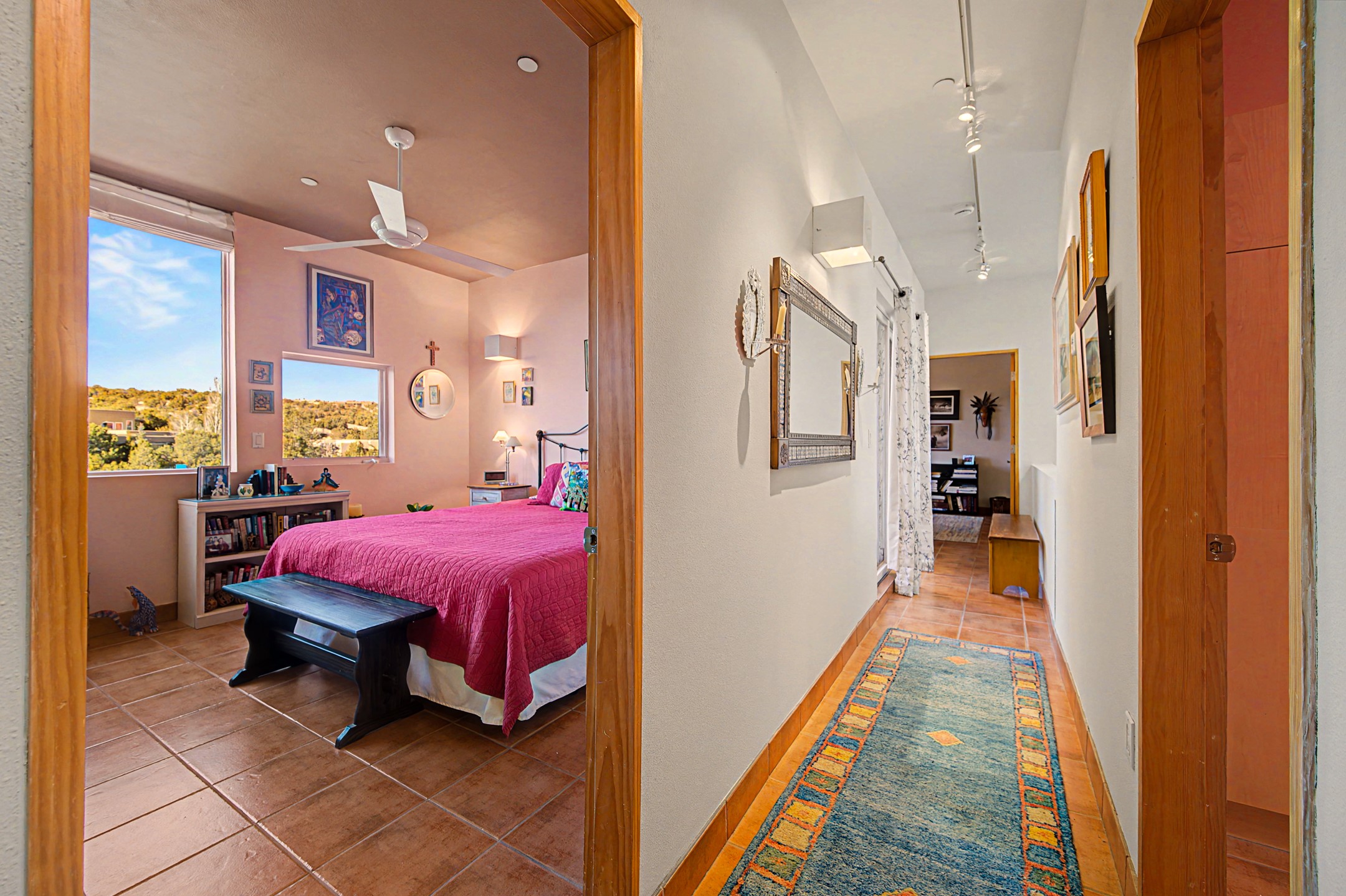 This light-filled home offers one of Zocalo's most popular floor plans in a prime west-facing location overlooking the arroyo and hillside. The residence features three bedrooms, including a main-level primary suite, with two upstairs bedrooms, a shared bath, and a private wraparound balcony. A private patio is accessible from both the living room and the primary suite for easy indoor-outdoor living.Soaring ceilings with skylights highlight the dining area, while warm wood ceilings accent the living room and kitchen. A double-sided wood-burning fireplace adds charm and warmth between the living and dining spaces. The thoughtful layout provides ground-level living, ample storage, and efficient use of space.Located in the Zocalo community designed by renowned architect Ricardo Legorreta, just minutes from downtown Santa Fe. Amenities include two fitness centers, clubhouse, pool, and spa.