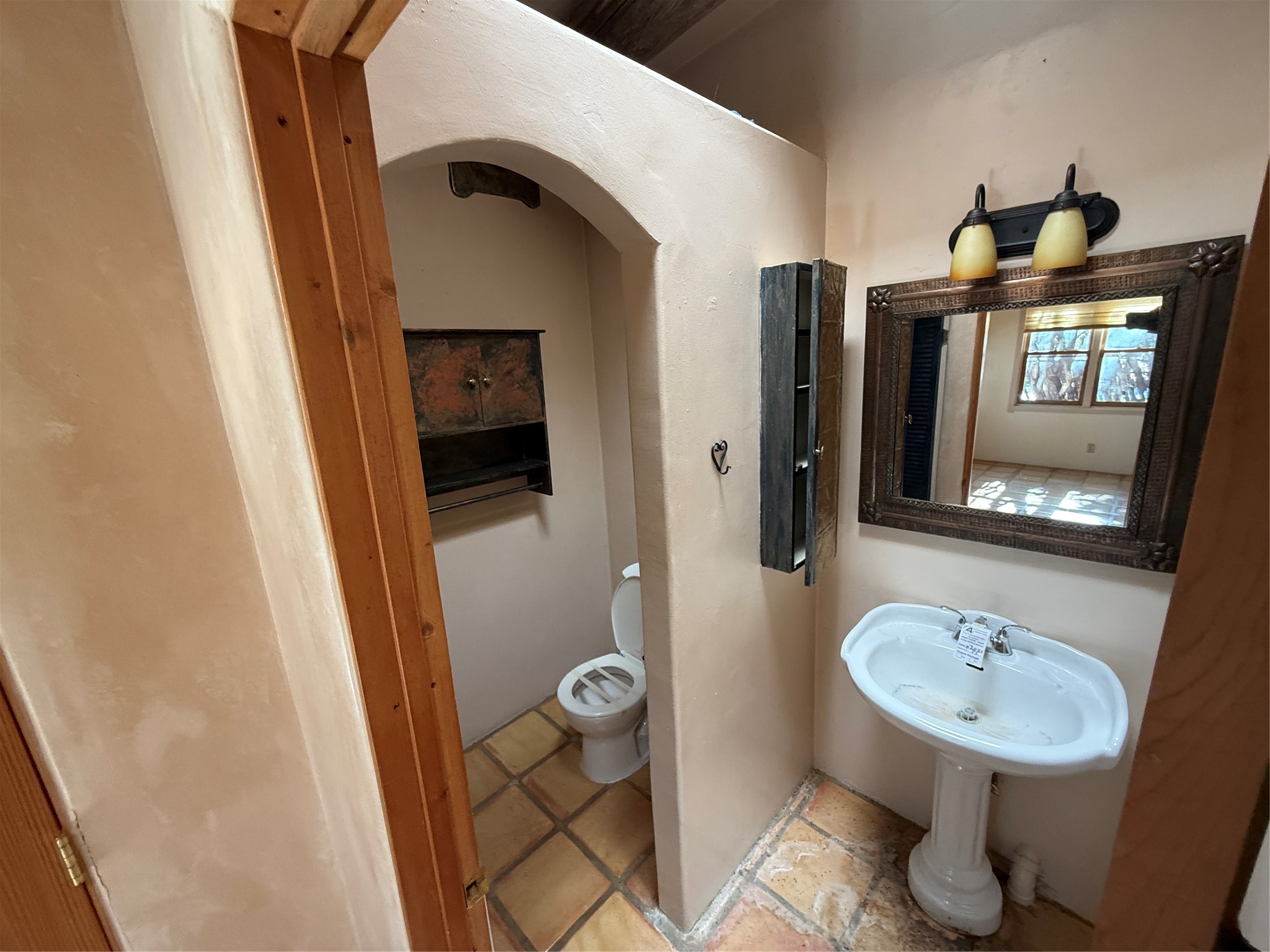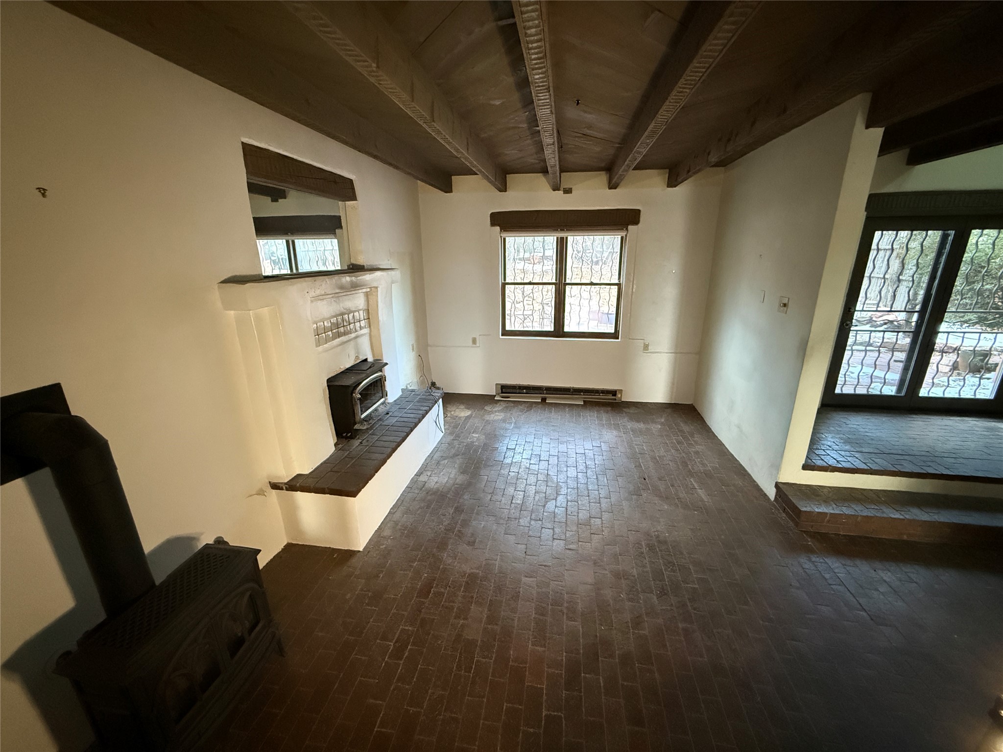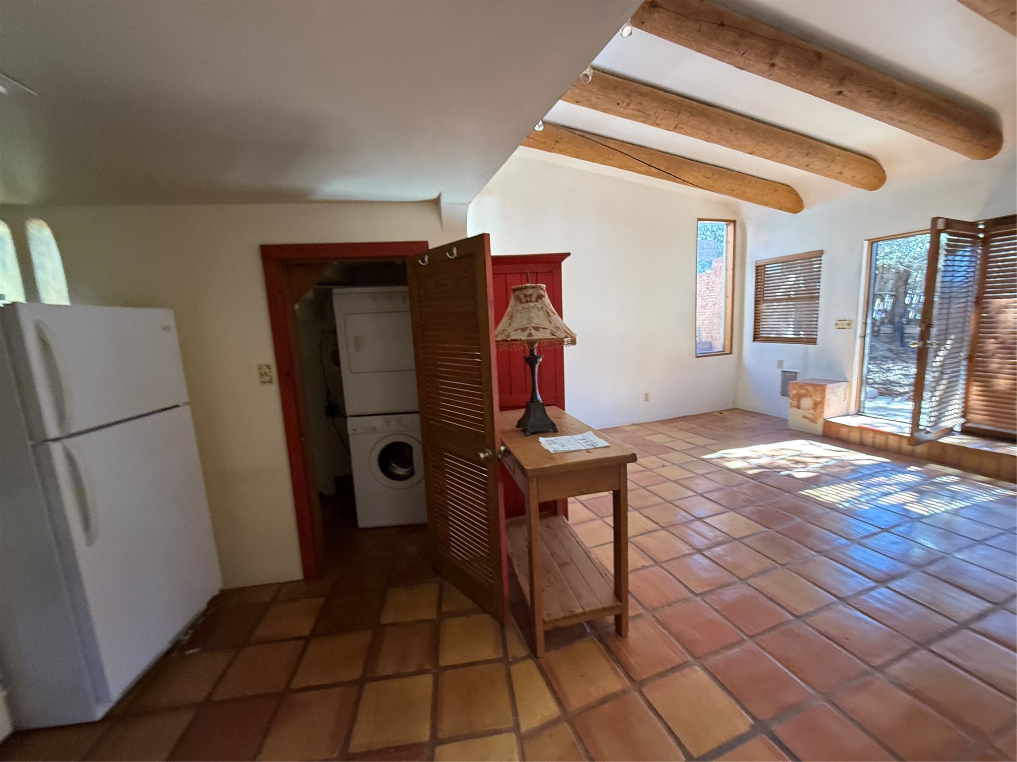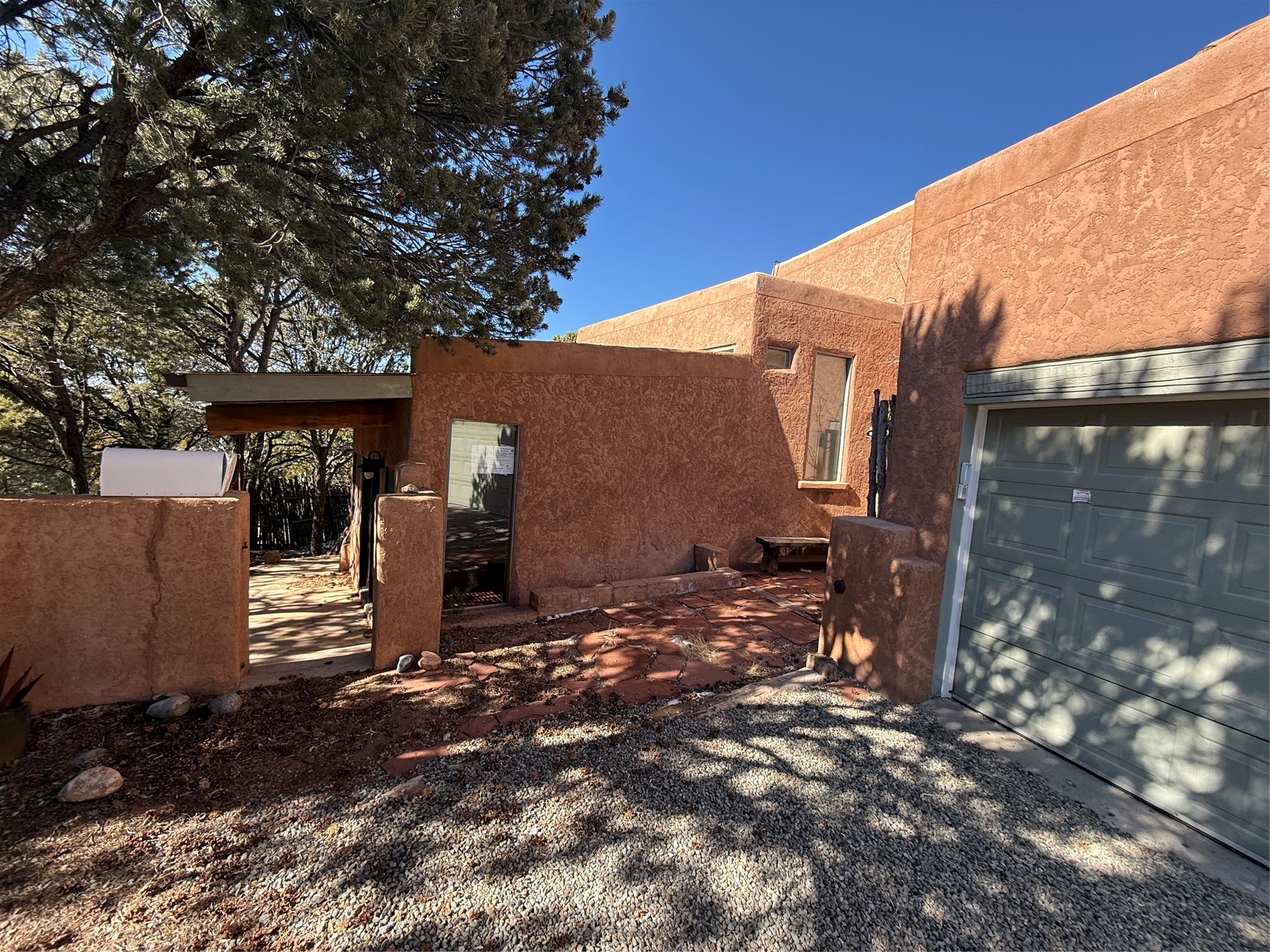 Nestled on a private, wooded 2.88-acre lot, this two-story pueblo-style home offers peaceful living with classic Santa Fe charm. The main house features three bedrooms and 2 bathrooms, a spacious kitchen with tile countertops and Saltillo tile floors, and a cozy family room with brick floors and a built-in fireplace. Enjoy outdoor living on the large brick patio overlooking the serene backyard--all offered at a great price.
