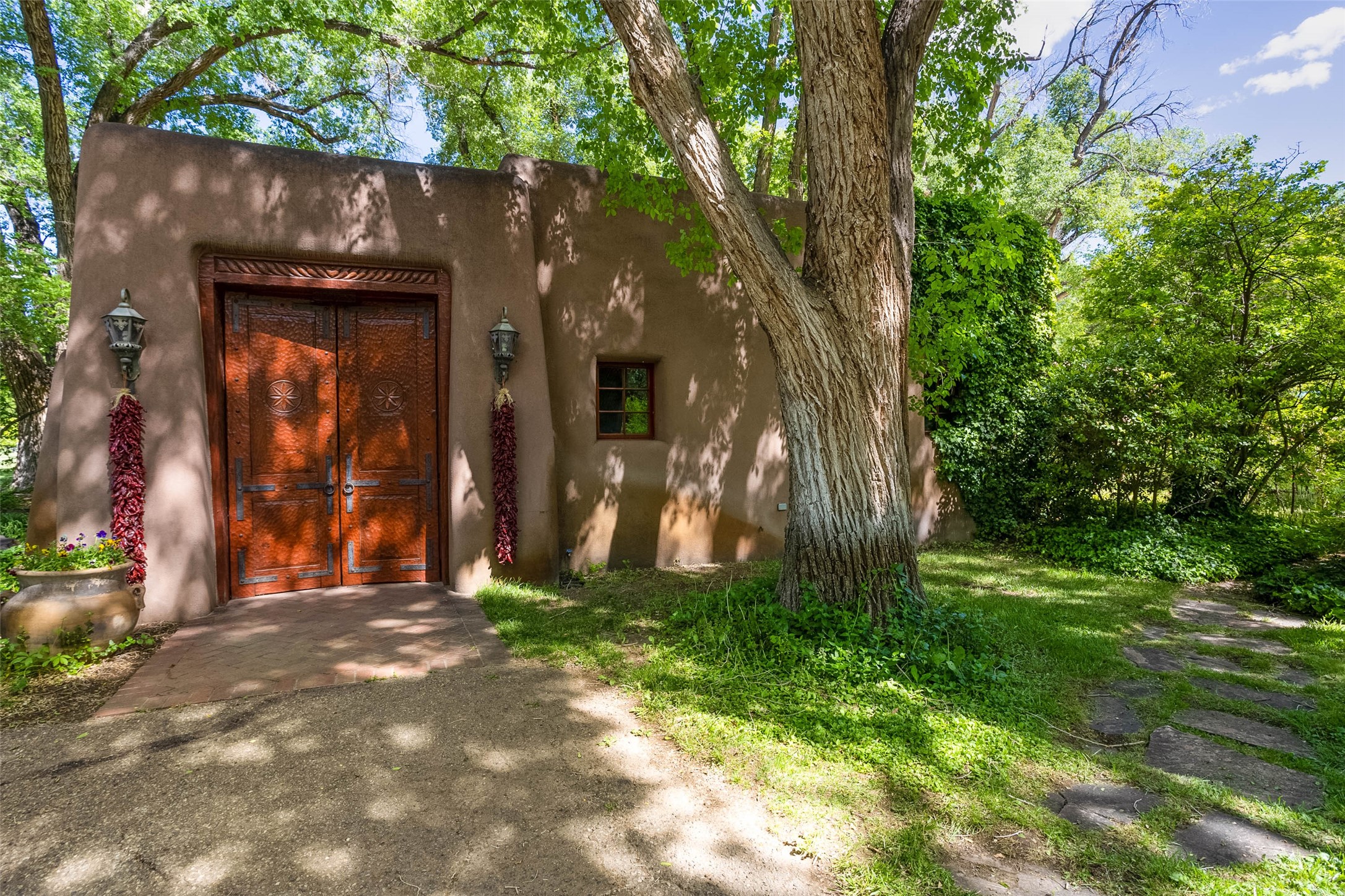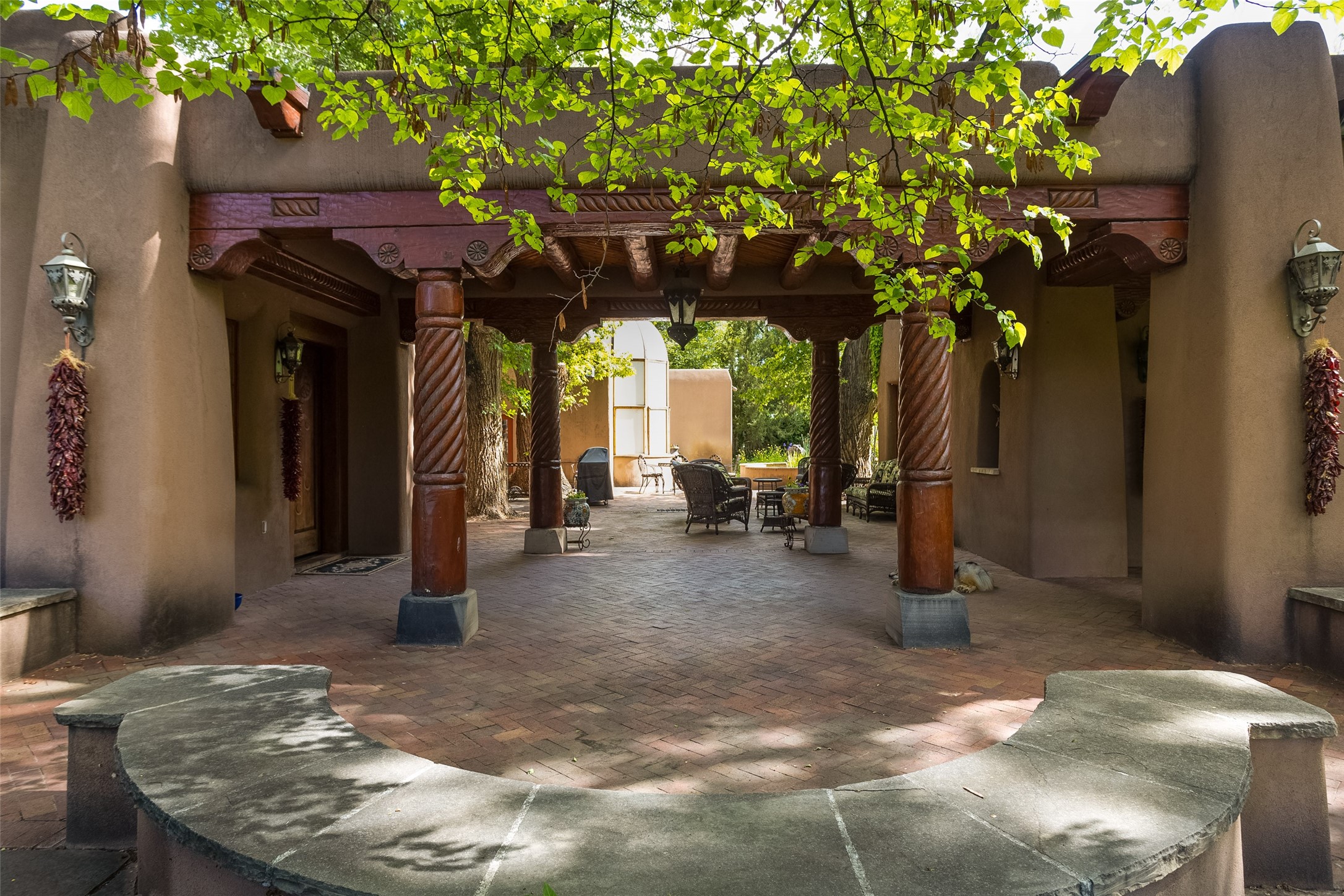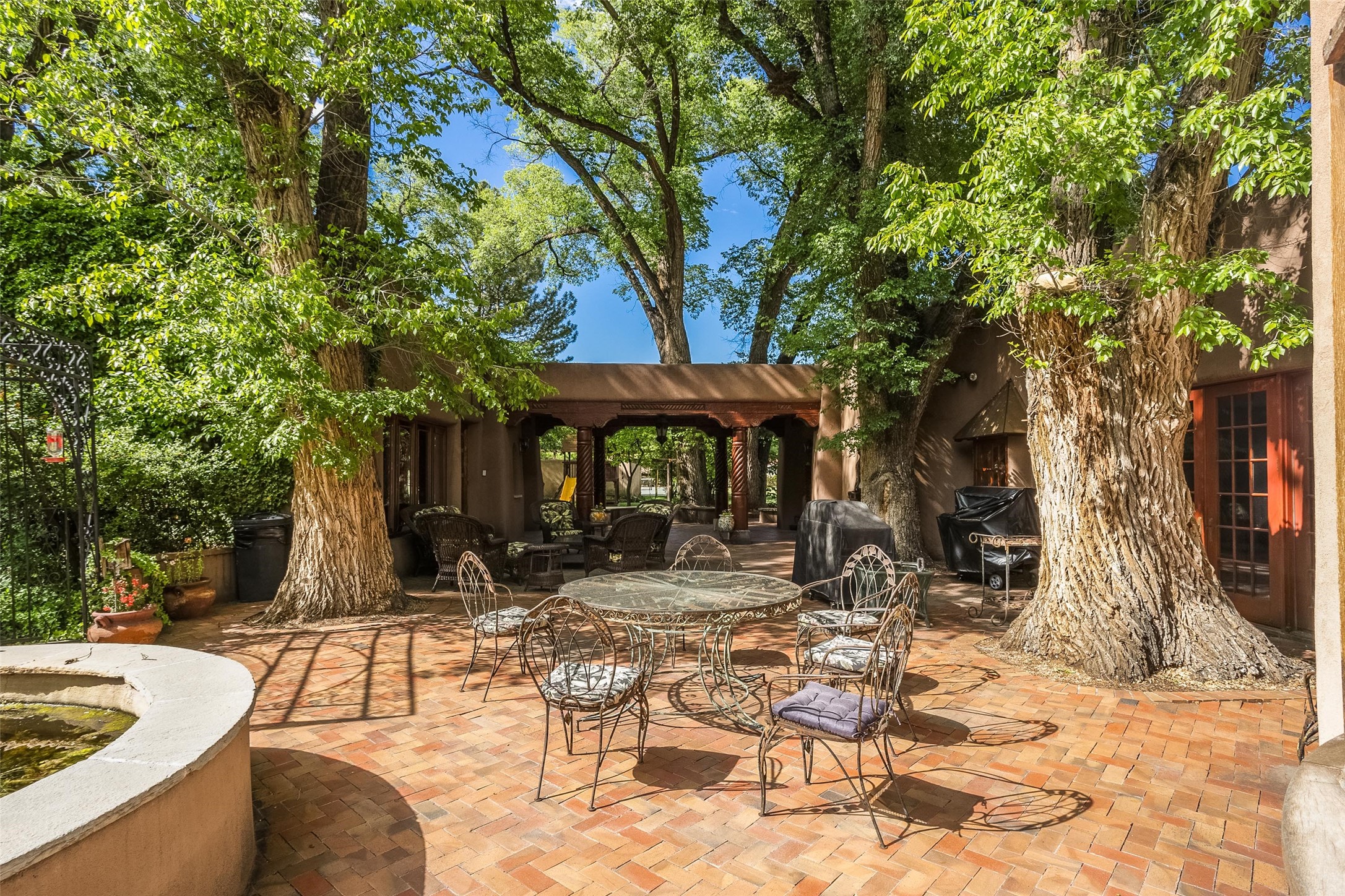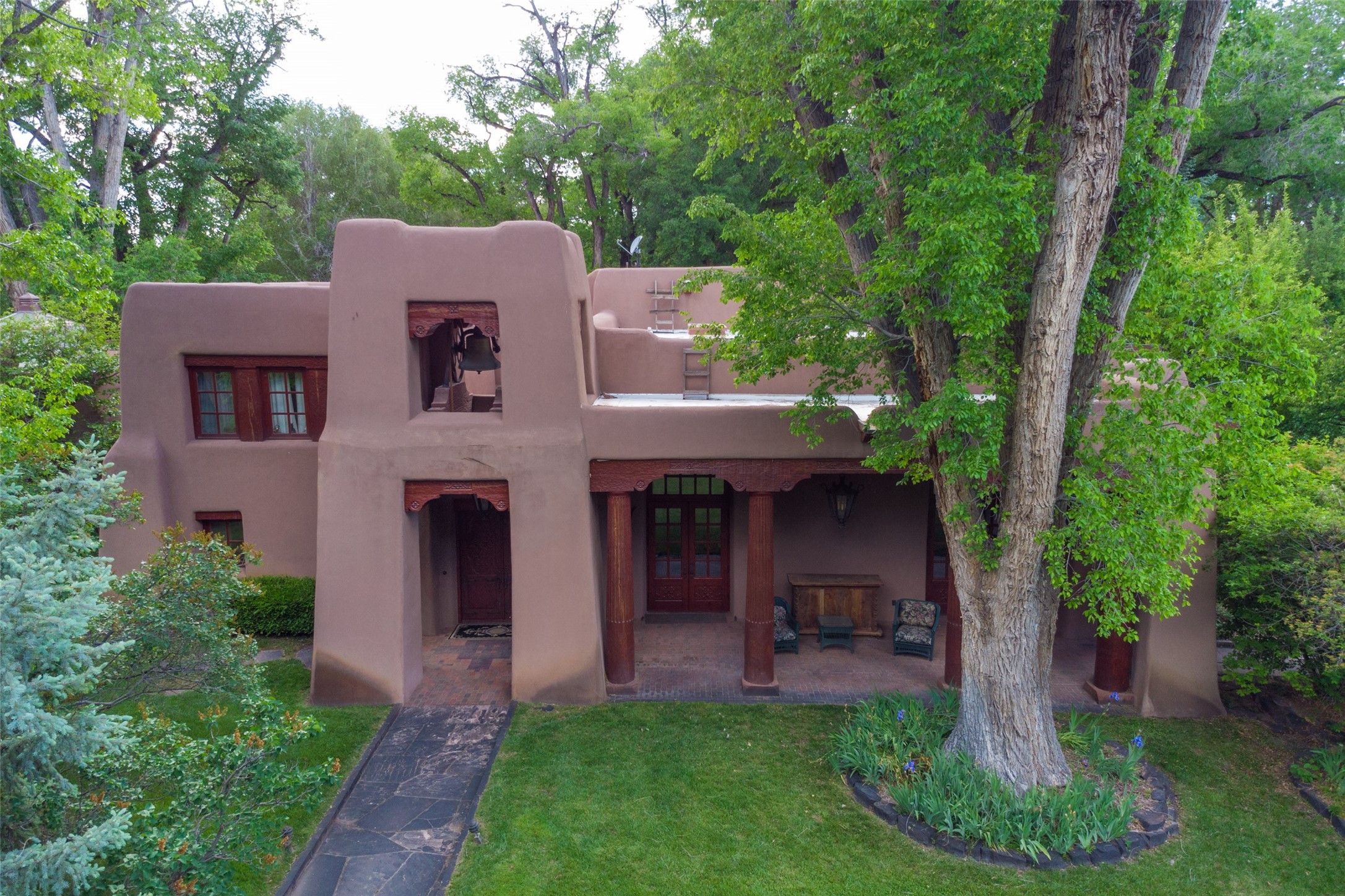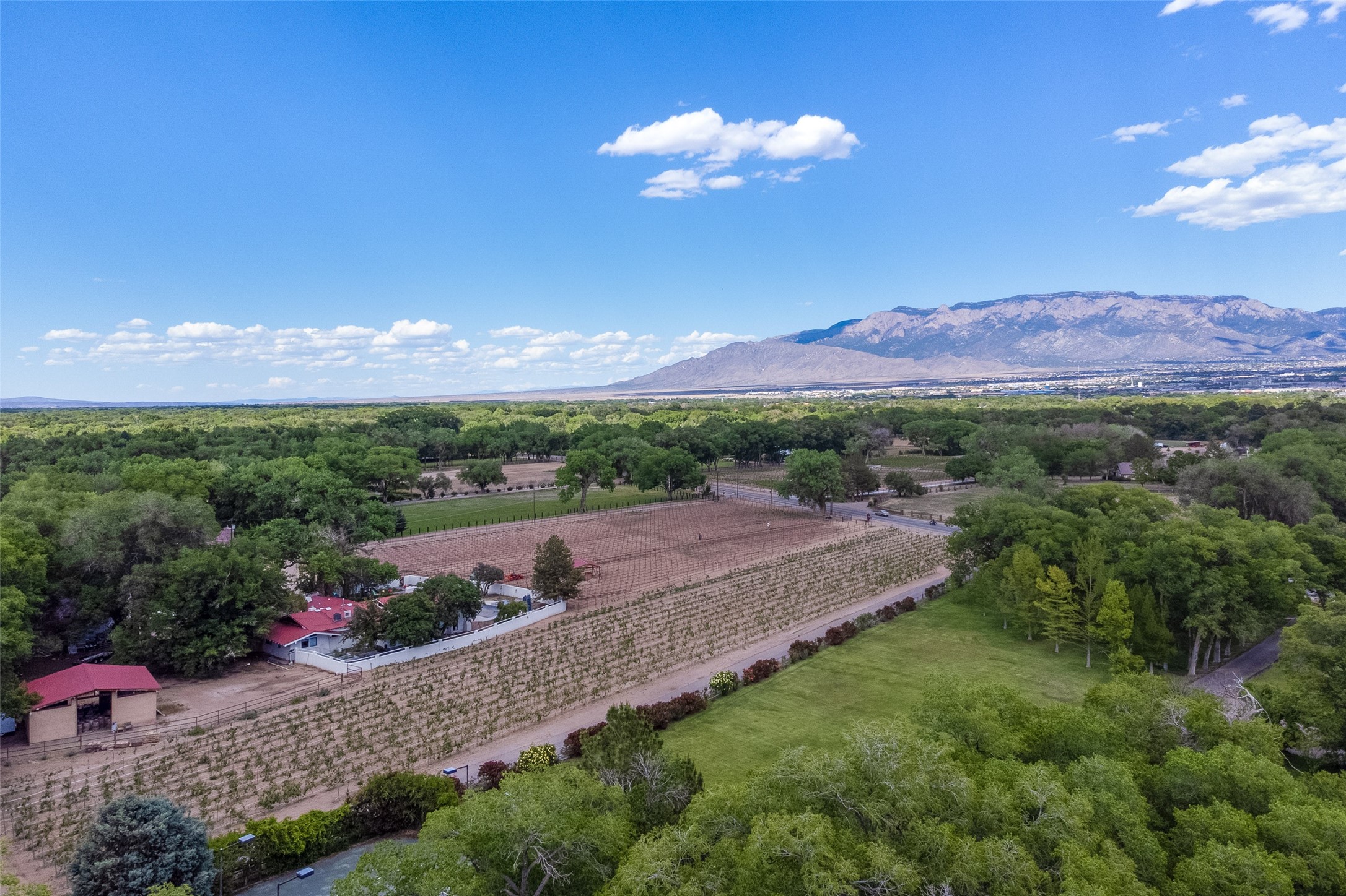 This one of a kind property in the North Valley of Los Ranchos de Albuquerque offers a unique opportunity to own a piece of history and luxury in a picturesque setting. This original 1850s ranch, located in Los Ranchos de Albuquerque, spans over 8 acres of beautifully landscaped yards, adorned with 100-year-old trees. The property also boasts 2 acres of vineyard, producing award-winning grapes for world-class wines. Rare 1906 water rights on the property, but also the connivence of city water to the house.The main house, constructed around the original 19th century ranch house, with over 9000 square feet of Double Adobe, exudes timeless elegance. Its hand-carved wood doors, massive carved wood beams, and soaring ceilings reflect the craftsmanship of a bygone era.The attention to detail is evident in the hand-painted ceiling of the piano room and the dedicated wine room. A Bell tower greets you at the main entrance, with an antique bell and massive carved wood doors. Step back in time as you stroll through the portal with hand carved doors and tapered wood pillars leading to the open patio and garden area.For those who appreciate outdoor activities, the property features one of the only clay tennis courts in New Mexico, offering a unique recreational opportunity. Additionally, a spacious 4-car garage with a workshop, remodeled greenhouse provides ample space for hobbies and storage. A 670sf Casita or Bonus room constructed with the same detail as the main house awaits your vision. A duplex with bedrooms, full baths, fireplaces, sit on top of the 4 car garage with mountain views and private entrances, a very inviting living space.This property is not just a home; it's a testament to history, craftsmanship, and luxury living. It offers a rare combination of natural beauty, historical significance, and modern amenities. Whether you're drawn to the allure of winemaking or seeking a serene retreat in a stunning landscape,