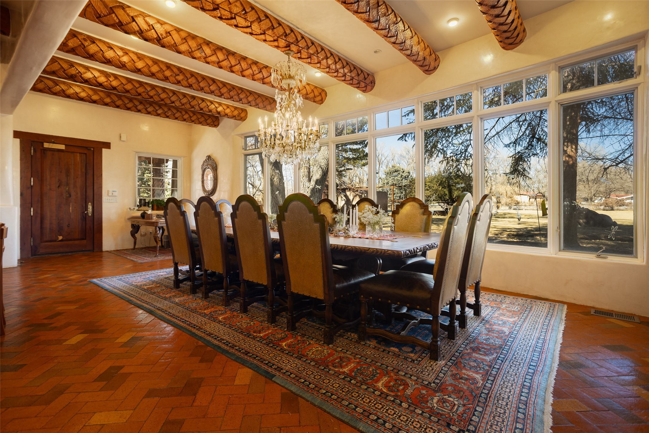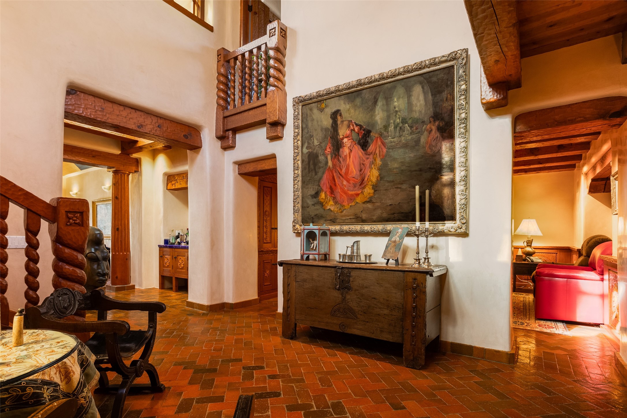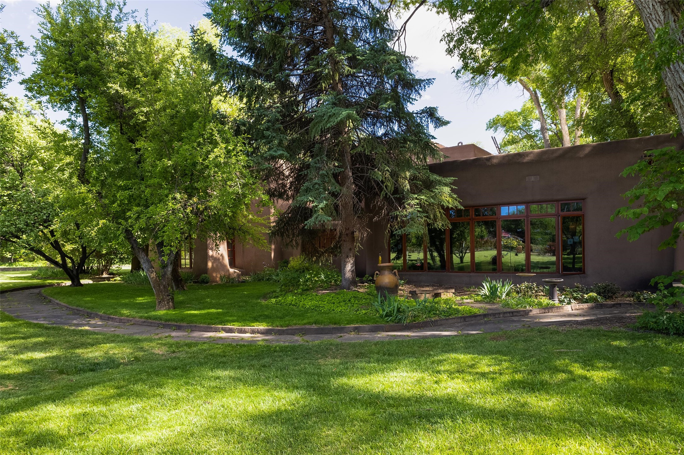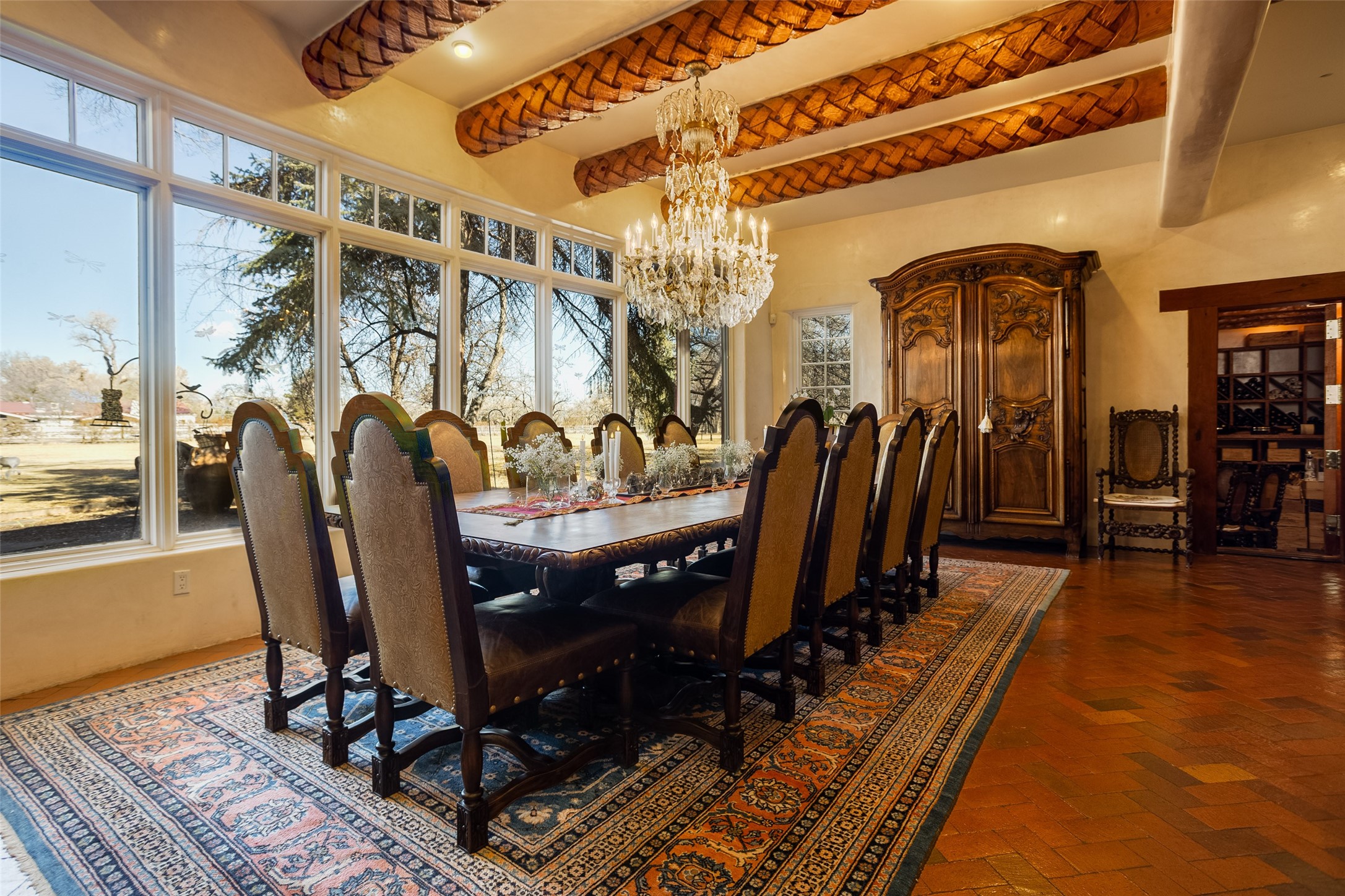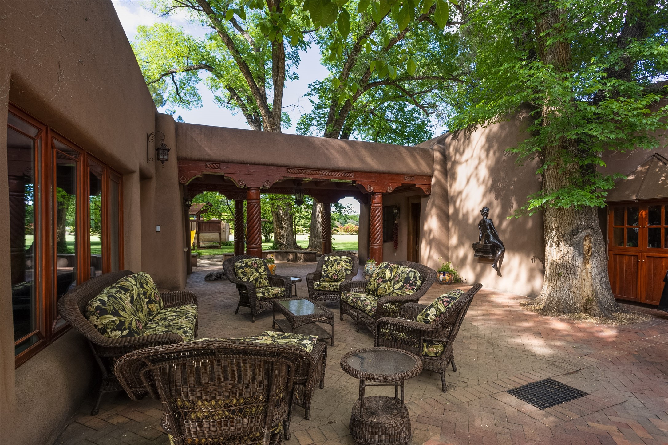 This one of a kind property in the North Valley of Los Ranchos de Albuquerque offers a unique opportunity to own a piece of history and luxury in a picturesque setting. This original 1850s ranch, located in Los Ranchos de Albuquerque, spans over 8 acres of beautifully landscaped yards, adorned with 100-year-old trees. The property also boasts 2 acres of vineyard, producing award-winning grapes for world-class wines. Rare 1906 water rights on the property, but also the connivence of city water to the house.The main house, constructed around the original 19th century ranch house, with over 9000 square feet of Double Adobe, exudes timeless elegance. Its hand-carved wood doors, massive carved wood beams, and soaring ceilings reflect the craftsmanship of a bygone era.The attention to detail is evident in the hand-painted ceiling of the piano room and the dedicated wine room. A Bell tower greets you at the main entrance, with an antique bell and massive carved wood doors. Step back in time as you stroll through the portal with hand carved doors and tapered wood pillars leading to the open patio and garden area.For those who appreciate outdoor activities, the property features one of the only clay tennis courts in New Mexico, offering a unique recreational opportunity. Additionally, a spacious 4-car garage with a workshop, remodeled greenhouse provides ample space for hobbies and storage. A 670sf Casita or Bonus room constructed with the same detail as the main house awaits your vision. A duplex with bedrooms, full baths, fireplaces, sit on top of the 4 car garage with mountain views and private entrances, a very inviting living space.This property is not just a home; it's a testament to history, craftsmanship, and luxury living. It offers a rare combination of natural beauty, historical significance, and modern amenities. Whether you're drawn to the allure of winemaking or seeking a serene retreat in a stunning landscape,