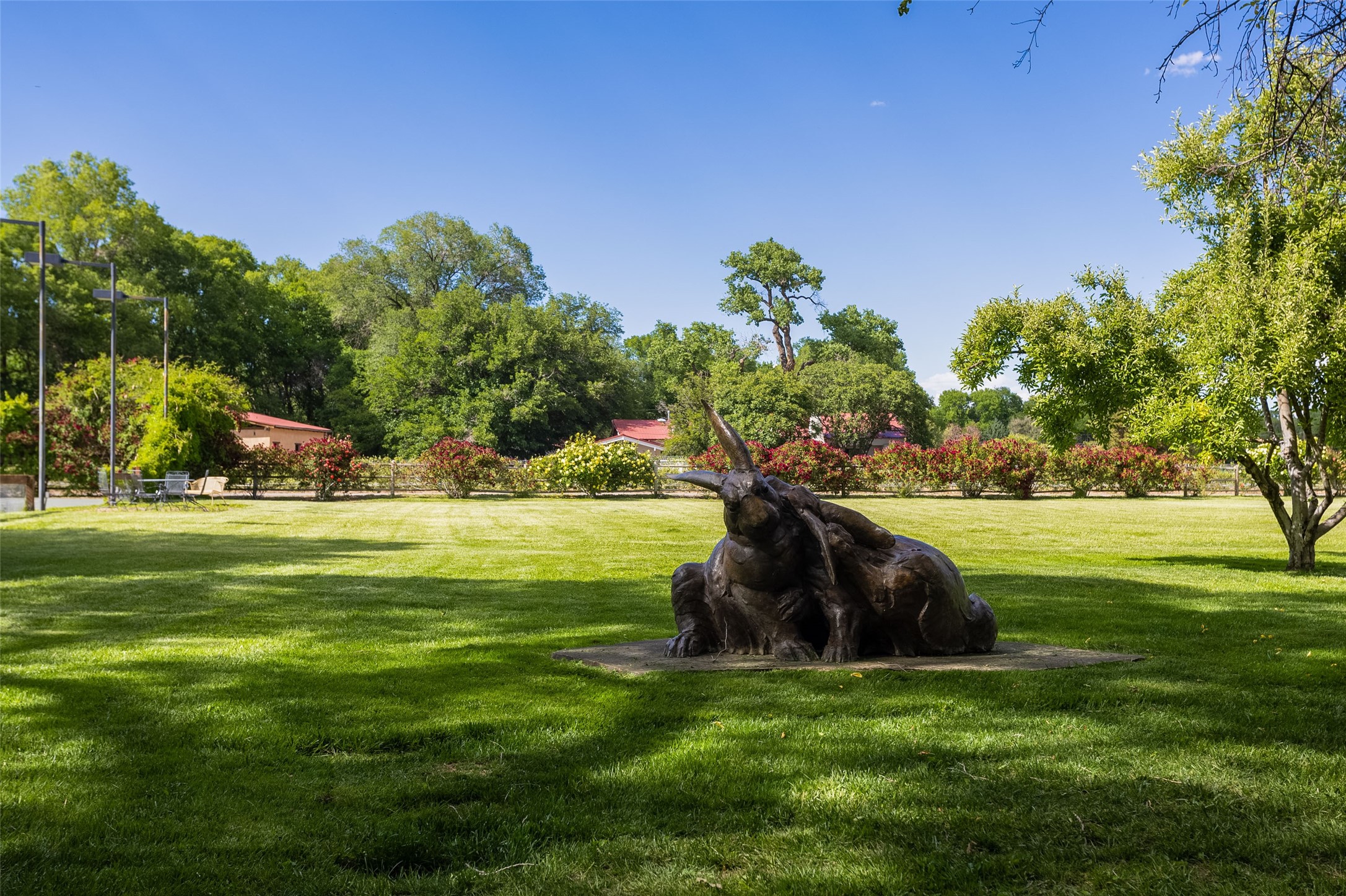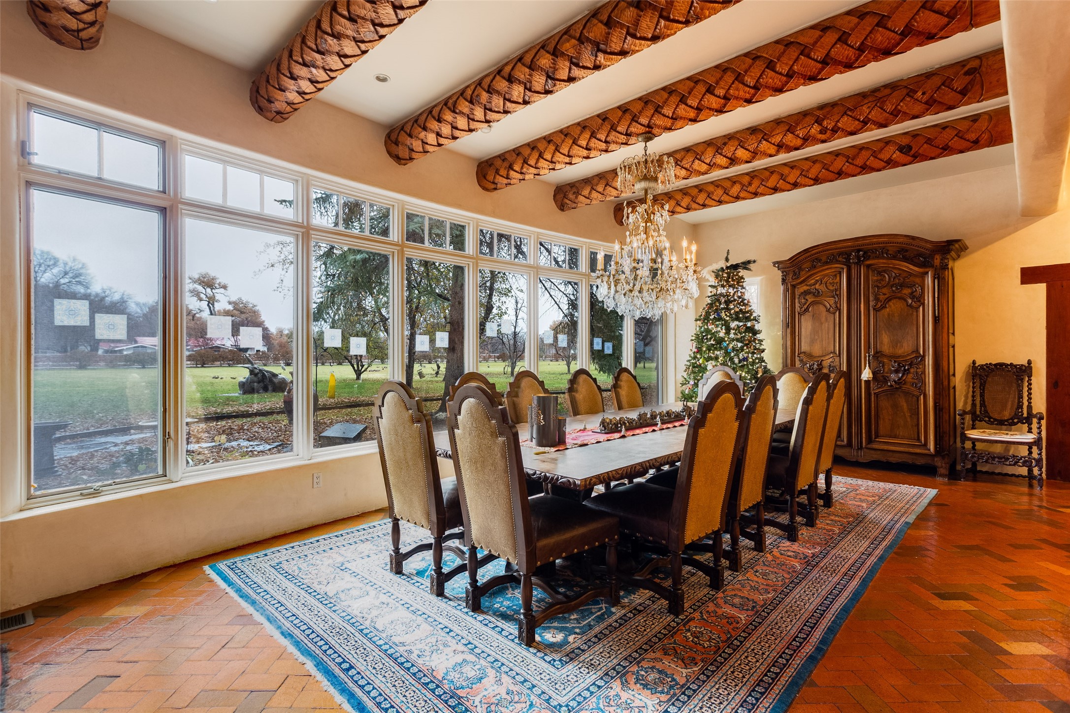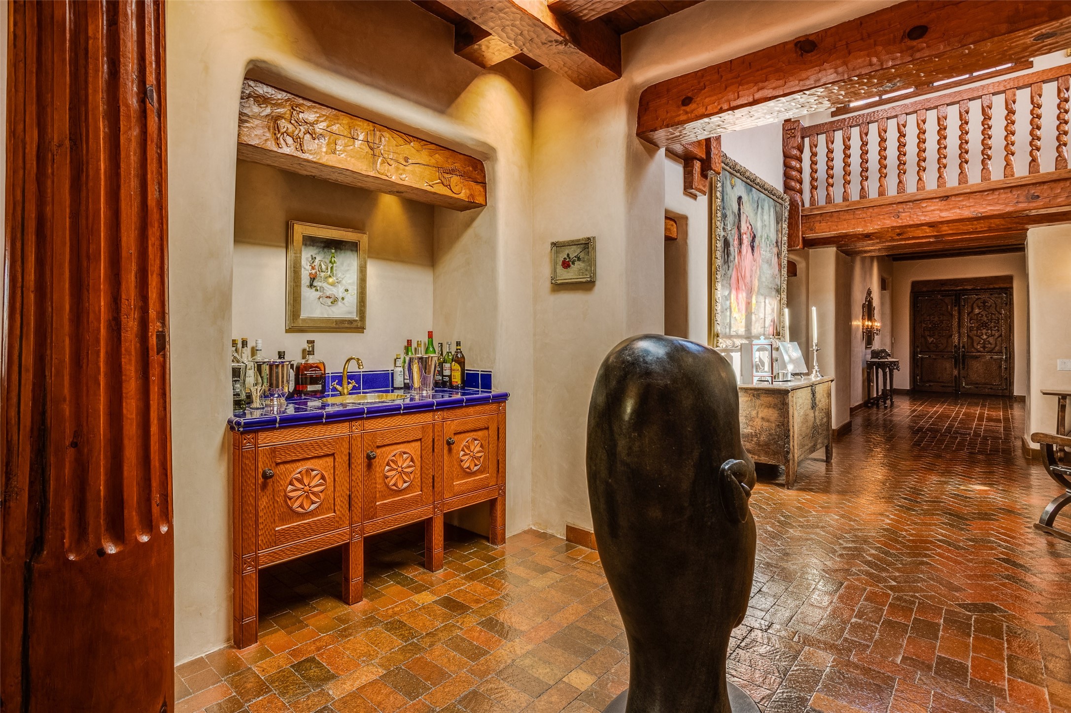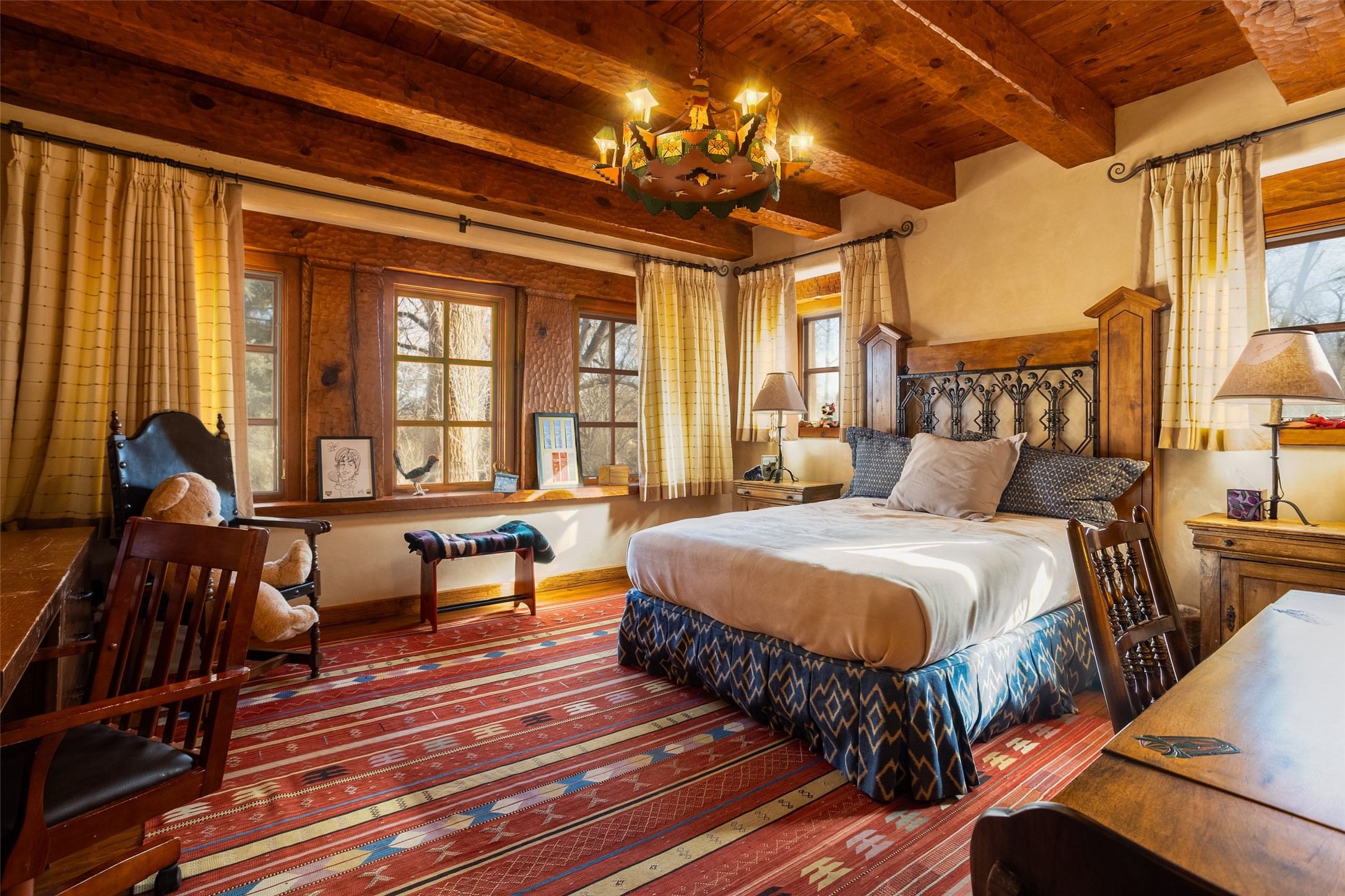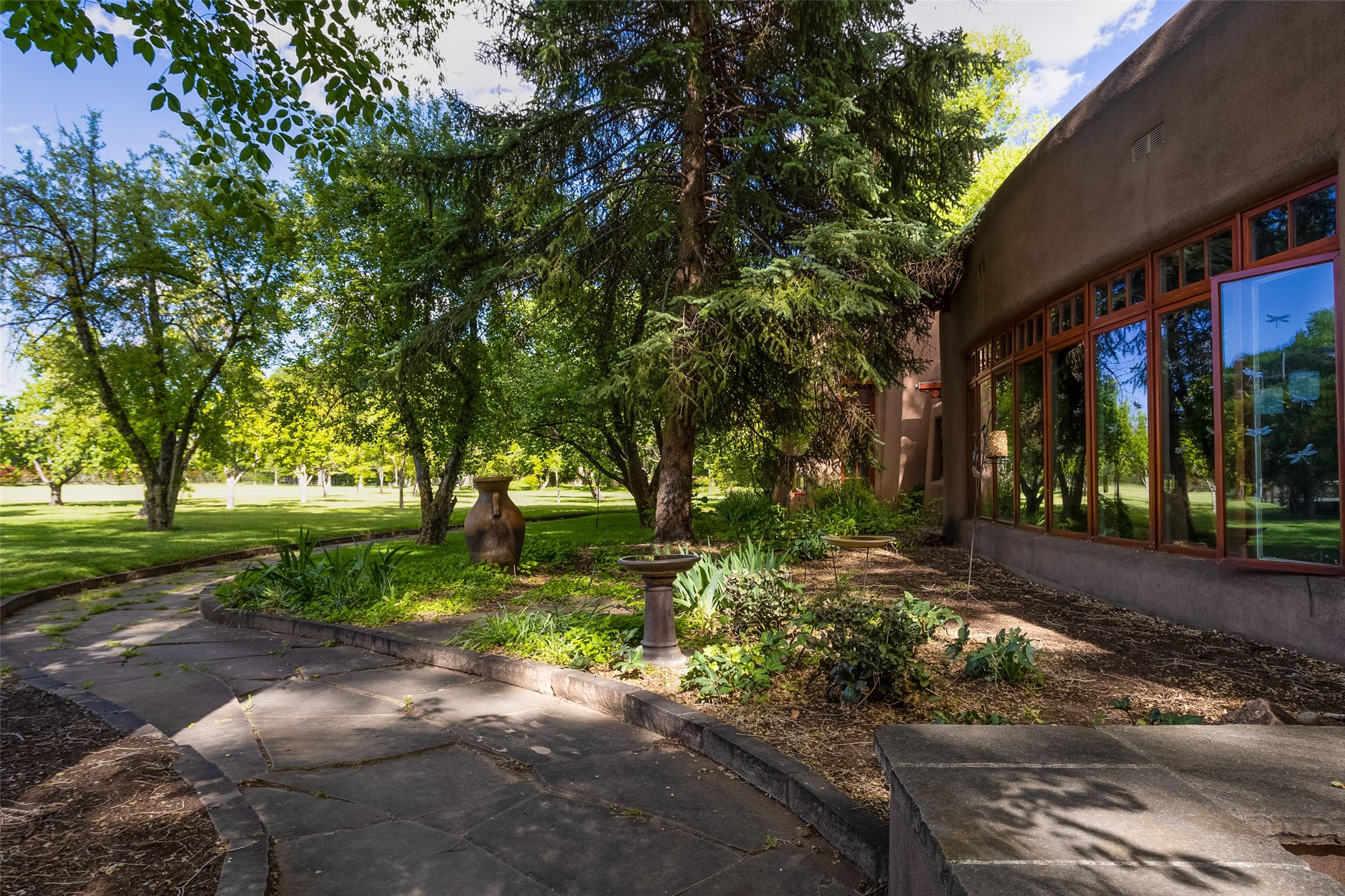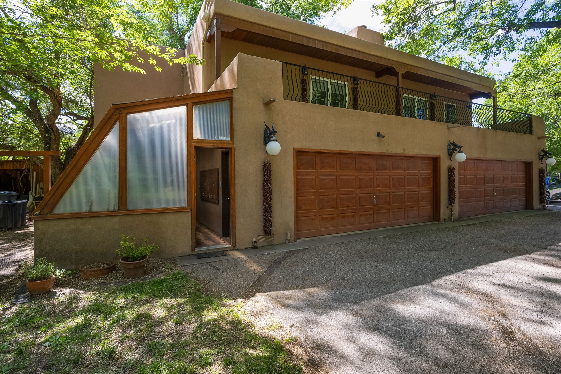 This one of a kind property in the North Valley of Los Ranchos de Albuquerque offers a unique opportunity to own a piece of history and luxury in a picturesque setting. This original 1850s ranch, located in Los Ranchos de Albuquerque, spans over 8 acres of beautifully landscaped yards, adorned with 100-year-old trees. The property also boasts 2 acres of vineyard, producing award-winning grapes for world-class wines. Rare 1906 water rights on the property, but also the connivence of city water to the house.The main house, constructed around the original 19th century ranch house, with over 9000 square feet of Double Adobe, exudes timeless elegance. Its hand-carved wood doors, massive carved wood beams, and soaring ceilings reflect the craftsmanship of a bygone era.The attention to detail is evident in the hand-painted ceiling of the piano room and the dedicated wine room. A Bell tower greets you at the main entrance, with an antique bell and massive carved wood doors. Step back in time as you stroll through the portal with hand carved doors and tapered wood pillars leading to the open patio and garden area.For those who appreciate outdoor activities, the property features one of the only clay tennis courts in New Mexico, offering a unique recreational opportunity. Additionally, a spacious 4-car garage with a workshop, remodeled greenhouse provides ample space for hobbies and storage. A 670sf Casita or Bonus room constructed with the same detail as the main house awaits your vision. A duplex with bedrooms, full baths, fireplaces, sit on top of the 4 car garage with mountain views and private entrances, a very inviting living space.This property is not just a home; it's a testament to history, craftsmanship, and luxury living. It offers a rare combination of natural beauty, historical significance, and modern amenities. Whether you're drawn to the allure of winemaking or seeking a serene retreat in a stunning landscape,