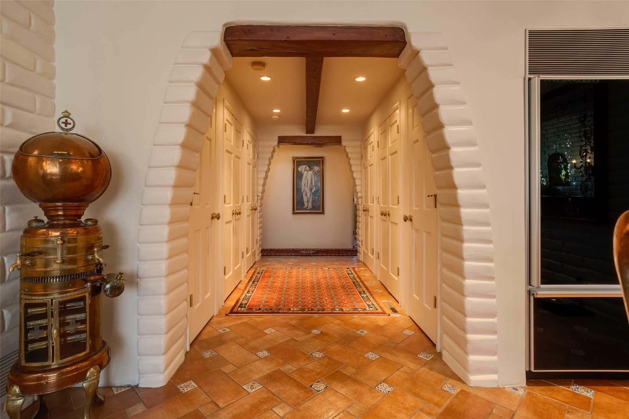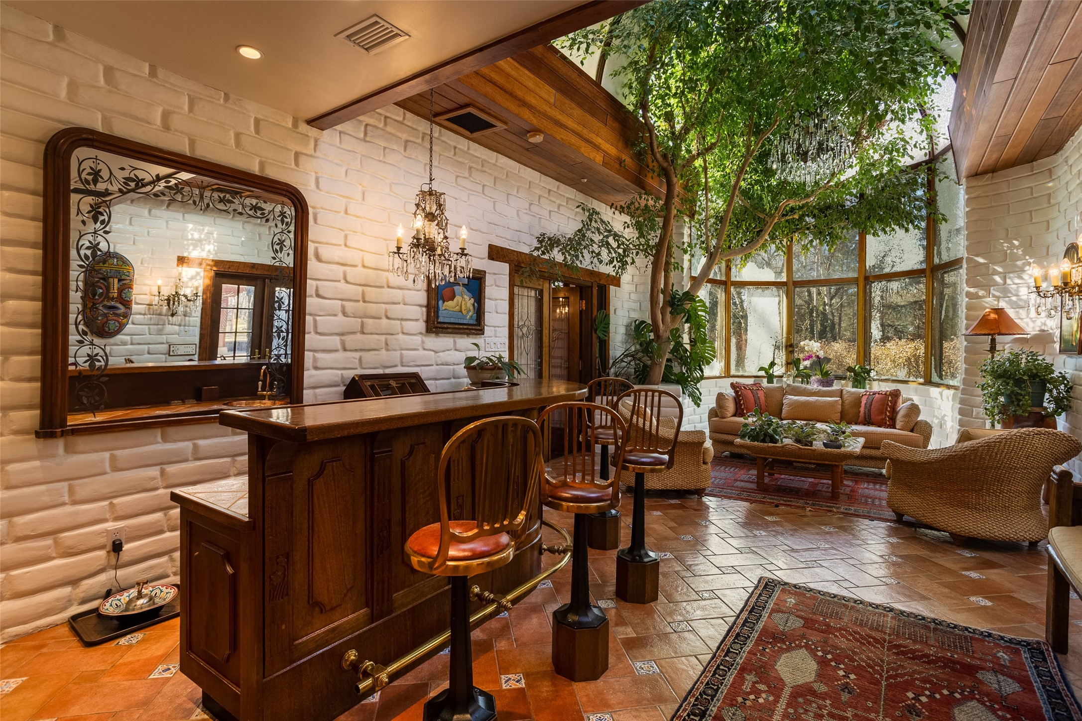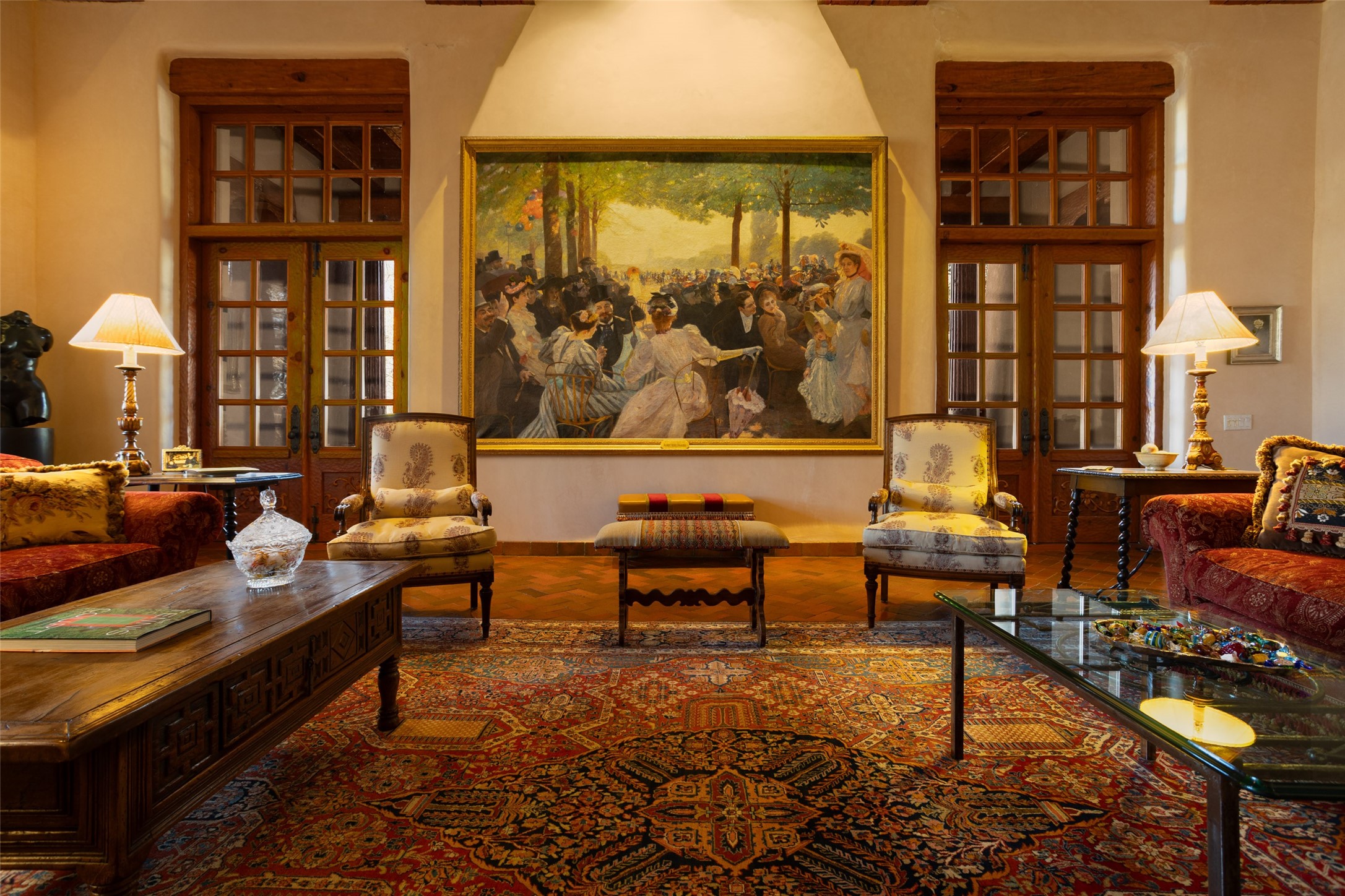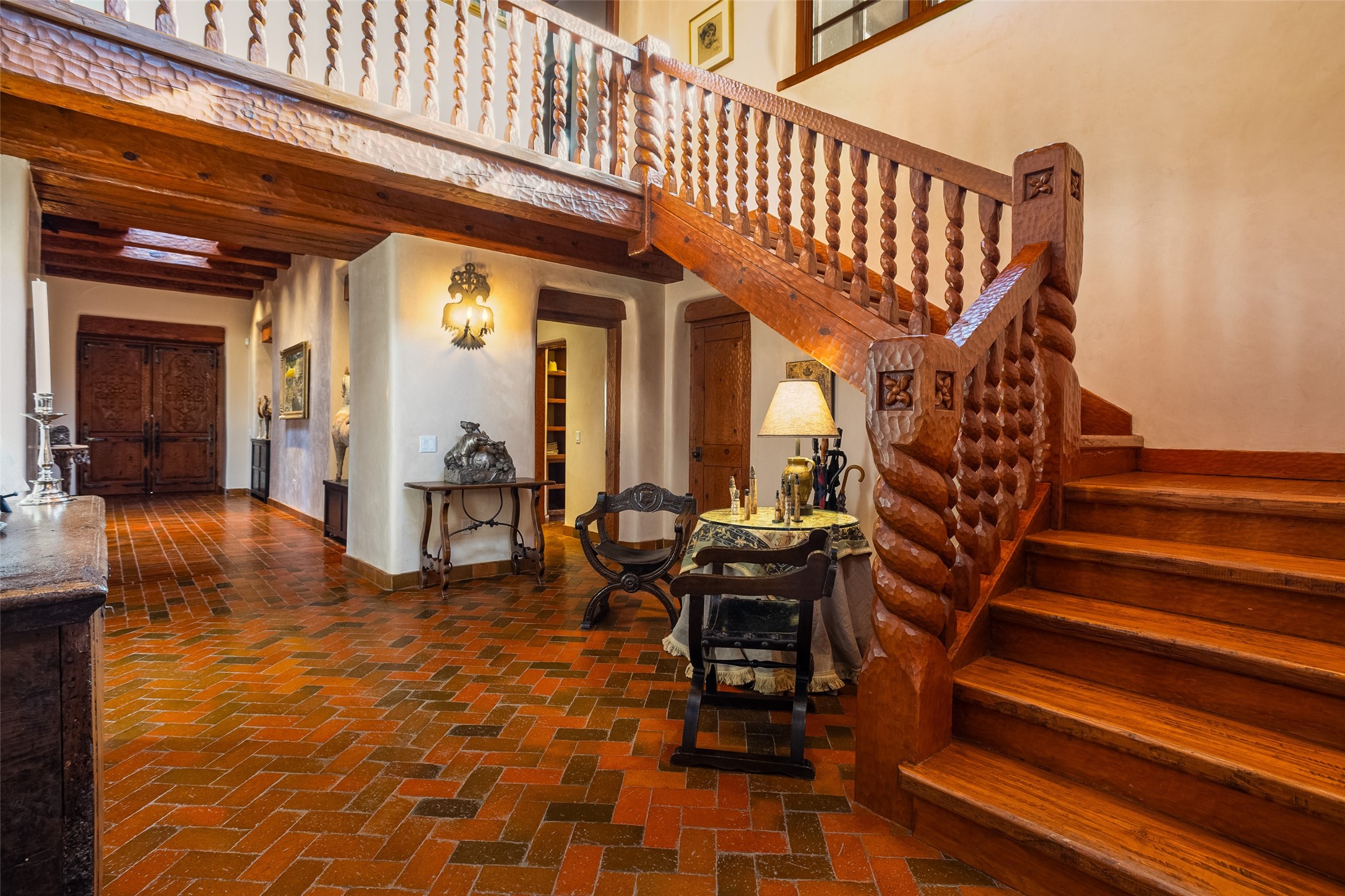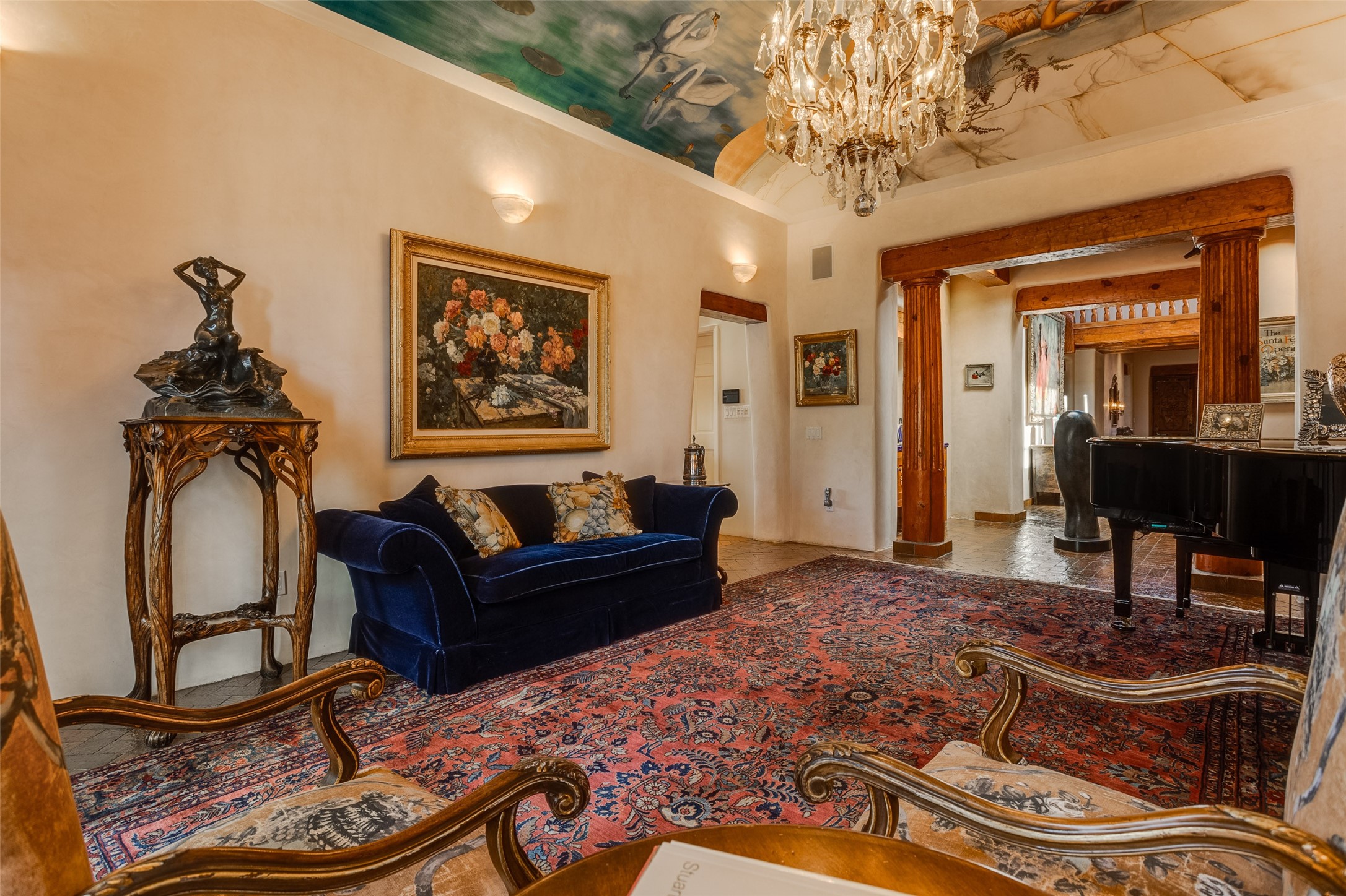 This one of a kind property in the North Valley of Los Ranchos de Albuquerque offers a unique opportunity to own a piece of history and luxury in a picturesque setting. This original 1850s ranch, located in Los Ranchos de Albuquerque, spans over 8 acres of beautifully landscaped yards, adorned with 100-year-old trees. The property also boasts 2 acres of vineyard, producing award-winning grapes for world-class wines. Rare 1906 water rights on the property, but also the connivence of city water to the house.The main house, constructed around the original 19th century ranch house, with over 9000 square feet of Double Adobe, exudes timeless elegance. Its hand-carved wood doors, massive carved wood beams, and soaring ceilings reflect the craftsmanship of a bygone era.The attention to detail is evident in the hand-painted ceiling of the piano room and the dedicated wine room. A Bell tower greets you at the main entrance, with an antique bell and massive carved wood doors. Step back in time as you stroll through the portal with hand carved doors and tapered wood pillars leading to the open patio and garden area.For those who appreciate outdoor activities, the property features one of the only clay tennis courts in New Mexico, offering a unique recreational opportunity. Additionally, a spacious 4-car garage with a workshop, remodeled greenhouse provides ample space for hobbies and storage. A 670sf Casita or Bonus room constructed with the same detail as the main house awaits your vision. A duplex with bedrooms, full baths, fireplaces, sit on top of the 4 car garage with mountain views and private entrances, a very inviting living space.This property is not just a home; it's a testament to history, craftsmanship, and luxury living. It offers a rare combination of natural beauty, historical significance, and modern amenities. Whether you're drawn to the allure of winemaking or seeking a serene retreat in a stunning landscape,