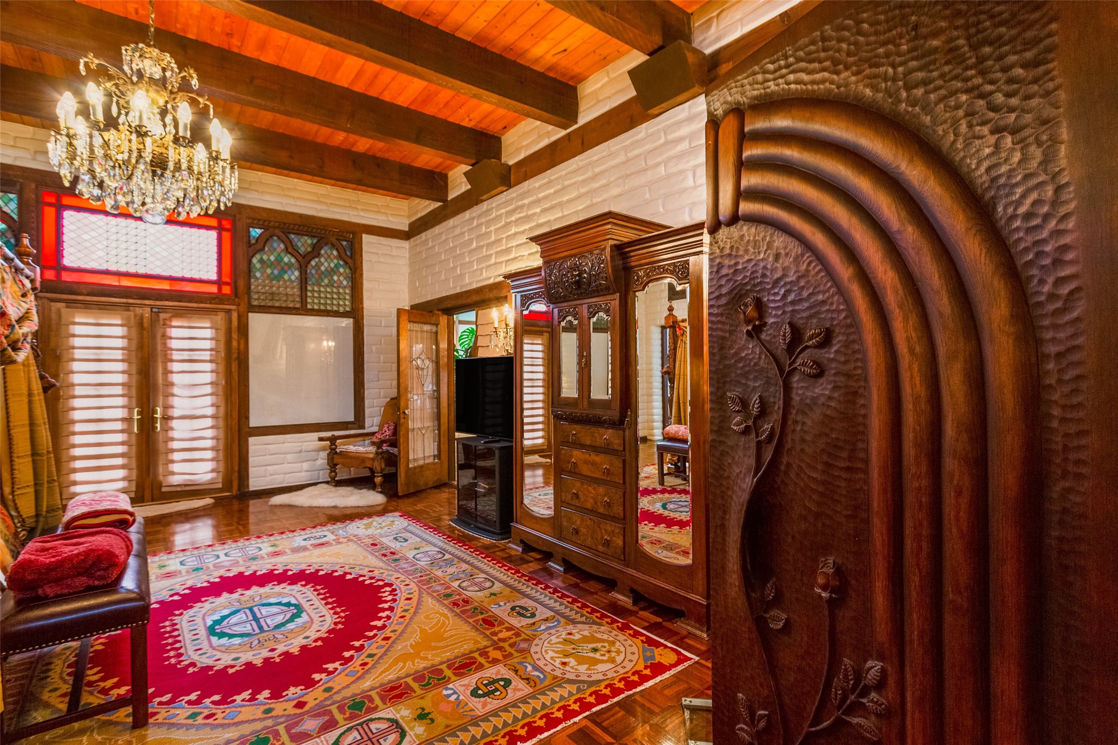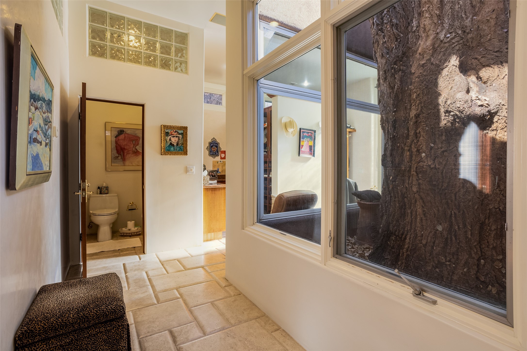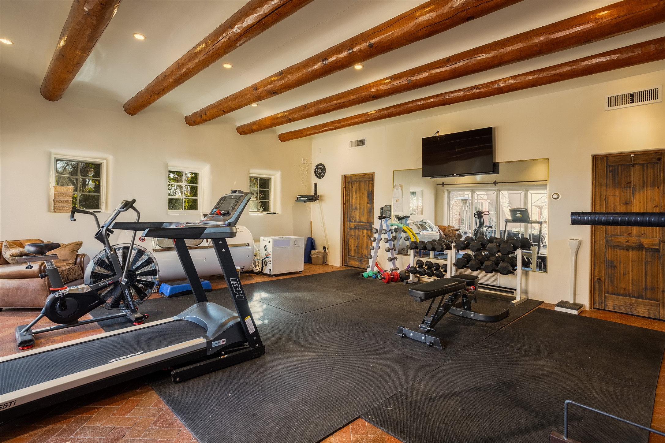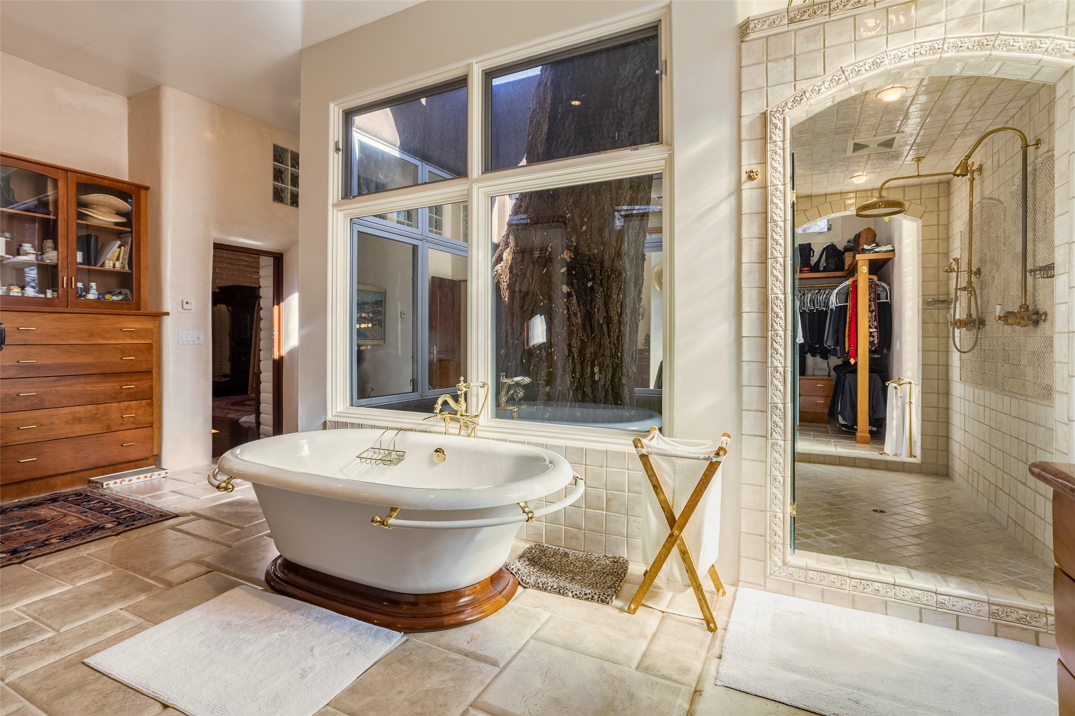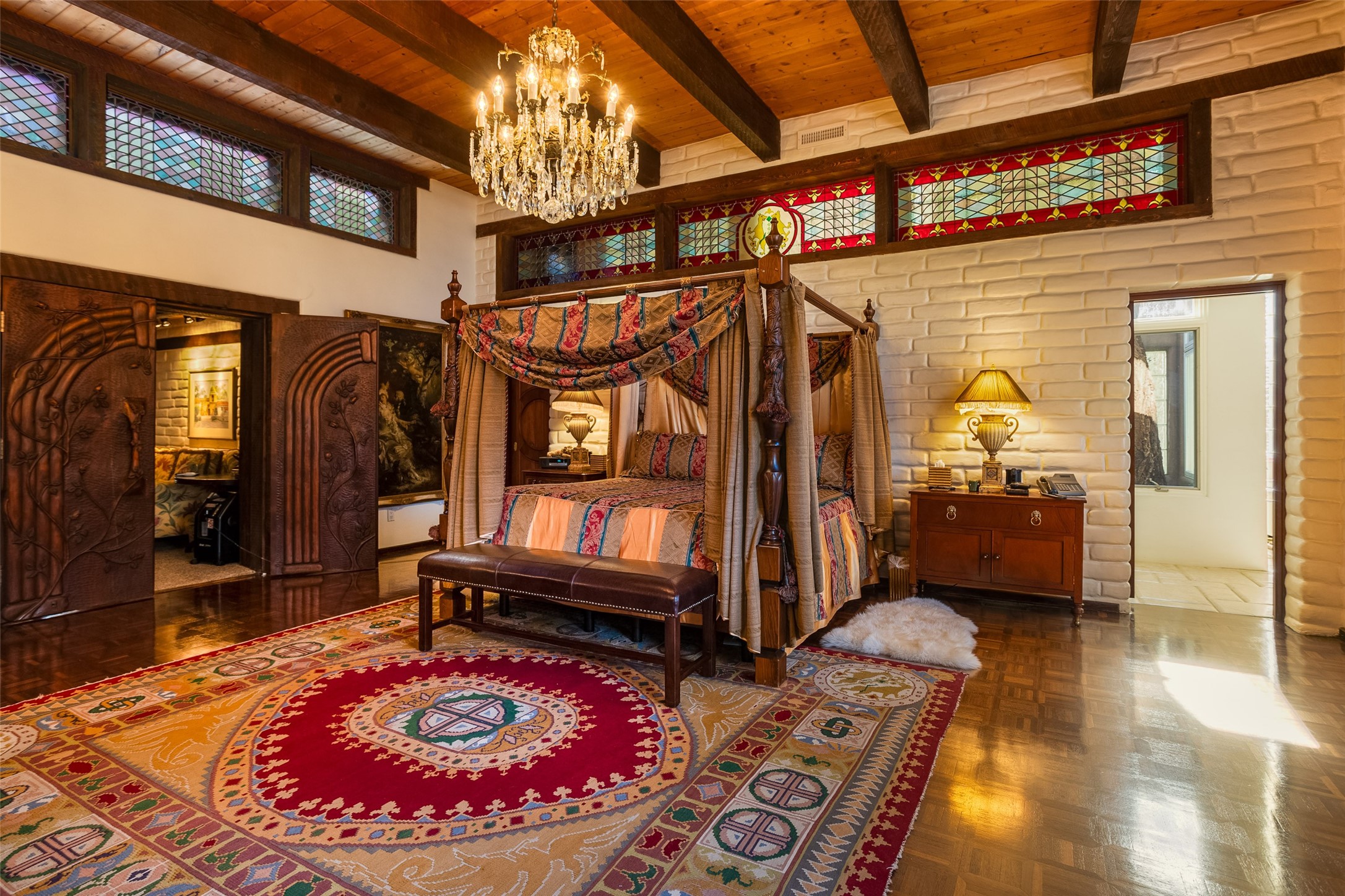 This one of a kind property in the North Valley of Los Ranchos de Albuquerque offers a unique opportunity to own a piece of history and luxury in a picturesque setting. This original 1850s ranch, located in Los Ranchos de Albuquerque, spans over 8 acres of beautifully landscaped yards, adorned with 100-year-old trees. The property also boasts 2 acres of vineyard, producing award-winning grapes for world-class wines. Rare 1906 water rights on the property, but also the connivence of city water to the house.The main house, constructed around the original 19th century ranch house, with over 9000 square feet of Double Adobe, exudes timeless elegance. Its hand-carved wood doors, massive carved wood beams, and soaring ceilings reflect the craftsmanship of a bygone era.The attention to detail is evident in the hand-painted ceiling of the piano room and the dedicated wine room. A Bell tower greets you at the main entrance, with an antique bell and massive carved wood doors. Step back in time as you stroll through the portal with hand carved doors and tapered wood pillars leading to the open patio and garden area.For those who appreciate outdoor activities, the property features one of the only clay tennis courts in New Mexico, offering a unique recreational opportunity. Additionally, a spacious 4-car garage with a workshop, remodeled greenhouse provides ample space for hobbies and storage. A 670sf Casita or Bonus room constructed with the same detail as the main house awaits your vision. A duplex with bedrooms, full baths, fireplaces, sit on top of the 4 car garage with mountain views and private entrances, a very inviting living space.This property is not just a home; it's a testament to history, craftsmanship, and luxury living. It offers a rare combination of natural beauty, historical significance, and modern amenities. Whether you're drawn to the allure of winemaking or seeking a serene retreat in a stunning landscape,