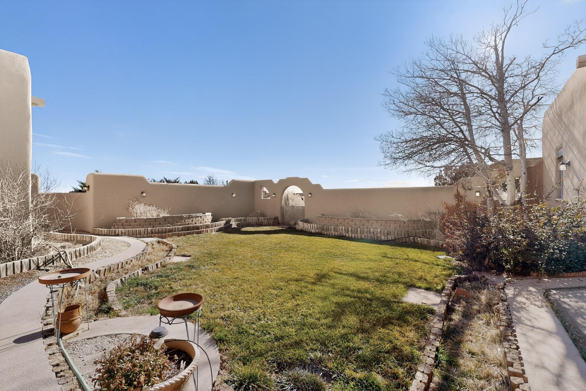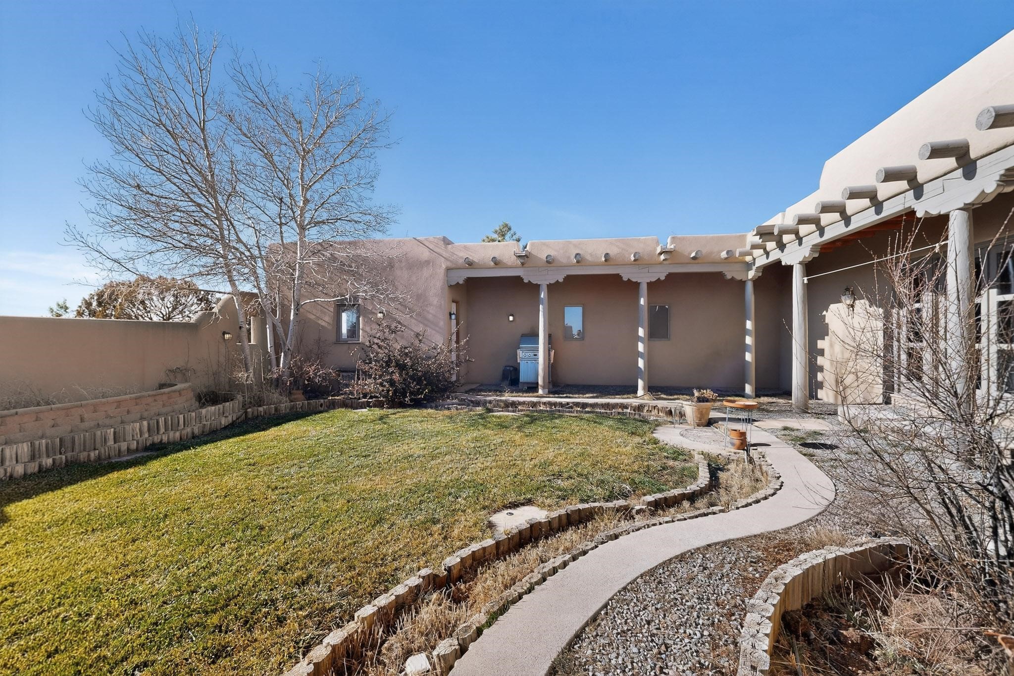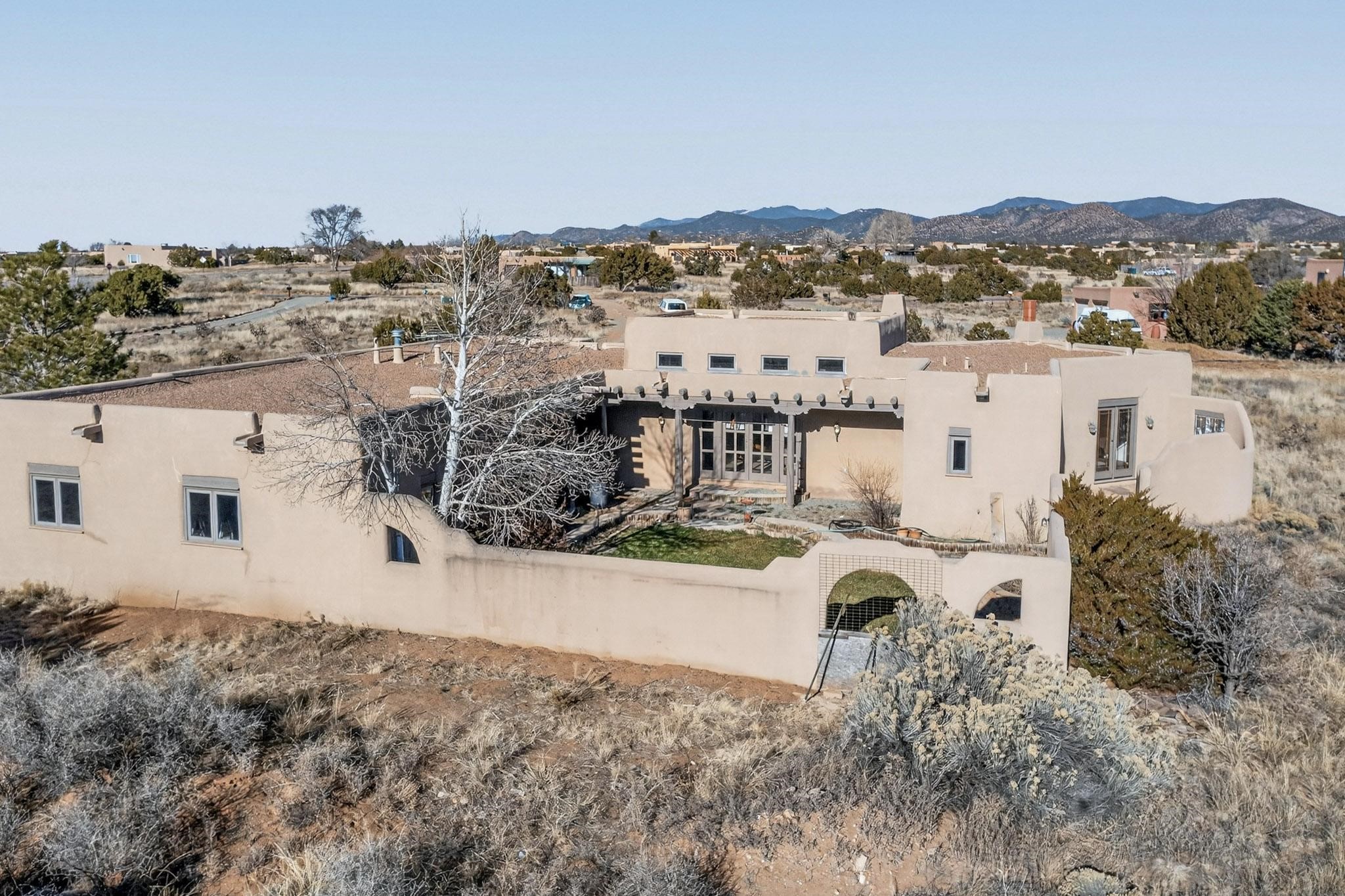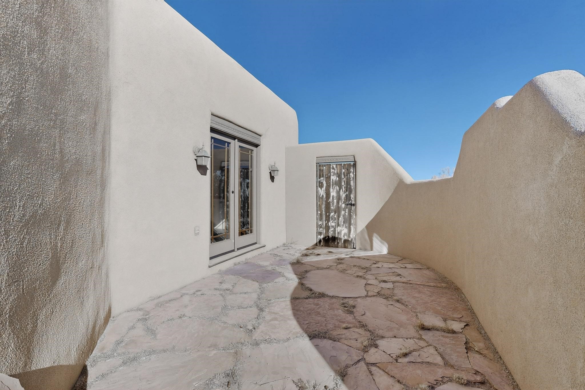 First time on the market! This charming Eldorado oasis has magnificent western views, a private back yard enclosed by curving walls and established plantings. The large kitchen has cabinets created by a local Santa Fe carpenter, plenty of room to prep and entertain your guests has with an adjacent dining area and a spacious great room with a kiva fireplace soaring ceilings and flagstone floors. Hand turned Vigas, and a herringbone wood ceiling contribute to the many authentic elements found in this Santa Fe home. French doors open to the oversized courtyard with a grass lawn, garden and a sprinkler system. Follow the coved hallway to the primary bedroom with another kiva fireplace, private patio and generous bathroom. This home is filled with natural light provided by French doors and windows. There is always a beautiful view from any window or door.