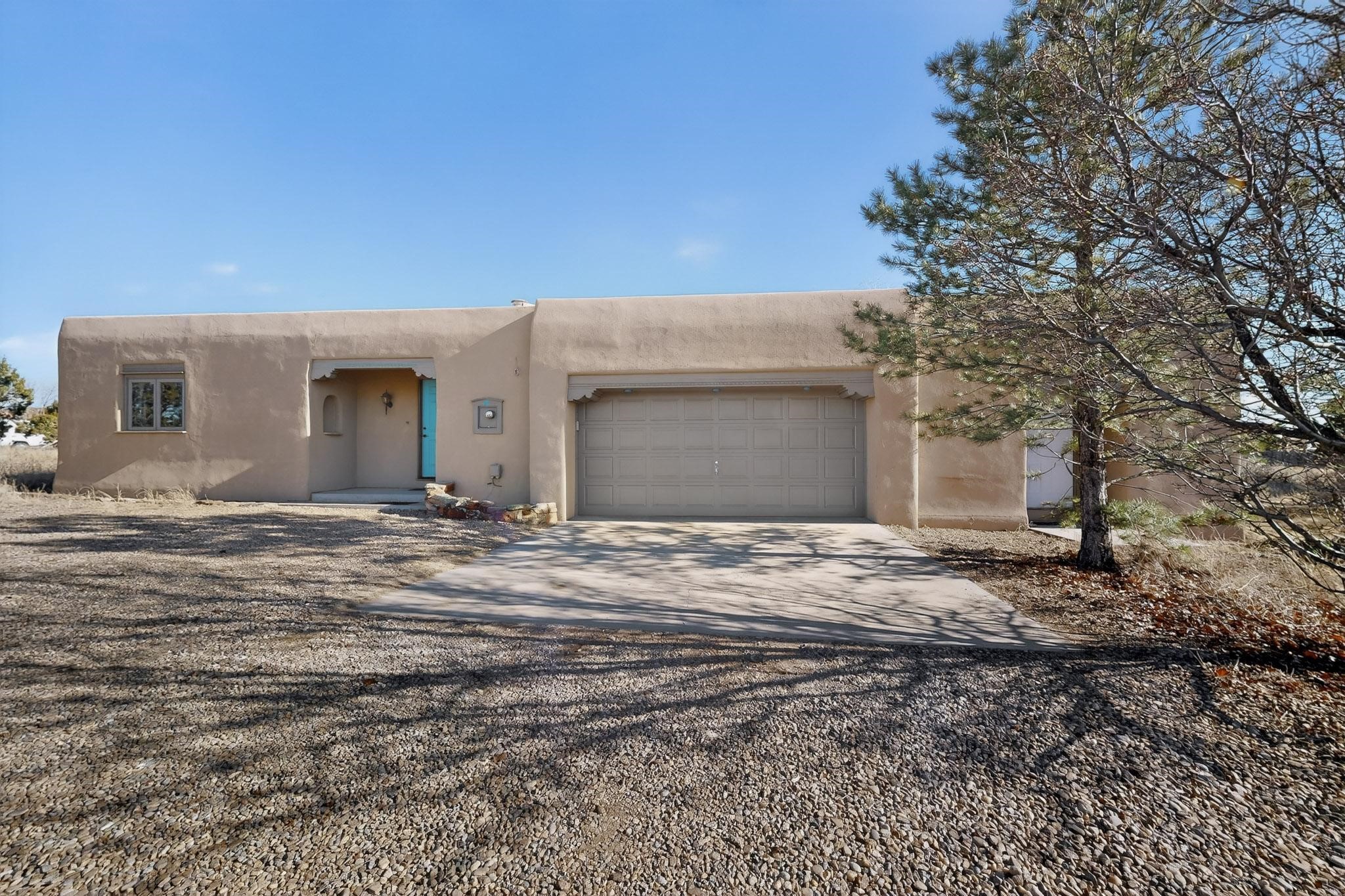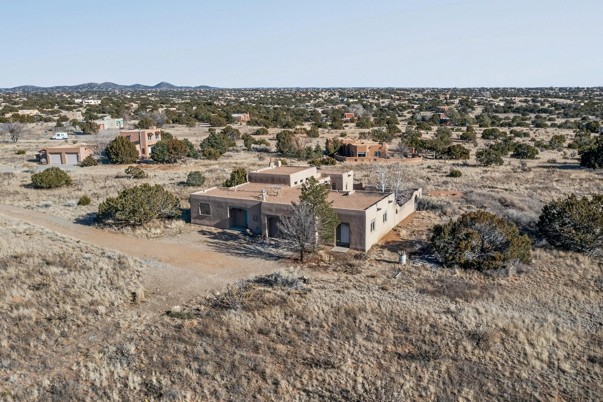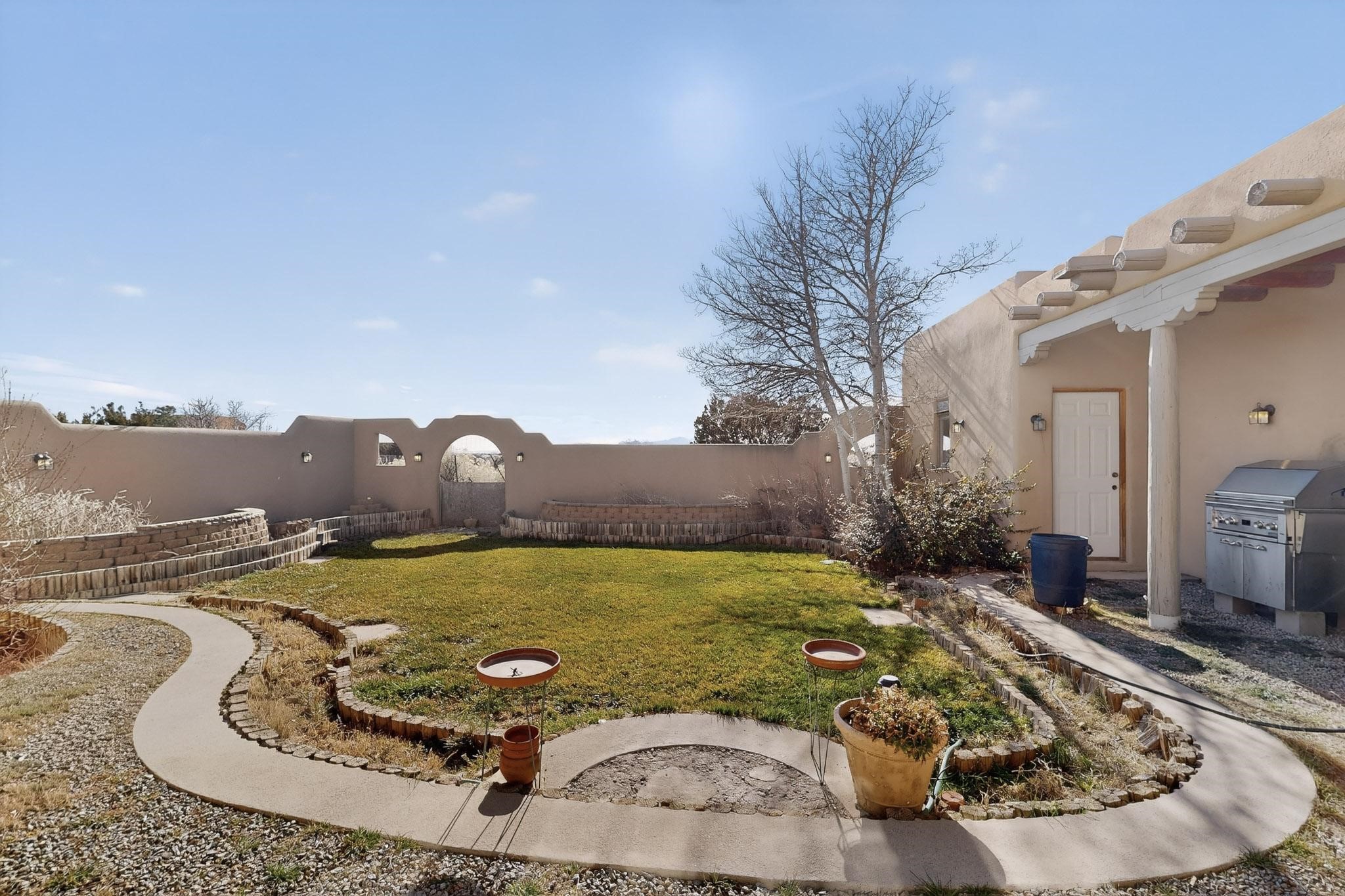First time on the market! This charming Eldorado oasis has magnificent western views, a private back yard enclosed by curving walls and established plantings. The large kitchen has cabinets created by a local Santa Fe carpenter, plenty of room to prep and entertain your guests has with an adjacent dining area and a spacious great room with a kiva fireplace soaring ceilings and flagstone floors. Hand turned Vigas, and a herringbone wood ceiling contribute to the many authentic elements found in this Santa Fe home. French doors open to the oversized courtyard with a grass lawn, garden and a sprinkler system. Follow the coved hallway to the primary bedroom with another kiva fireplace, private patio and generous bathroom. This home is filled with natural light provided by French doors and windows. There is always a beautiful view from any window or door.
