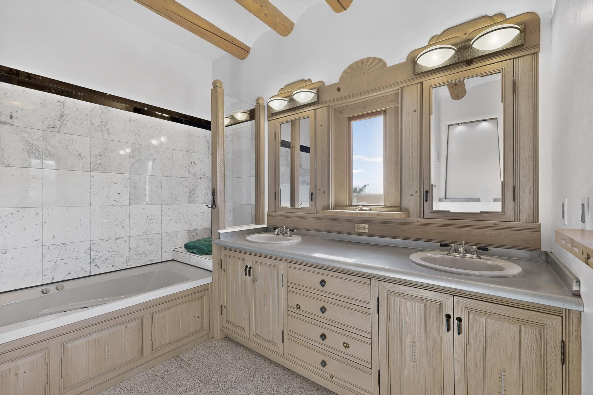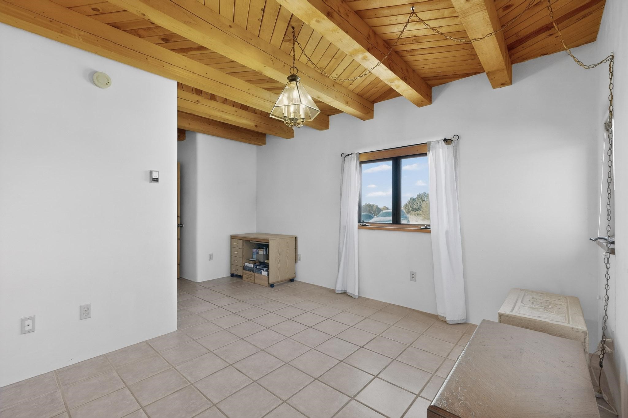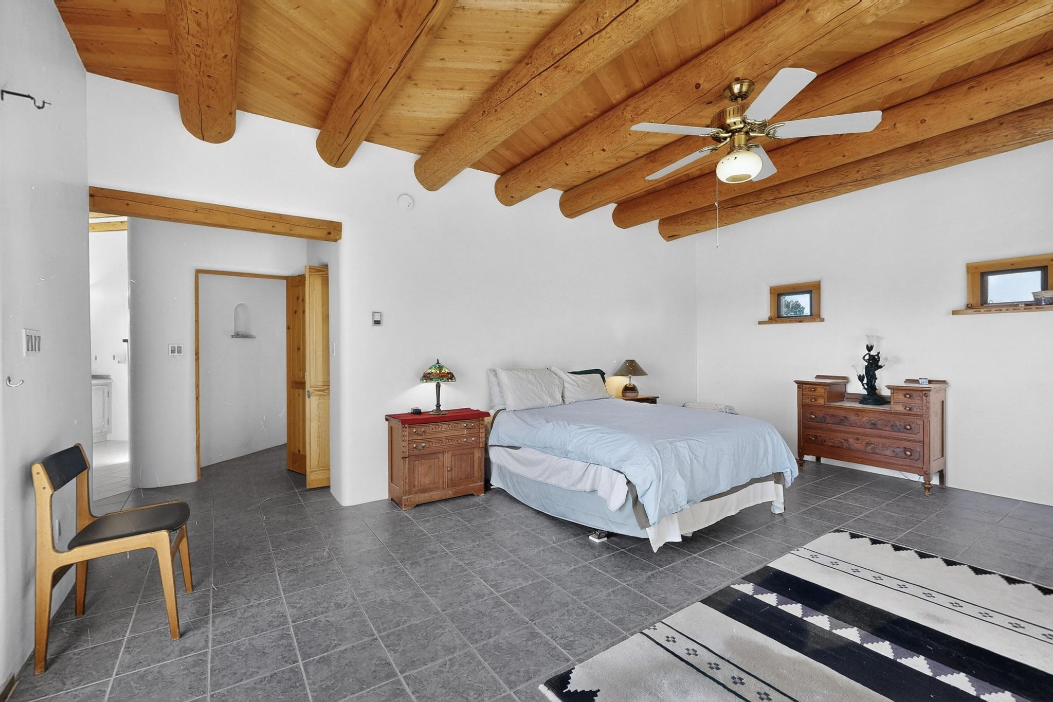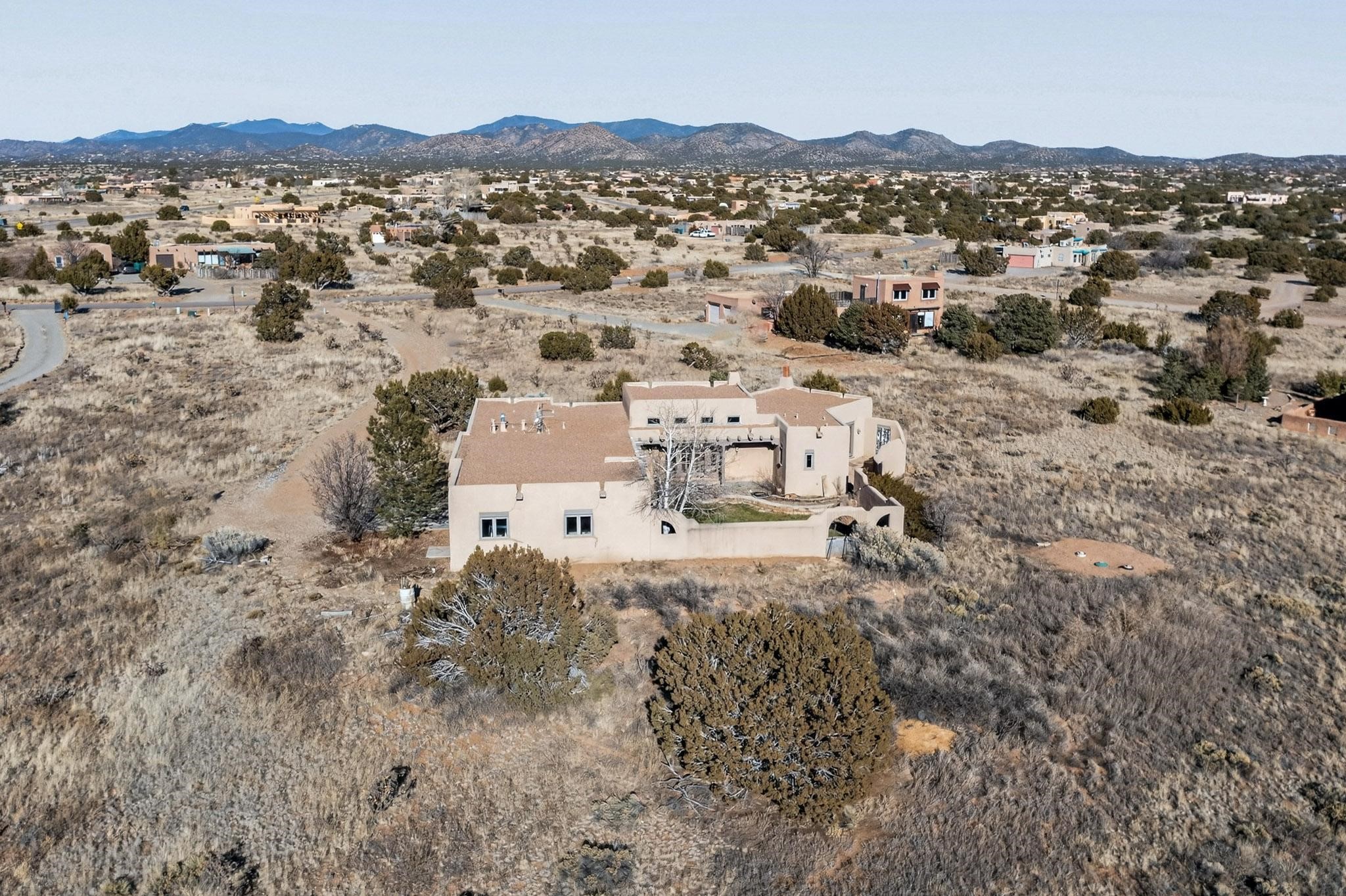 First time on the market! This charming Eldorado oasis has magnificent western views, a private back yard enclosed by curving walls and established plantings. The large kitchen has cabinets created by a local Santa Fe carpenter, plenty of room to prep and entertain your guests has with an adjacent dining area and a spacious great room with a kiva fireplace soaring ceilings and flagstone floors. Hand turned Vigas, and a herringbone wood ceiling contribute to the many authentic elements found in this Santa Fe home. French doors open to the oversized courtyard with a grass lawn, garden and a sprinkler system. Follow the coved hallway to the primary bedroom with another kiva fireplace, private patio and generous bathroom. This home is filled with natural light provided by French doors and windows. There is always a beautiful view from any window or door.