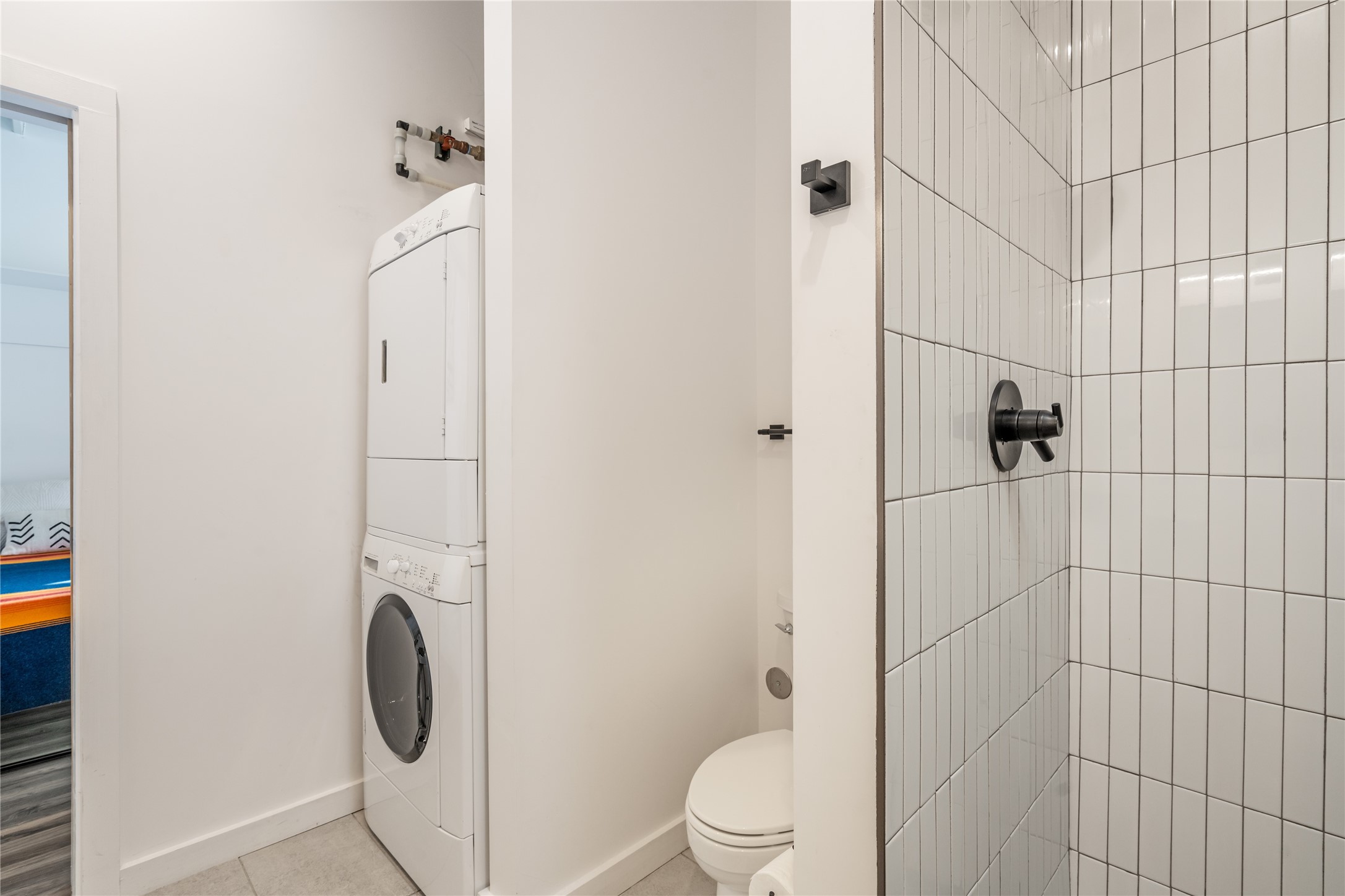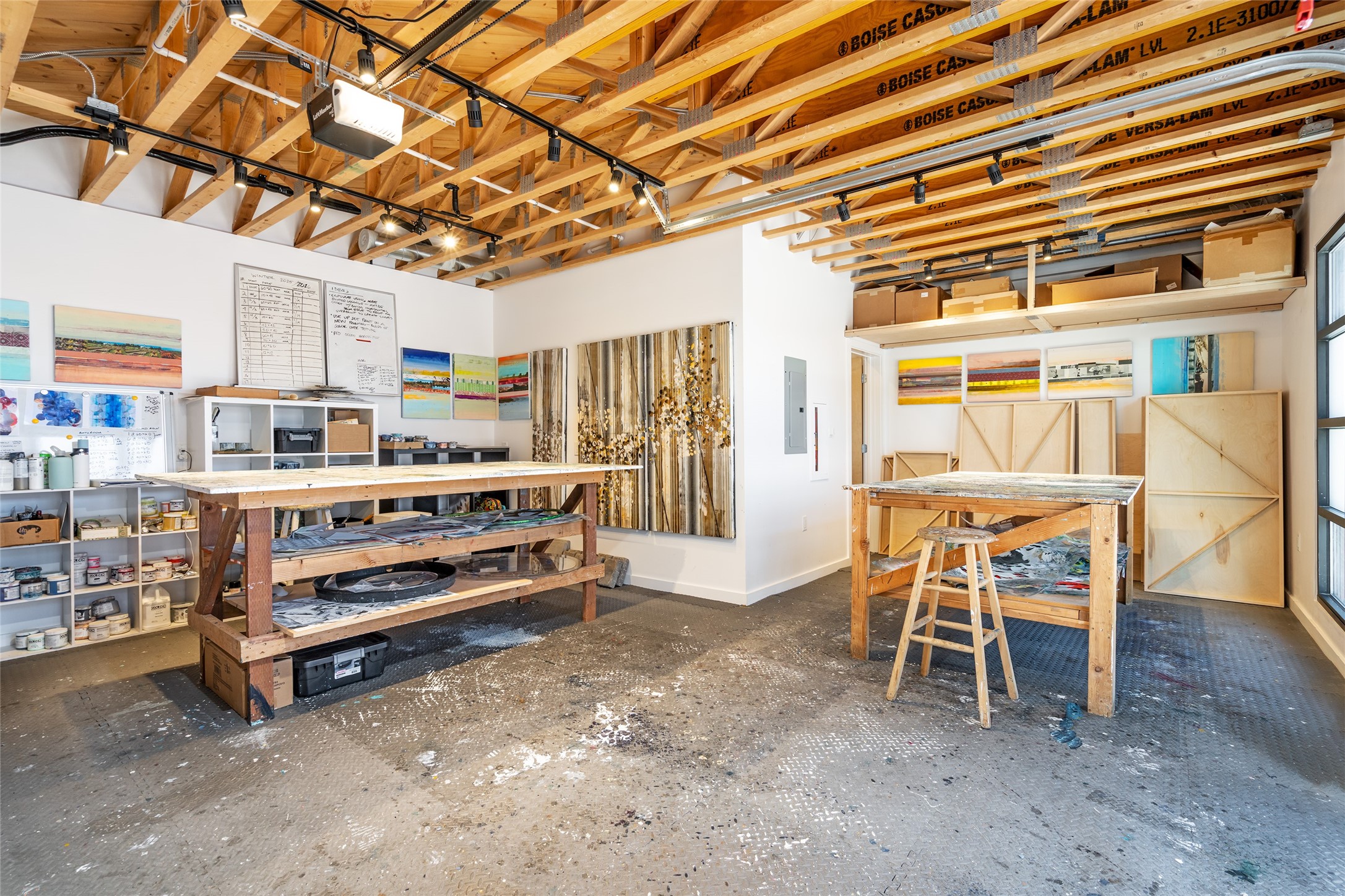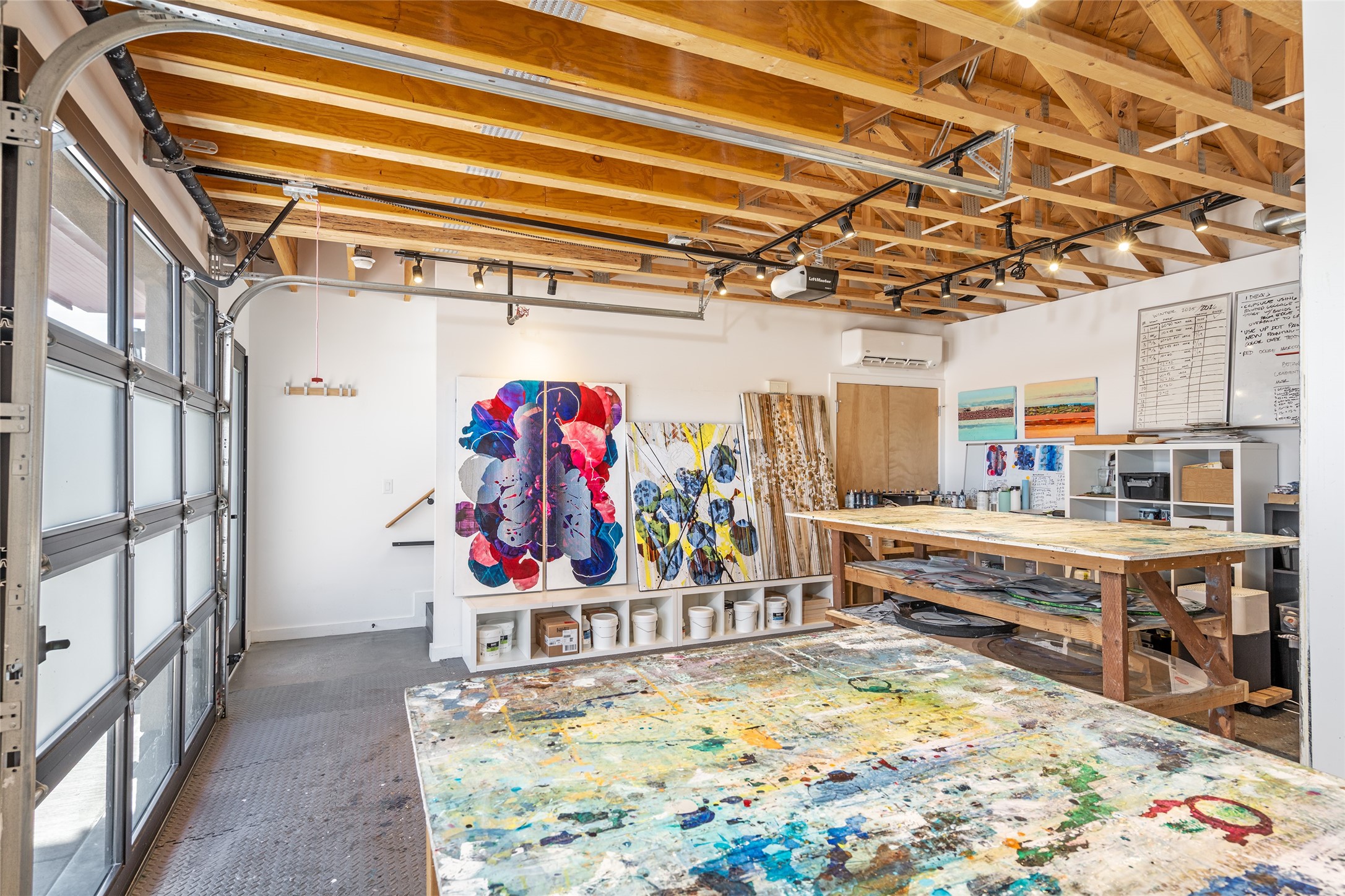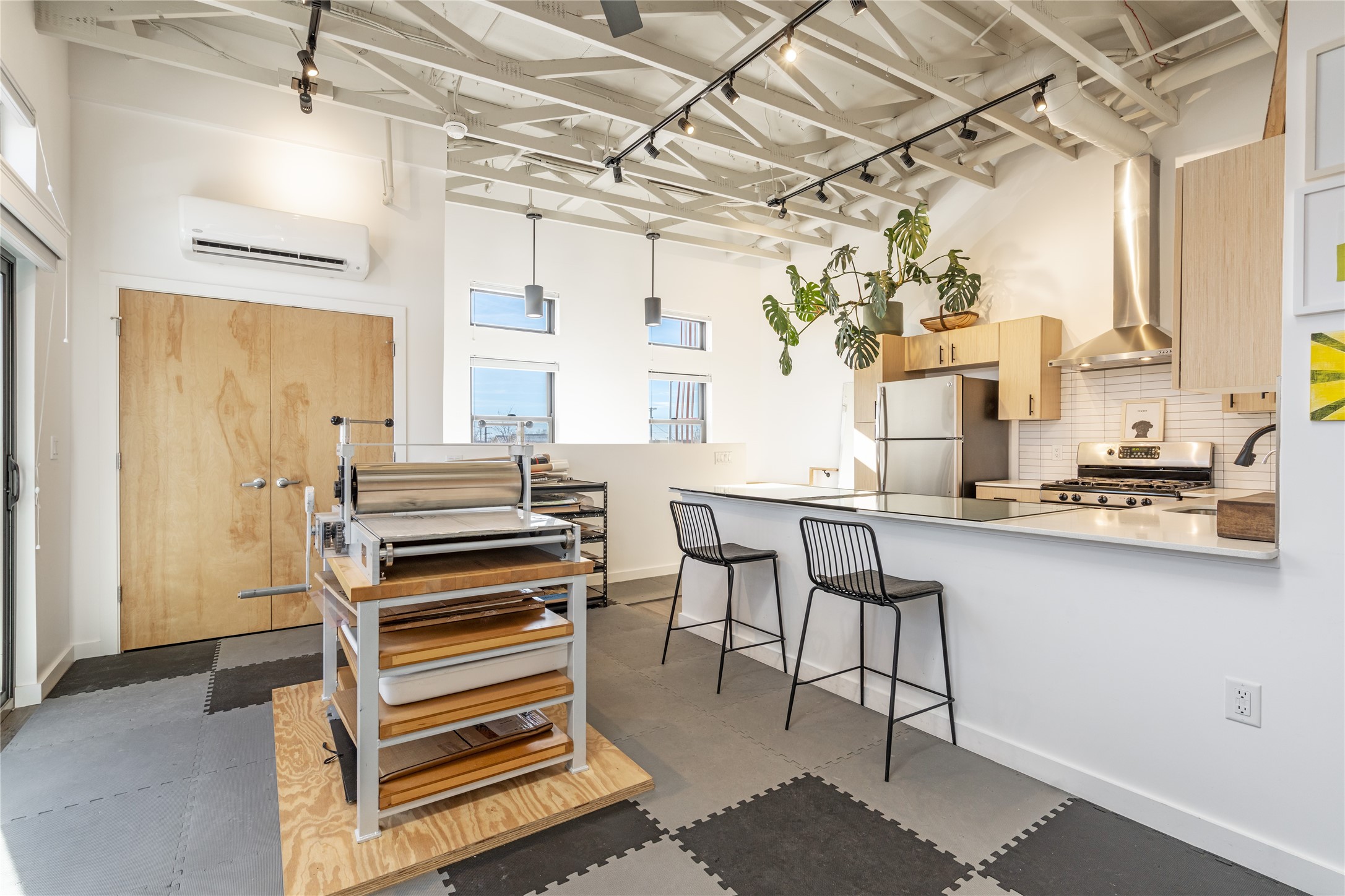 Corner unit with a wraparound balcony and mountain views in central Santa Fe, built in 2022 and lightly used, offering modern loft living and an ideal work-from-home setup. Approximately 1,126 square feet across two levels with an even split between floors, the east- and south-facing orientation fills the space with natural light throughout the day. Upstairs features an open studio-style living area, a luxury bathroom, and access to a private balcony to take in the mountain views. The kitchen is well-appointed with quartz countertops, subway tile backsplash, full-size appliances, and ample space for cooking. Downstairs showcases concrete floors, an ADA-compliant bathroom, large glass roll-up garage door, and useful storage closets, creating flexible space for work, studio, or showroom use. Both floors are equipped with mini-splits, blinds, ceiling fans, track lighting, and smooth drywall. Energy-efficient features include an on-demand water heater and two dedicated grid-tied solar panels. Washer and dryer hookups are in place (existing washer and dryer do not convey), and the Murphy bed does not convey. Hardwired for high-speed cable. HOA dues are $225 per month and include dumpster service, parking, landscaping, exterior building maintenance, and insurance, with an estimated $700 HOA sign-up fee.